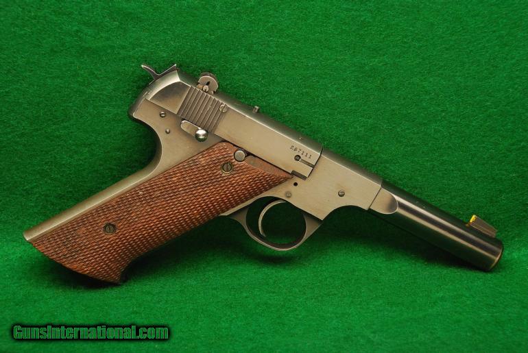 Description: Hi Standard H-D Military Pistol .22 LR Caliber 4 1/2" Barrel Condition: Excellent, 90%+. Some blue wear, most noticeable at muzzle. Wood shows some dings, etc. Bore bright and sharp, mechanically excellent. SOLD Curio/Relic: Yes |