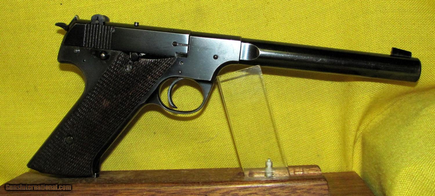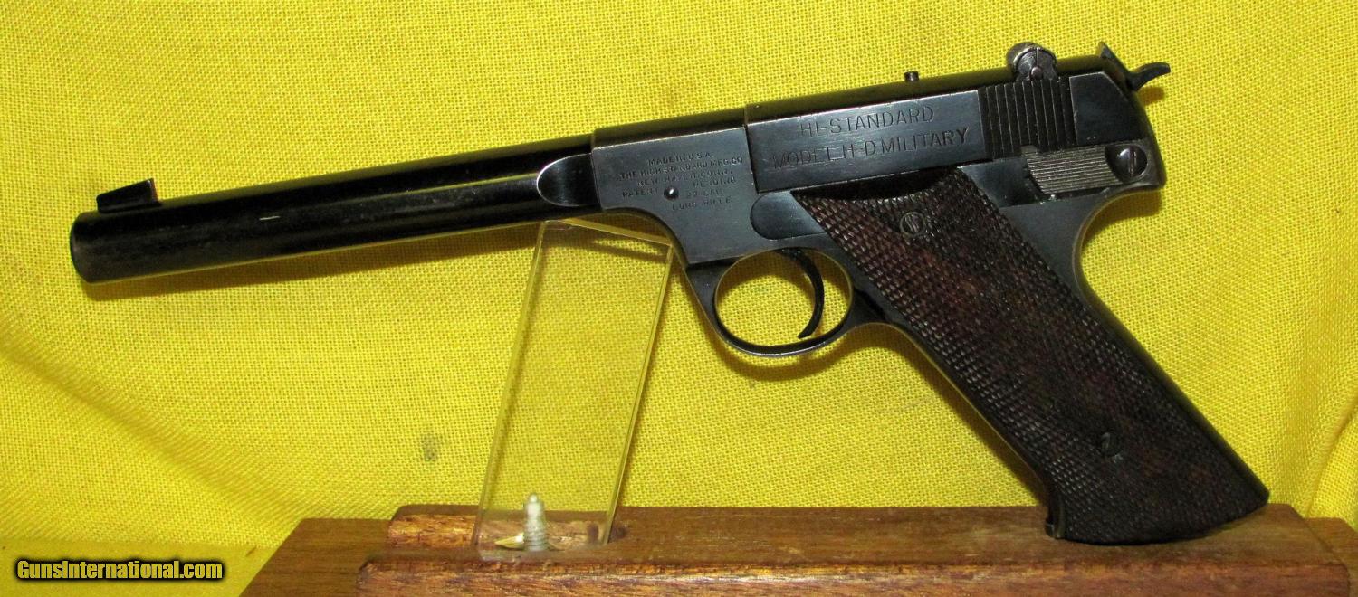 Description: HI-STANDARD model H-D MILITARY in .22 LR with 6 3/4" barrel. Color BLUE. HI-STANDARD MODEL H-D MILITARY AUTO PISTOL, BORE EXCELLENT, FACTORY TANGENT SIGHTS, 95% ORIGINAL BLUE WITH SOME THINNING AND BROWNING ON STRAPS, VERY GOOD CHECKERED WALNUT GRIPS WITH A FEW CRUSHED DIAMONDS, EXCELLENT FUNCTION. OUR NEW STOCK # D31088 Condition 93%. Serial number 192670. SOLD |