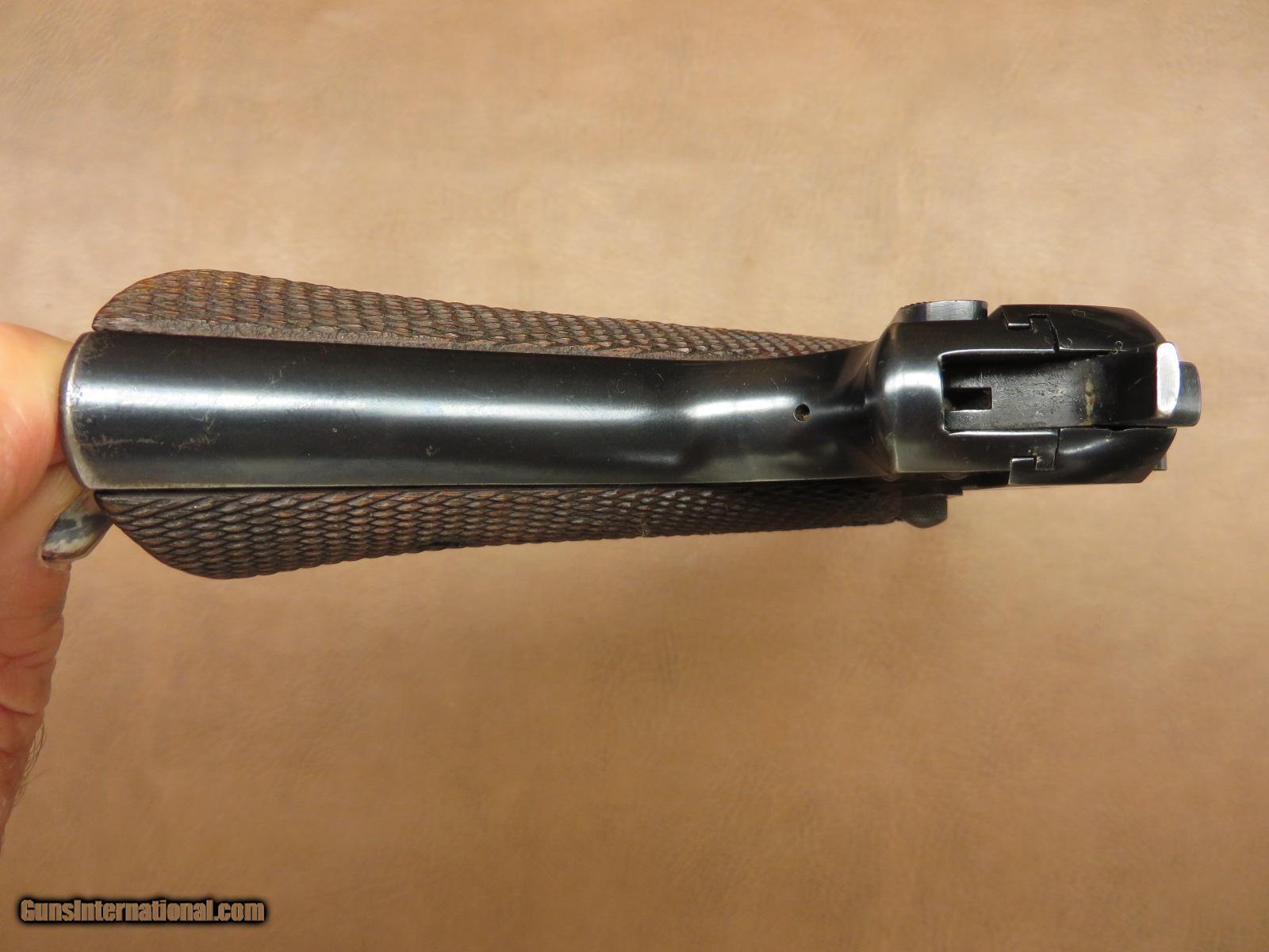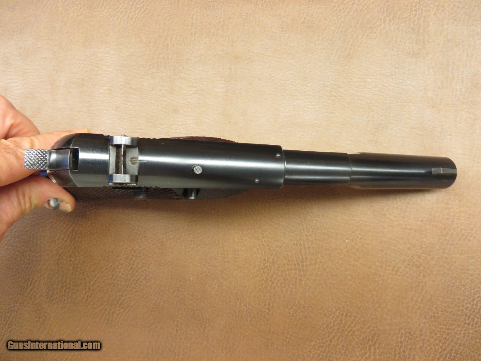 Description: .22 Long Rifle has 4 1/2 inch heavy barrel and original sights. Serial number 188xxx. Nice checkered walnut grips and original two tone magazine. All in 95%+ condition. SOLD |