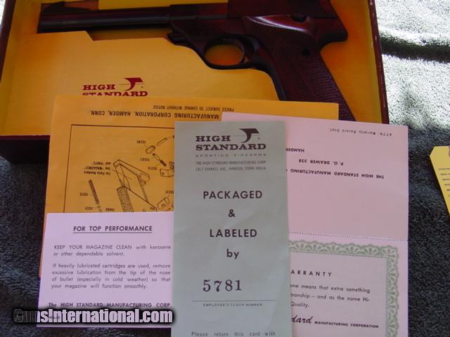 Description: SALE pending ,thanks Earl Reduced to $750.00 Thanks Hi Standard Model 106 Military Supermatic Tournament in original numbered to gun factory box with papers.Catalog number 9233 (1962-1968) S/N 1853410 Very high condition (98+%-99%) 6 3/4" barrel-excelllent bore,adjustable rear sight,factory stippled grip straps,red magazine.Has all factory paper work and excellent condition (with exception of small tear on one corner) factory numbered to gun box. A nice one to add to collection or shoot and enjoy quality you don't find today at a great price. Local New Hampshire Buyer can view/purchase gun in person at Investment Arms business premise in New Hampshire Country Store Rt 16 Chocorua NH. We also Buy and Consign Guns. SAFETY NOTICE: Buyer is solely responsible for determining that a used gun is safe to shoot.The firearms offered has been given a visual inspection for collection purpose only. It is a requirement that any used firearm be inspected by a qualified gunsmith before firing. By purchasing the firearm, the buyer agrees to hold seller harmless against damages, injury, or death caused by defective merchandise. Reduced to $750.00plus shipping and insurance to your FFL-should be about $25 USPS Priority FFL to FFL. 3 day non firing inspection-shipping/insurance not refundable. Buyer to provide signed FFL with check (Bank-USPS)or email Not for sale to buyers states were prohibited. SOLD |