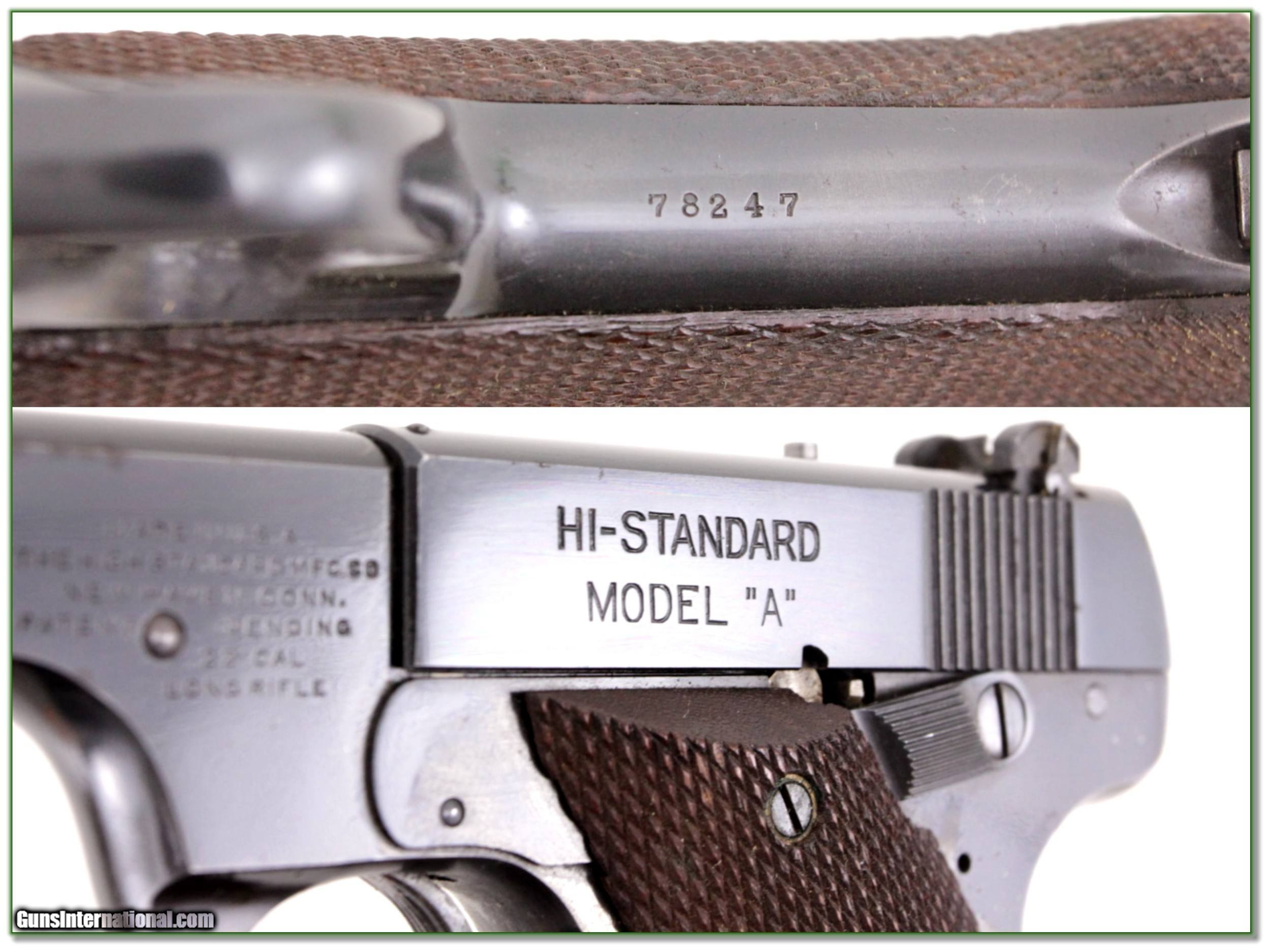 Description: This is an excellent condition Hi-Standard Model A. It has a 7in barrel and comes as seen in original box with papers. The box top sides are missing. It will make a fine addition to your collection. I am selling this one on consignment and as such lay-a-way can’t be used. It does of course have the standard 3-day inspection. Shipping with insurance is $39. Please email me with any questions or larger pictures. (Consign your quality firearms with Shooting Investments for only 12%! Let me know if you have any you would like to sell!) 19-0947 Payment: Payment is by Money Order, Cashiers Check or Personal Check. I can now also accept Credit Cards (MasterCard, Visa, Discover & American Express) with a 3% convenience fee. Shipping: The shipping charge will be listed in each description. It is $39 for most firearms. Some heavy guns or those insured for over $2000 will be higher. Shipments to Alaska and Hawaii are higher because air shipment is required. Most firearms are shipped on Tuesday and Thursday and usually in 5 days of receipt of payment. We package all shipments carefully and insure them. Optics are shipped Priority Mail and most other non-firearm shipments are shipped First Class. Returns: Our return policy is simple. If for any reason you are not pleased with your purchase, you may return your item for a full refund of purchase price. Ammunition cannot be returned. It is important to us that you are happy. Guns cannot be fired or dissembled before returning them and they must be returned in the same condition as received. Notification of a return must occur with-in 3 days of receipt at your dealer. Shipping, convenience and dealer fees are not refundable and are the responsibility of the buyer. Lay-a-way: If needed, we offer a 60 day lay-a-way option on most firearms. It is 1/3 now, 1/3 in 30 days and 1/3 in 60 days. Lay-a-way firearm sales are final and if not completed the first payment cannot be returned. Consigning your firearms with Shooting Investments: We will help you get top dollar for your firearms. While most local guns shops charge 20% or more, our fee is only 12% with a minimum of $75. At your local gun shop it might take months to sell. Selling on-line provides instant access to thousands of interested buyers. You won’t find any other on-line dealer willing to sell your firearms for only 12% or listing every gun on 3 separate s. Selling through an House typically costs the seller 15% and the buyer an addition 15% (so 30%) and you have to wait several months to sell and longer to receive funds. If properly priced, we will sell your firearms in a few weeks. Send us an email or give us a call and we’ll explain how easy it is for you to get top dollar. Trading: Trading for use is really just buying your gun to re-sell. If you have a gun you want to trade, please email a picture and we will let you know what we can give or it. You will always get more if we sell it for you on consignment. Help for California Buyers: We are happy to ship to California. It is the buyer’s responsibility to make sure any item you buy is legal in your state. We are also happy to help with your purchase of a firearm from someone other than us. If you see a gun you would like to buy but the seller can’t or won’t ship to California they can ship to use and we’ll then ship it to your California dealer. The cost for this service is only $30 + shipping. Let us know if we can help! SOLD |