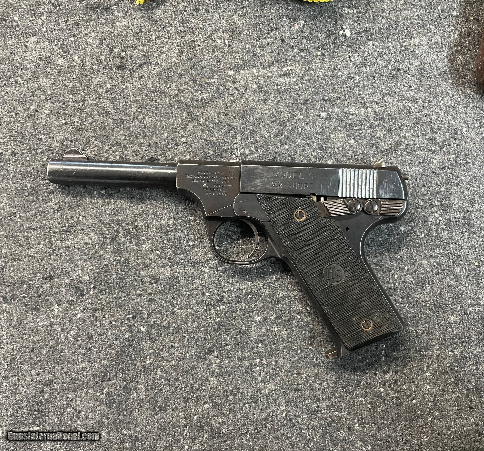 Description: Guns Listing ID: 373278 First produced in 1926, the Hi-Standard Model C is a semi automatic pistol chambered in .22 Short. Variants of the Hi-Standard .22 Caliber pistols became well known for their use by the Office of Strategic Services (OSS), the predecessor to the CIA. Condition: used in good condition. 85% original finish, some discoloration around grip panel with minor pitting and one significant scratch in the finish. Bore is in good condition and firearm is overall mechanically functional. SOLD Manufacturer: HI-STANDARD Model: Model C Caliber Info: .22 SHORT Condition: Used - Non-Certified Barrels: 4.5 BARREL Action: SEMI AUTOMATIC Weight: not specified |