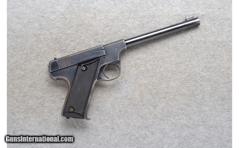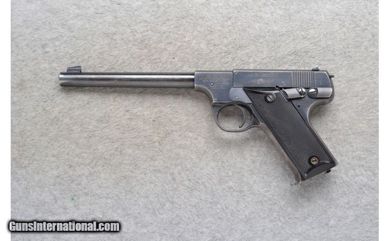 Description: This Hi-Standard Model "B" is a right hand semi-auto pistol in .22 Long Rifle Cal. It has a 4.75 inch barrel. A blade front and notch rear sight. The grip panels are a checkered hard black plastic. The trigger is grooved. .22 Long Rifle SOLD Chambers: Semi-Auto 10 round magazine. Metal Condition: "Good. Light handling marks, wear and minor freckling. Bore Condition: Very good. Barrels: 4.75 inch barrel. Triggers: Grooved. Weight: 34 oz. Sights: Blade front. Notch rear. Item Location: Richfield, WI |