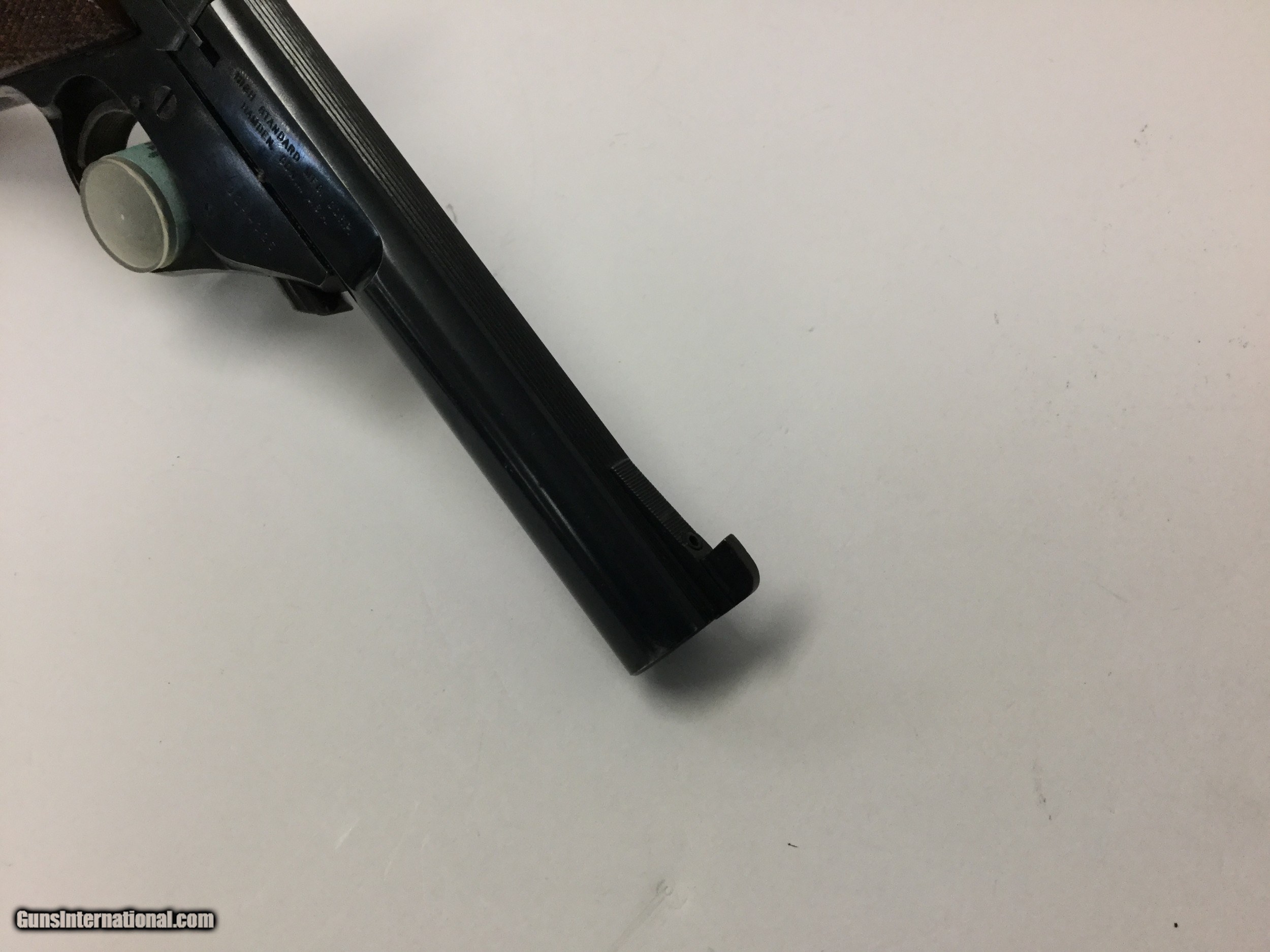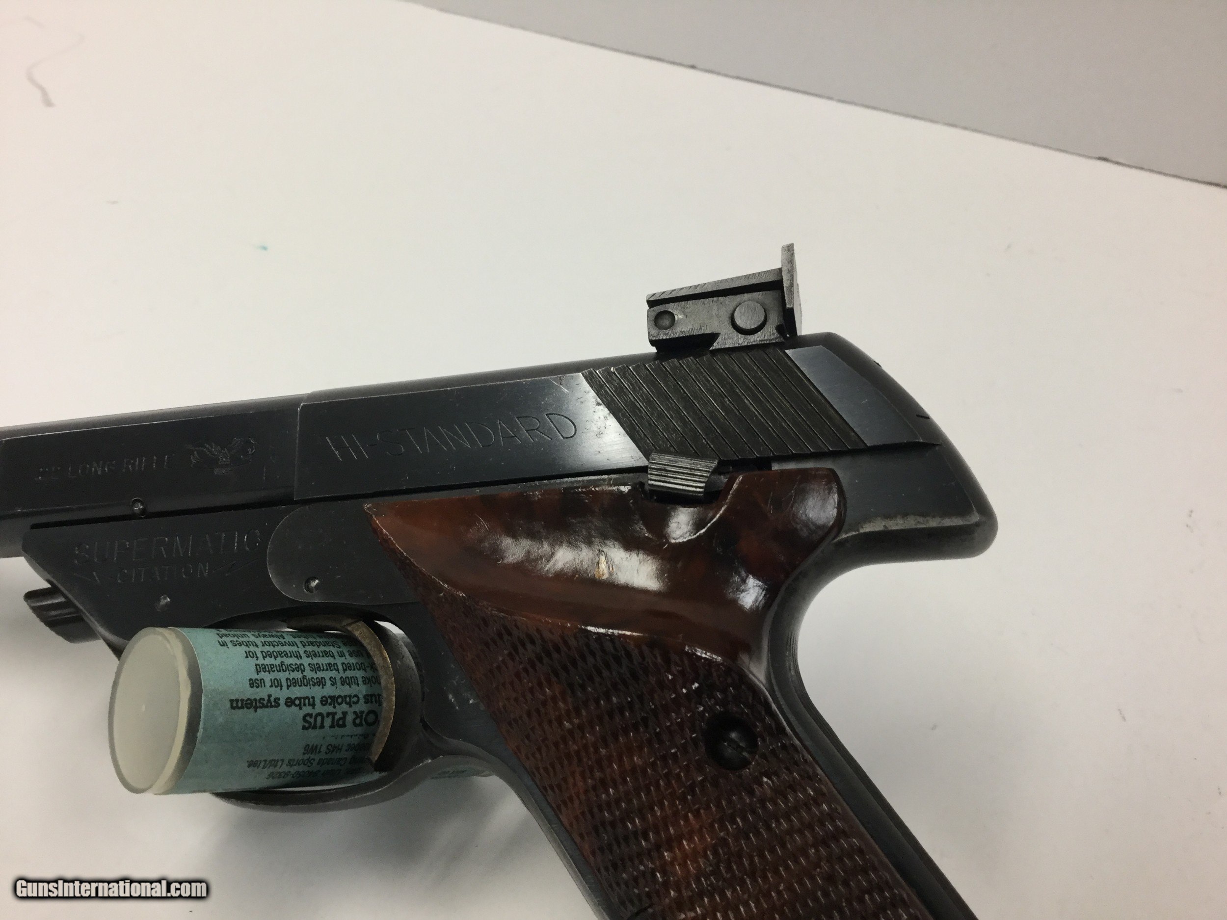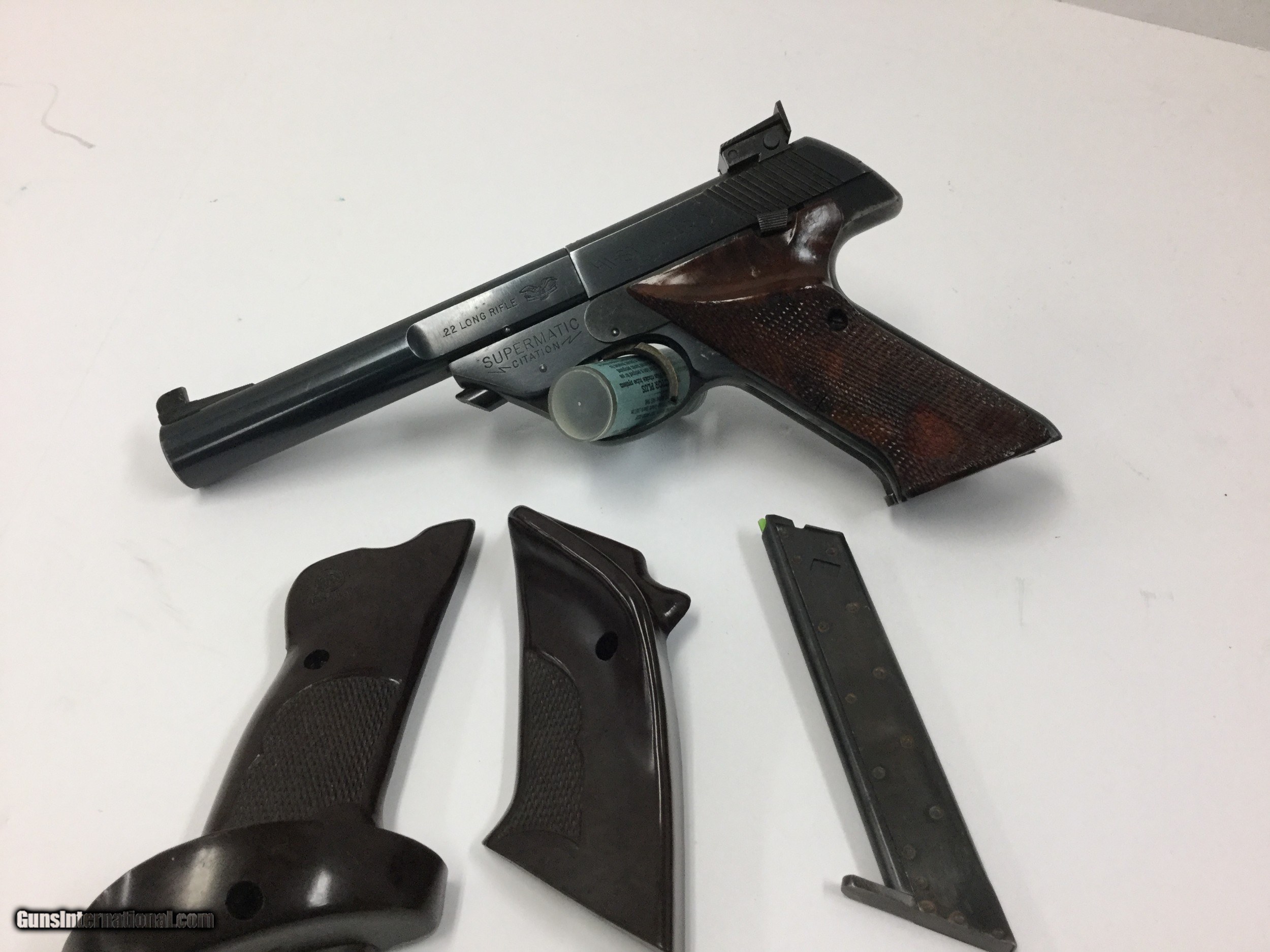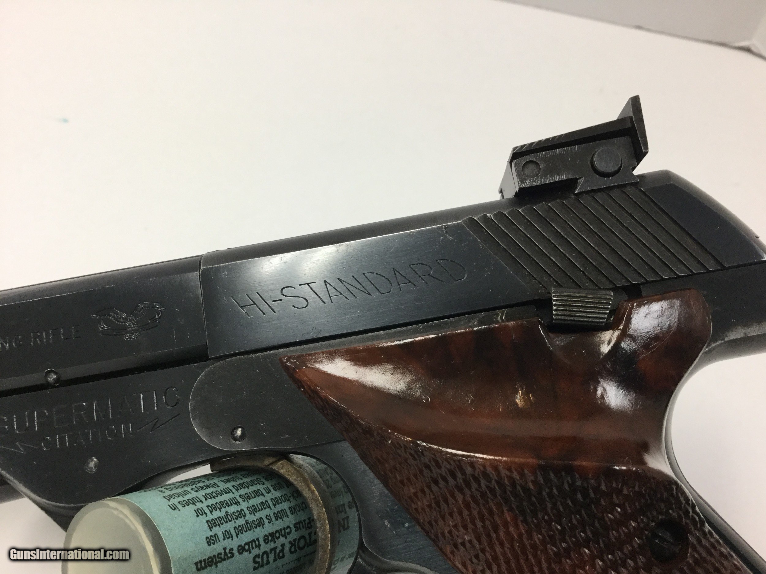 Description: Up for your consideration is a collectible and mint condition Hi-Standard Citation .22lr Target pistol. This citation model features a 5 1/2in heavy target barrel placing it between 1962 and 1966 for DOM. Condition is excellent with only some minor wear near the muzzle and wear on the front and back straps. The gun also features an adjustable rear sight, as well as (2) magazines, and (2) sets of grips. With one being the factory set, and one being an aggressive target set. Bore is mint with shiny walls and deep grooves, typical of any .22lr target firearm. These guns are world renowned for their accuracy and collector following they have accumulated over the years, this is a great opportunity to own one without breaking the bank. Please take time to view all pictures and read the description prior to , as well as view our additional terms of sale. By purchasing this gun you are agreeing to comply by any and all of our store return and refund policies. SOLD Manufacturer: Hi-Standard Model: Supermatic Citation Caliber Info: .22lr Condition: EX Metal Condition: EX Wood Condition: EX Bore Condition: EX Barrels: 5 1/2 in Barrel Type: Heavy Manufacture Date: 1960's Item Location: Rhode Island |