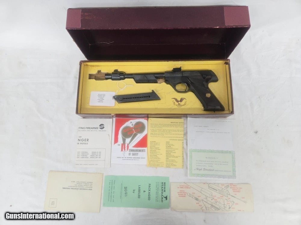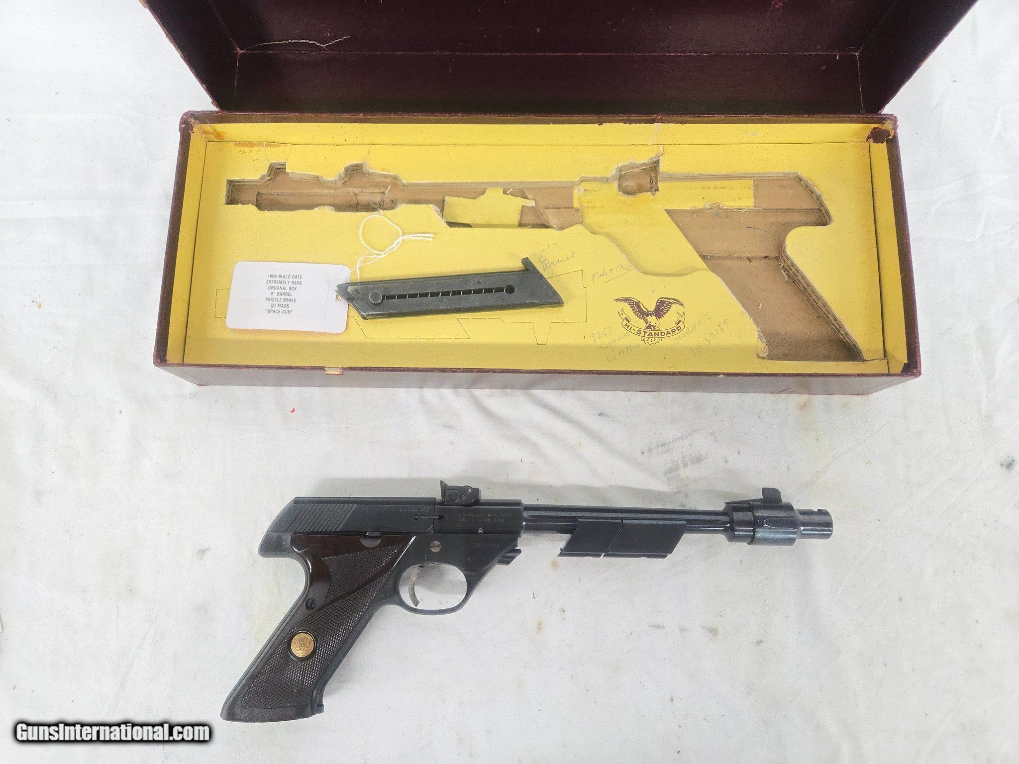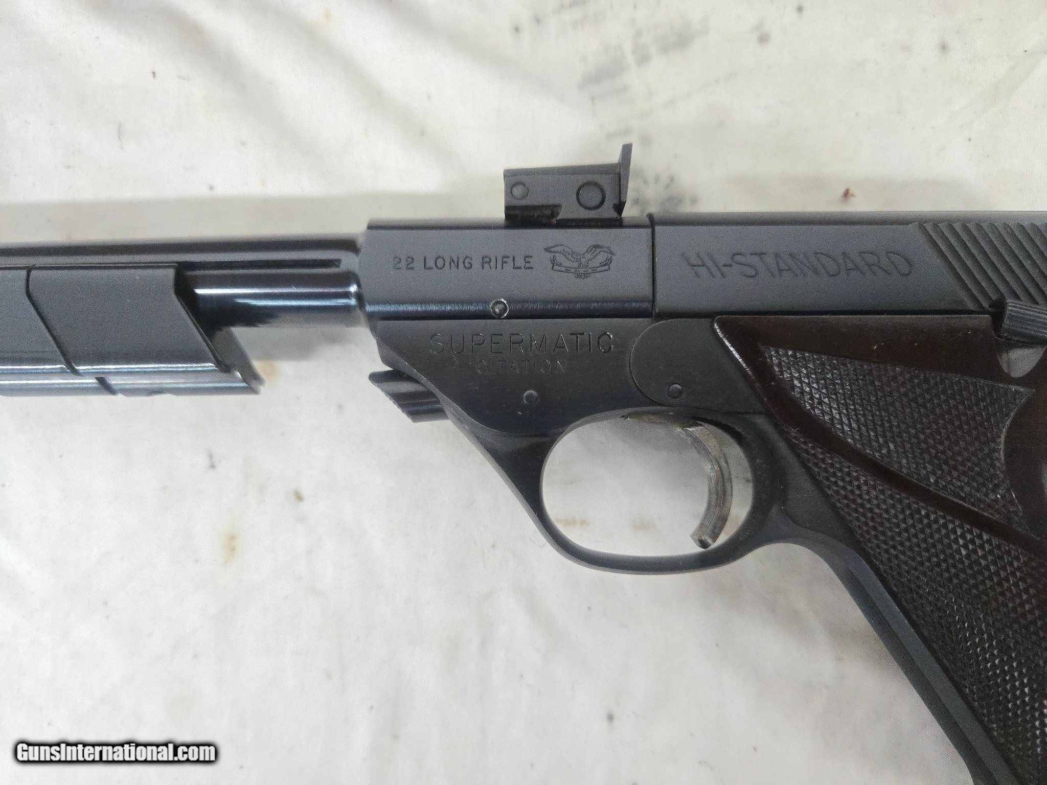 Description: Guns Listing ID: 493510 Hi-Standard Supermatic Citation Model 102 .22LR Semi-Auto Pistol 8in Barrel w/Muzzle Brake, Barrel Weights, Original Box and Manuals, 2 Mags RARE Hi-Standard Supermatic Citation Model 102 .22LR Semi-Automatic Pistol 8in Barrel w/Muzzle Brake Barrel weights on barrel (from factory) (2) Magazines Original box and manuals included Like new condition. Looks like it was maybe fired a couple times. Extremely rare and highly collectable version. 1959 build date according to serial number Space gun SOLD Manufacturer: HI-STANDARD Model: Supermatic Citation Model 102 w/Original Box, Manuals Muzzle Brake, Barrel Weights 1959 RARE Caliber Info: .22 LR Condition: Used - Non-Certified Barrels: 8 Finish: 1 |