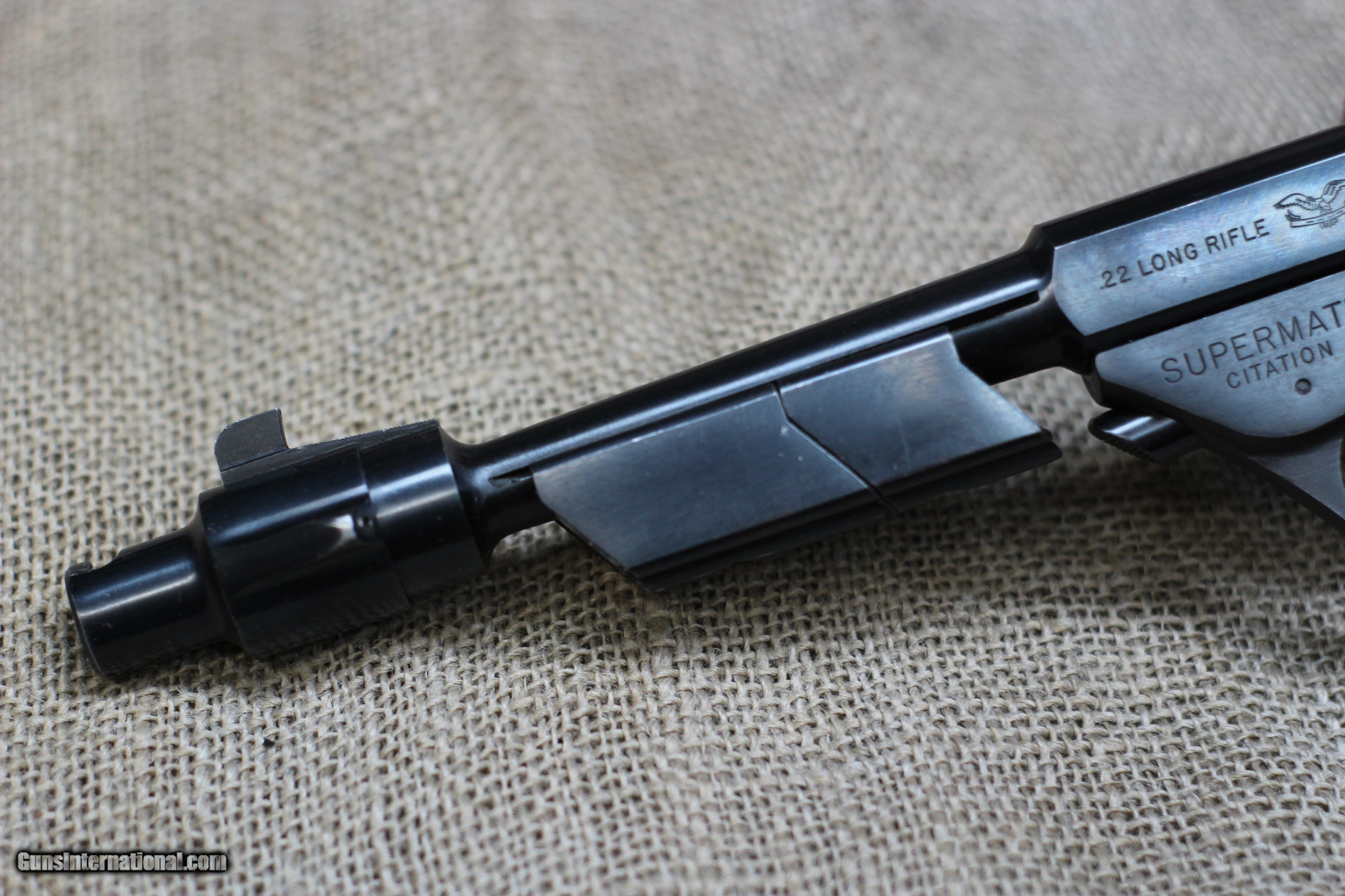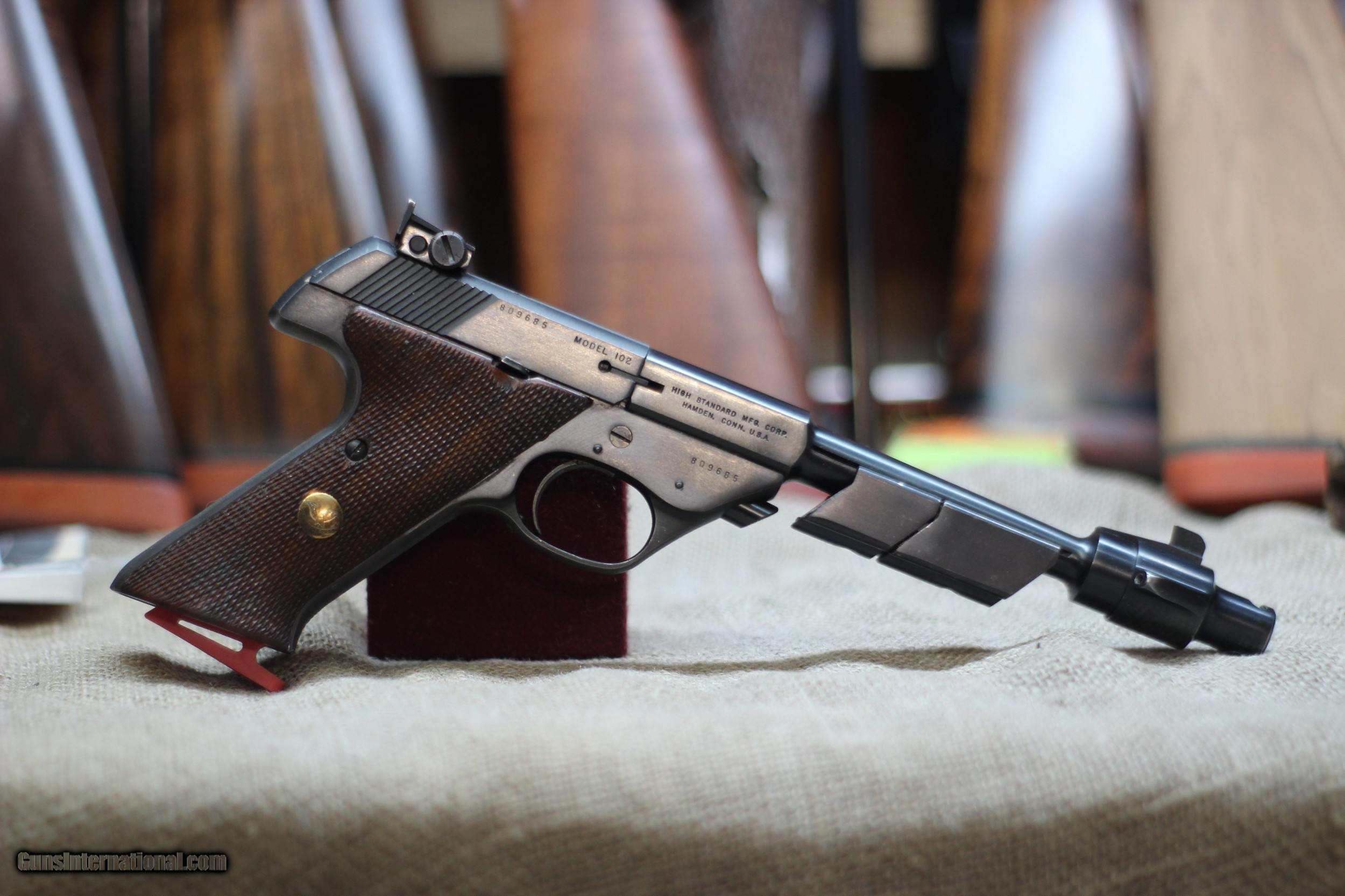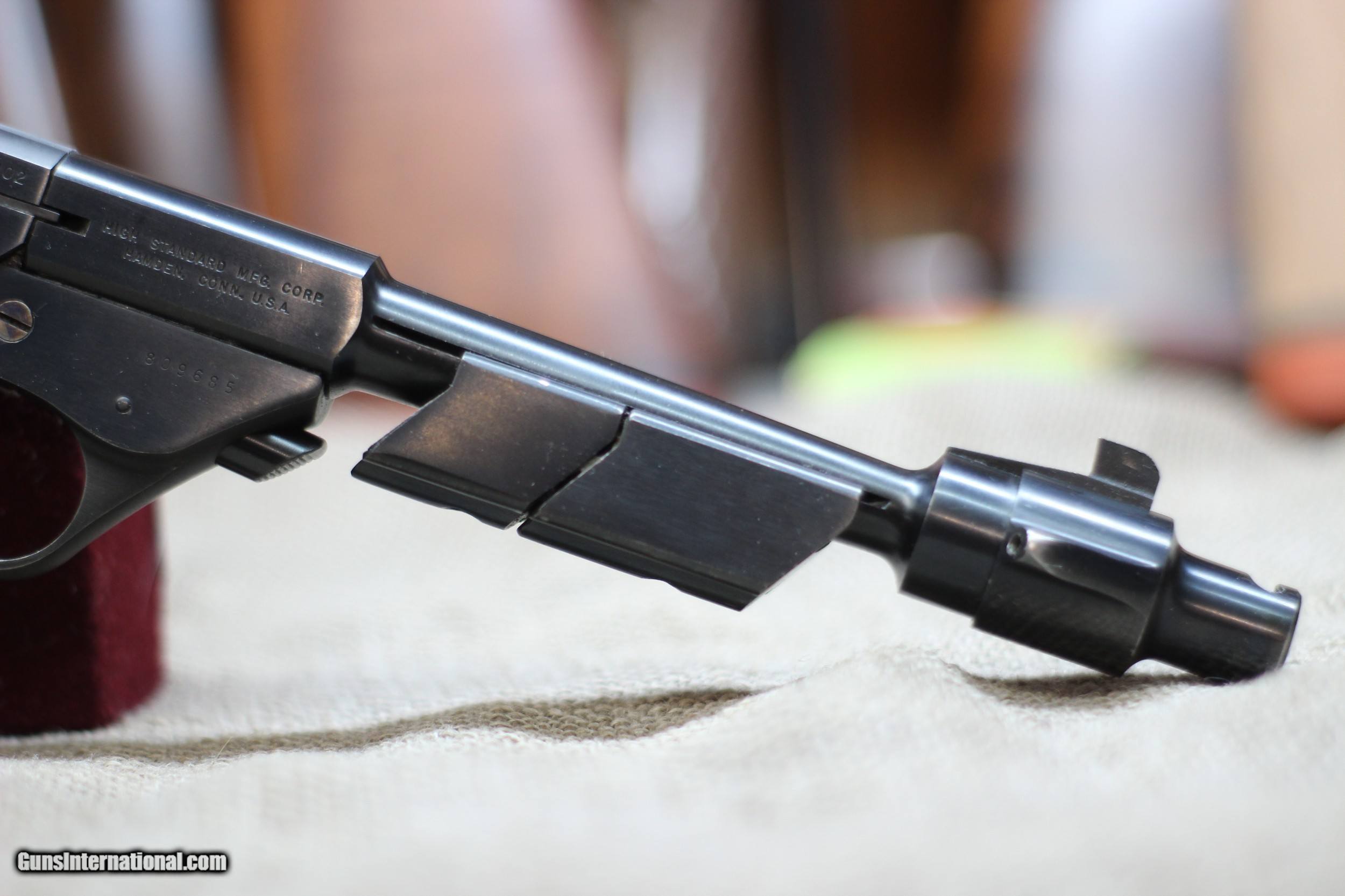 Description: 6 ¾” tapered fluted barrel with weights & muzzle brake Hamden manufacture. All original gun with Hi-Standard, correct grips, & extra barrel weights in box. 98% blue Excellent bore Serial #: 809xxx Price: $895 Shipping: $40 We accept cash, check or money order. All payments take 5 days to clear. SOLD |