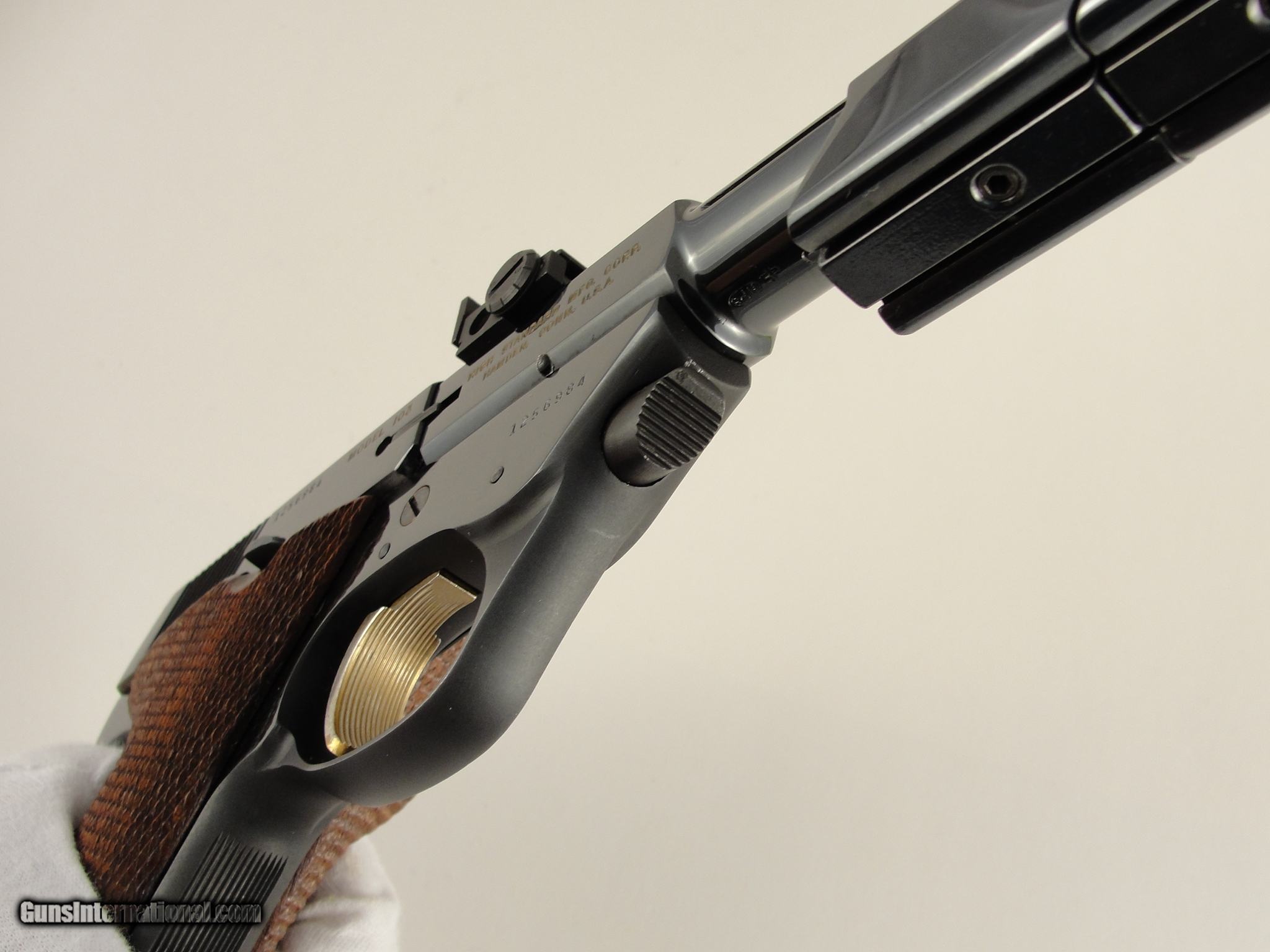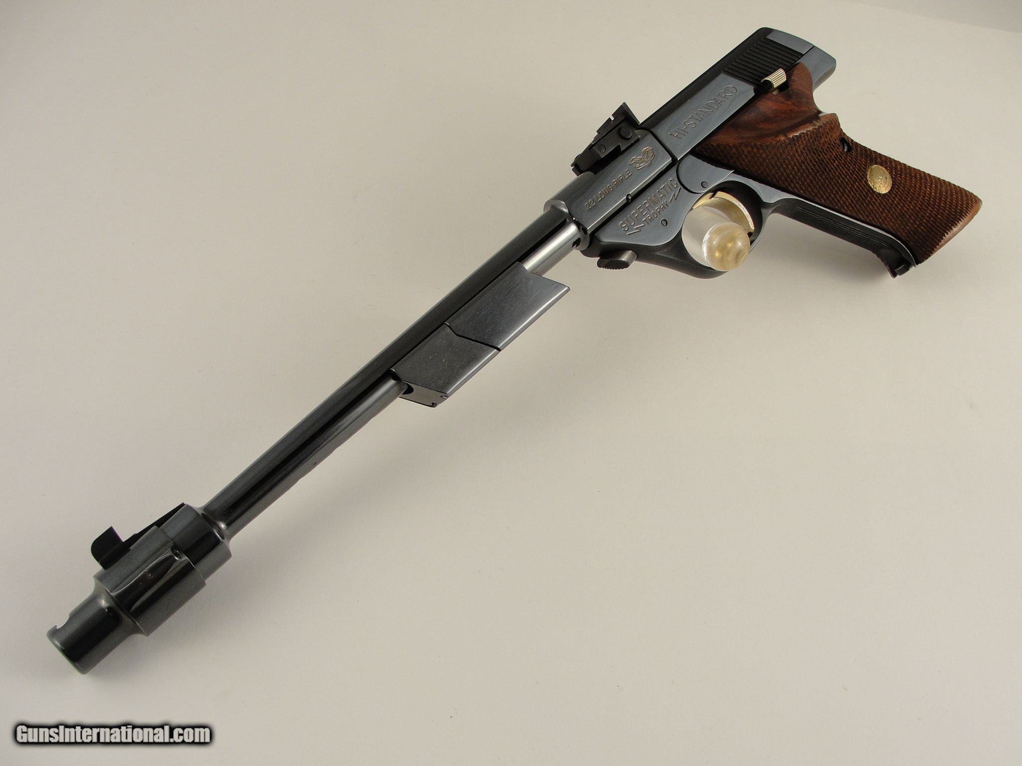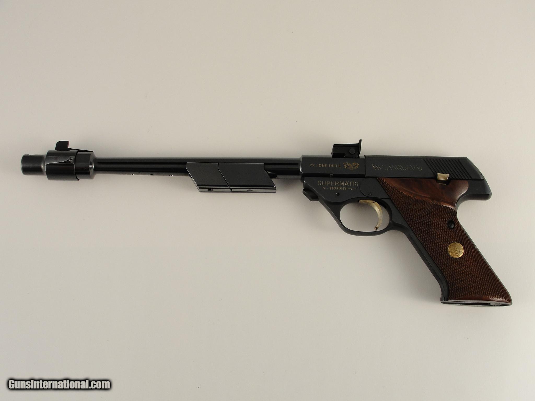 Description: SOLD PENDING FUNDS - Here's a neat pistol for the Hi-Standard collector or anyone who appreciates innovative & unusual firearms. This is a Hi-Standard Supermatic Trophy. It is in the High Gloss polish of the Trophy Line as opposed to the lesser polished Citation. As such, it has the gold trigger, gold safety button and gold inlaid lettering. Introduced as part of the 103 Series pistols, the Trophy was the highest grade target pistol destined to become one of the most important pistols in the Hi-Standard line. The rakish lines of the 103 Series guns along with some of the very unusual barrel profiles were unconventional in their day and remain so today. This pistol is particularly interesting because it comes with the very scarce 10-inch "Space Gun" tapered barrel. This unusual, odd-looking barrel features a tapered round/thin profile with a large diameter muzzle atop which sat the front sight. This fat muzzle section acted as a vibration damper and also had slots which served as anchor points for a detachable muzzle brake. The length of the barrel was also grooved for the attachment of barrel weights, both of which are included. The rear sight was mounted on the rear of the barrel, above the chamber. Pistols shipped with the standard shorter barrels had the rear sight mounted in a dovetail on the slide. Since this pistol has no slide dovetail it is safe to assume it shipped with the long space gun barrel. The frame and slide have matching serial numbers. Overall condition is excellent with some normal collector type, and light usage wear. It wears the optional checkered wood grips and they are in excellent condition, free of chips or cracks. The mechanics appear to be in perfect working order and the bore is mirror bright with sharp rifling. It comes with one factory 10-shot magazine. According to the serial number, this pistol was produced in 1962. It shows slight wear - Please view the photos here for the purpose of evaluating the condition for yourself. This item qualifies as a C&R. No International or California sales. Shipping & insurance by FedEx is $45 to eligible lower 47 states. Buyer is responsible for knowing their own local and state laws and whether or not you are prohibited from taking possession of, or owning this firearm. By purchasing, you are attesting to being of at least 21 years of age. ***The purchaser assumes all risks and should have a qualified Gunsmith evaluate the firearm before they shoot it. *** Payment must be by bank certified (cashiers) check or Postal Money Order. Shipping to AK or HI will have additional costs for which buyer is responsible. I will need a copy of an FFL dealer license to ship the gun. There is a 3 day, no-shoot, no disassembly inspection period and the buyer is responsible for cost of shipping both ways if returned. If your FFL dealer will not accept shipment from an individual, I will need an additional $40 to ship through my FFL. SOLD Curio/Relic: Yes Manufacturer: Hi-Standard Model: Supermatic Trophy Model 103 Caliber Info: .22 LR Barrels: 10 |