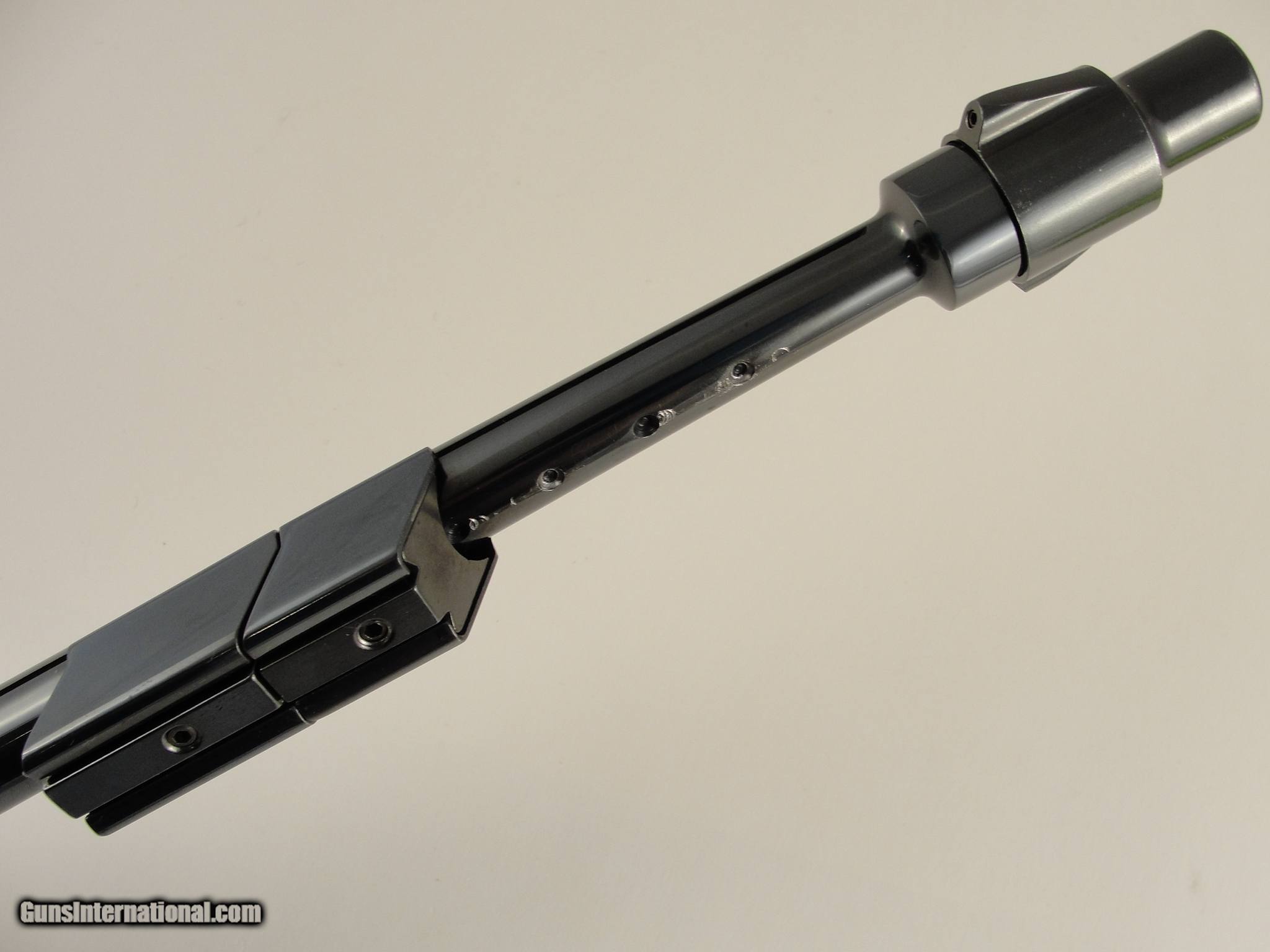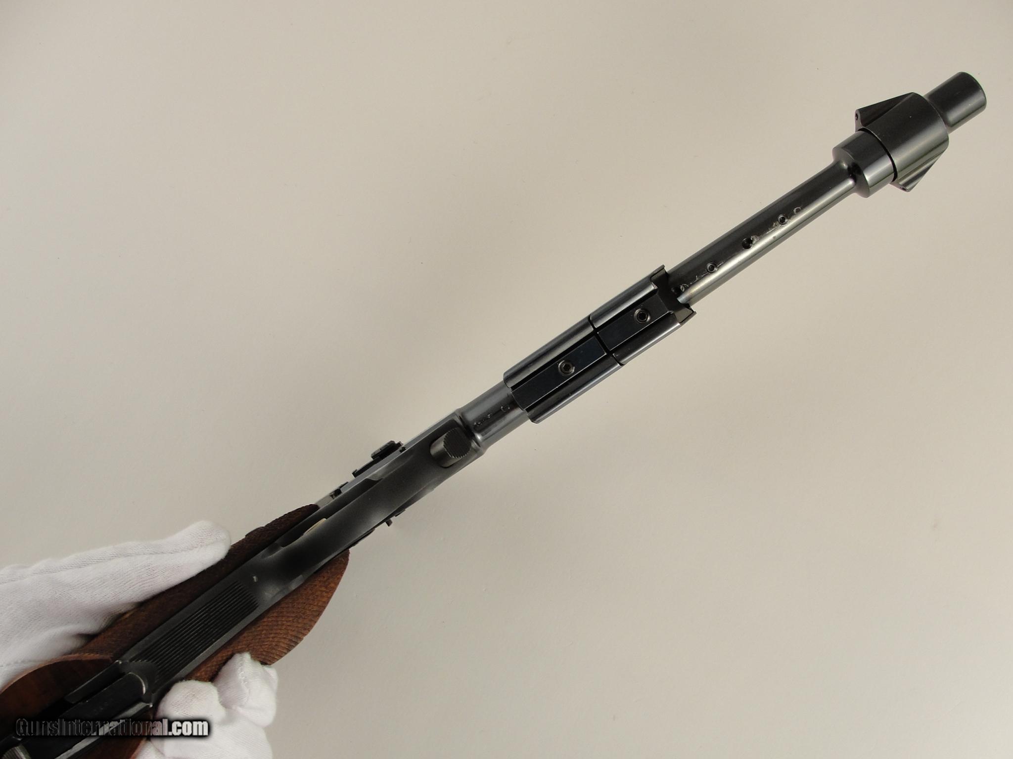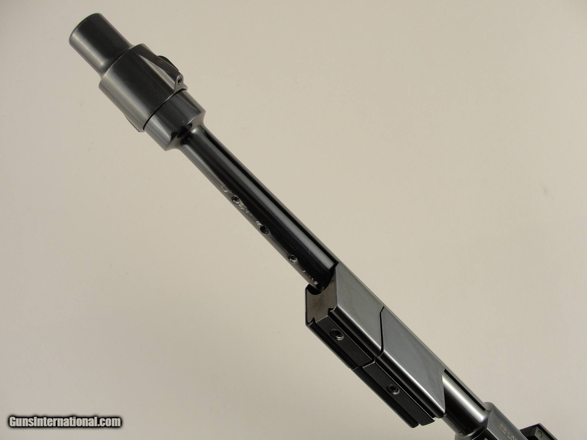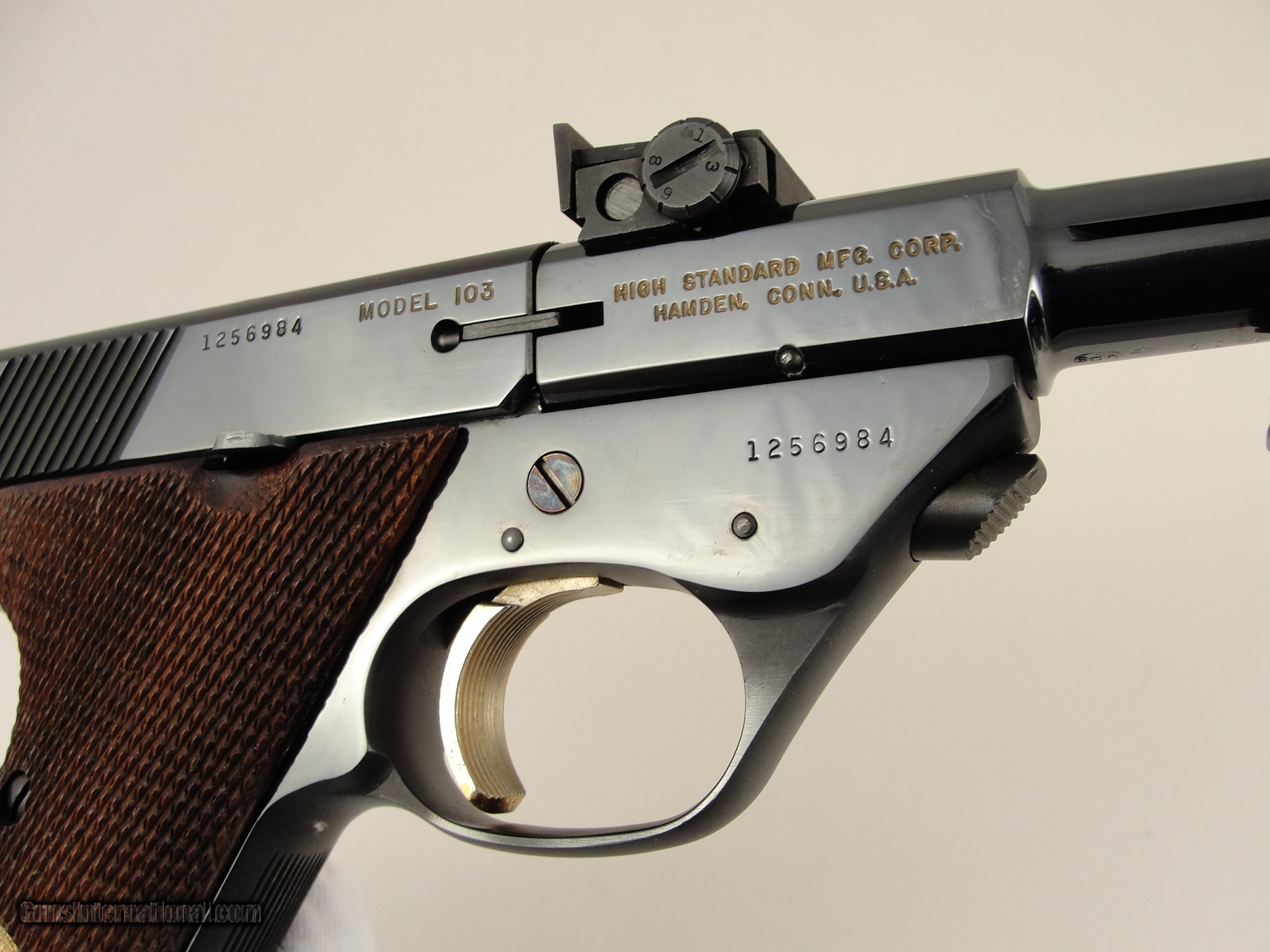 Description: SOLD PENDING FUNDS - Here's a neat pistol for the Hi-Standard collector or anyone who appreciates innovative & unusual firearms. This is a Hi-Standard Supermatic Trophy. It is in the High Gloss polish of the Trophy Line as opposed to the lesser polished Citation. As such, it has the gold trigger, gold safety button and gold inlaid lettering. Introduced as part of the 103 Series pistols, the Trophy was the highest grade target pistol destined to become one of the most important pistols in the Hi-Standard line. The rakish lines of the 103 Series guns along with some of the very unusual barrel profiles were unconventional in their day and remain so today. This pistol is particularly interesting because it comes with the very scarce 10-inch "Space Gun" tapered barrel. This unusual, odd-looking barrel features a tapered round/thin profile with a large diameter muzzle atop which sat the front sight. This fat muzzle section acted as a vibration damper and also had slots which served as anchor points for a detachable muzzle brake. The length of the barrel was also grooved for the attachment of barrel weights, both of which are included. The rear sight was mounted on the rear of the barrel, above the chamber. Pistols shipped with the standard shorter barrels had the rear sight mounted in a dovetail on the slide. Since this pistol has no slide dovetail it is safe to assume it shipped with the long space gun barrel. The frame and slide have matching serial numbers. Overall condition is excellent with some normal collector type, and light usage wear. It wears the optional checkered wood grips and they are in excellent condition, free of chips or cracks. The mechanics appear to be in perfect working order and the bore is mirror bright with sharp rifling. It comes with one factory 10-shot magazine. According to the serial number, this pistol was produced in 1962. It shows slight wear - Please view the photos here for the purpose of evaluating the condition for yourself. This item qualifies as a C&R. No International or California sales. Shipping & insurance by FedEx is $45 to eligible lower 47 states. Buyer is responsible for knowing their own local and state laws and whether or not you are prohibited from taking possession of, or owning this firearm. By purchasing, you are attesting to being of at least 21 years of age. ***The purchaser assumes all risks and should have a qualified Gunsmith evaluate the firearm before they shoot it. *** Payment must be by bank certified (cashiers) check or Postal Money Order. Shipping to AK or HI will have additional costs for which buyer is responsible. I will need a copy of an FFL dealer license to ship the gun. There is a 3 day, no-shoot, no disassembly inspection period and the buyer is responsible for cost of shipping both ways if returned. If your FFL dealer will not accept shipment from an individual, I will need an additional $40 to ship through my FFL. SOLD Curio/Relic: Yes Manufacturer: Hi-Standard Model: Supermatic Trophy Model 103 Caliber Info: .22 LR Barrels: 10 |