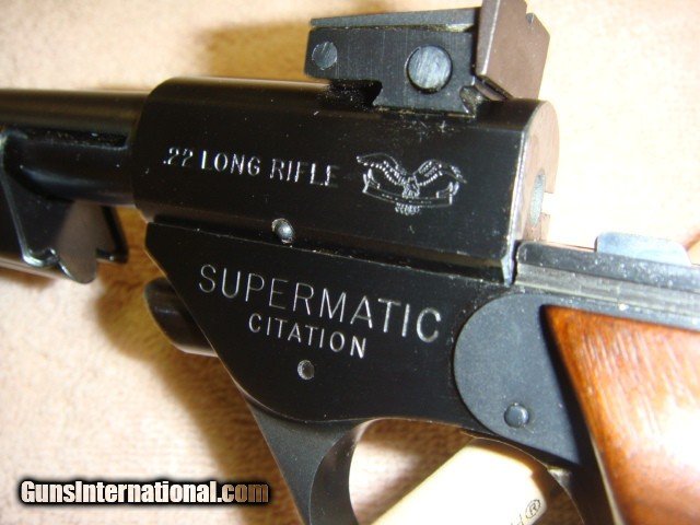 Description: Offered here is a pristine example of a Hi Standard Mod.102 Supermatic Citation, nicknamed "The Space Gun". This example is a Hamden, CT produced pistol made c.1959 (ser.# 1086XXX). This pistol was produced at the height of Hi Standard quality, and has been lauded by many as one of the most accurate 22 pistols ever made.The pictures don't do it full justice. I dislike the word mint (it has been fired), so I will only grade it 99+ plus overall. In the hand, the bluing is perfect, as are the period correct Herritt walnut grips.The flats, curves, and tangents are flawless. I think this quality of manufacturing is,sadly, gone forever. The pistol has absolutely no functionig or mechanical issues, and a perfect bore. No box or paperwork, but comes with both barrel weights, muzzle brake and their allen wrenches, and two magazines - one orig. HS, and oe aftermarket. This is a perfect addition to any early Hi Standard shooter / collector's collection. You will not be disappointed with this beauty. For more information or questions, contact Larry at 252-637-1294 or via email. Price is $850.00+$10.00 priority shipping to your FFL or C&R. SOLD Curio/Relic: Yes Manufacturer: HI Standard Model: Supermatic Citation Caliber Info: 22 Condition: 99%+ Metal Condition: perfect Wood Condition: perfect Bore Condition: perfect |