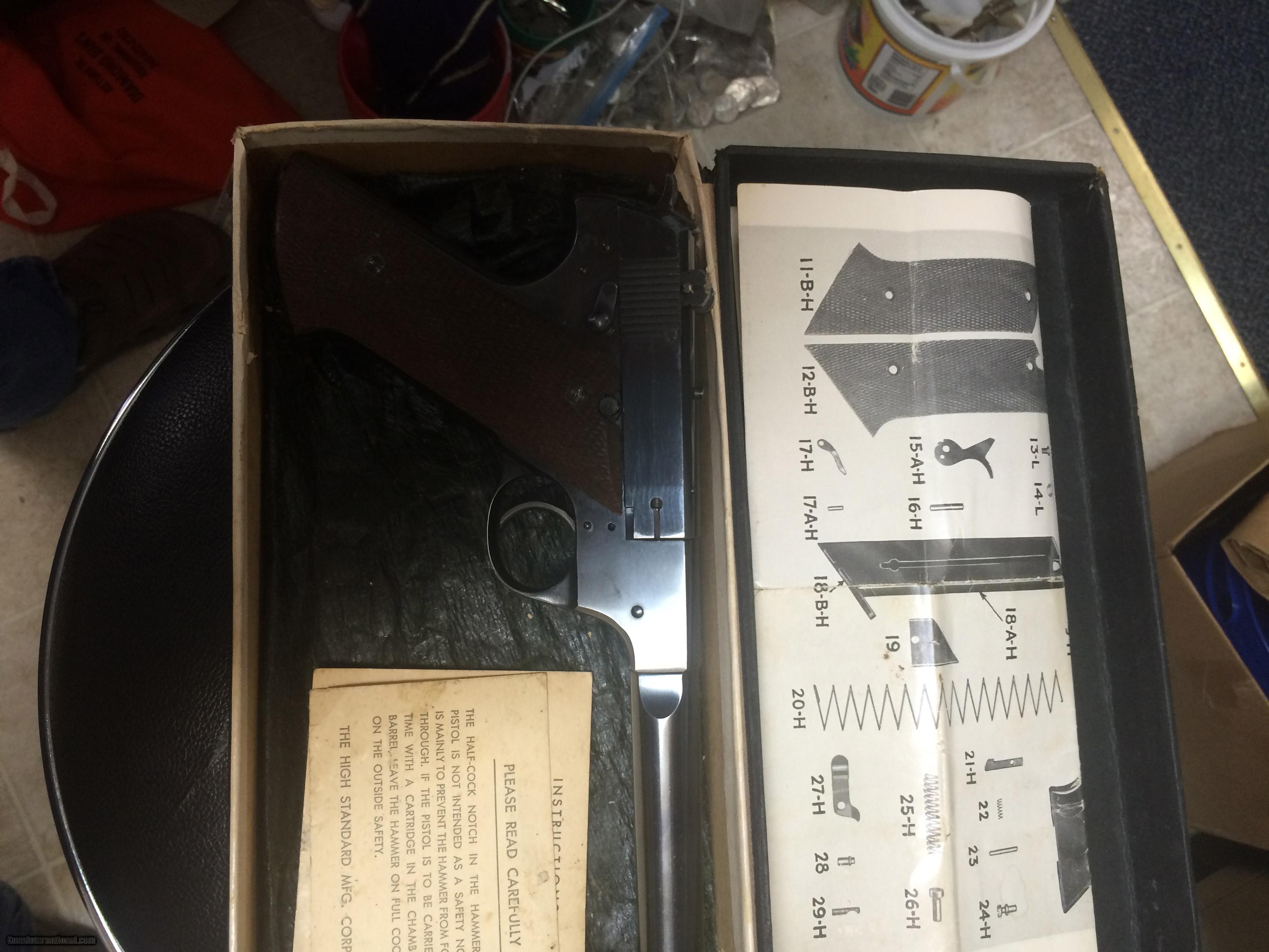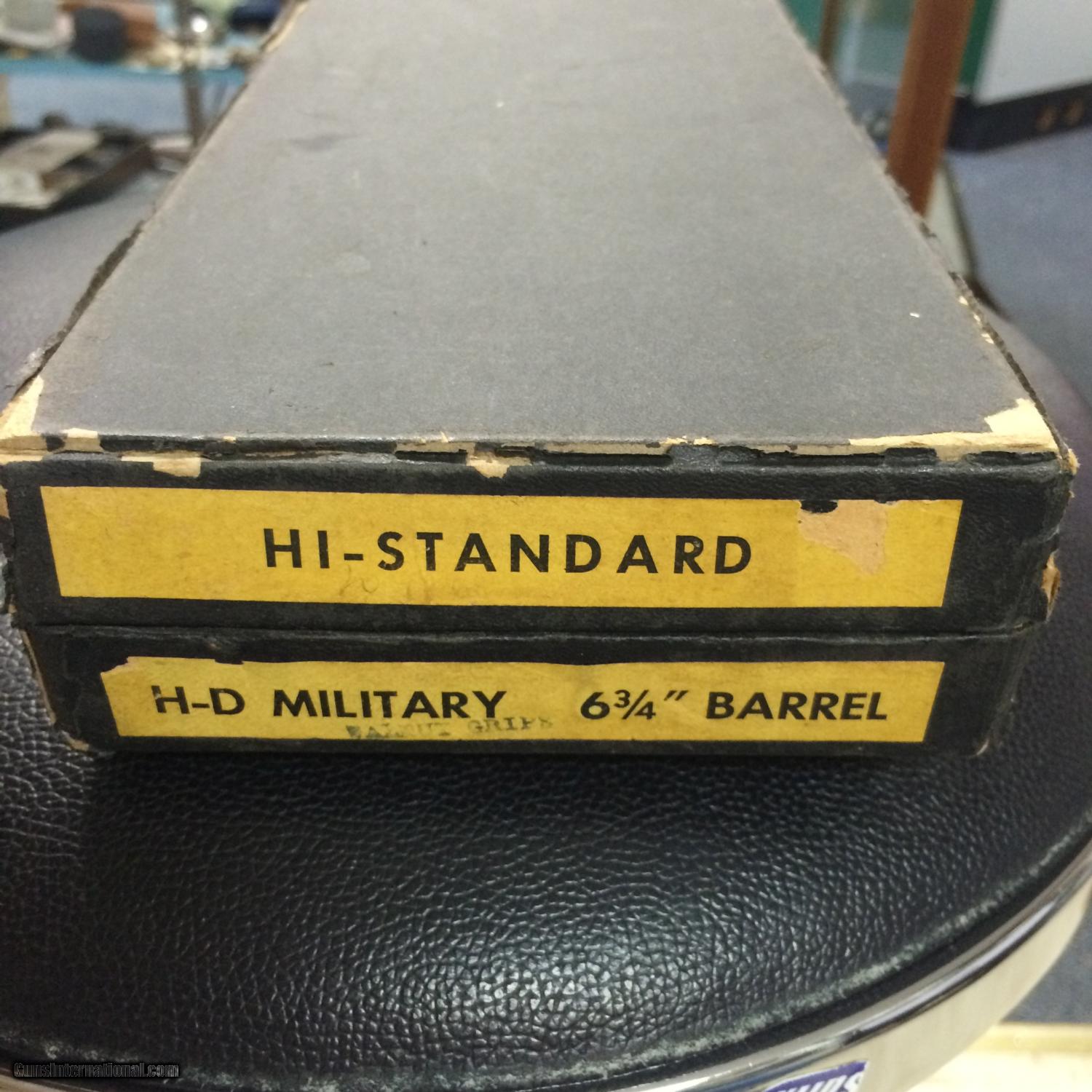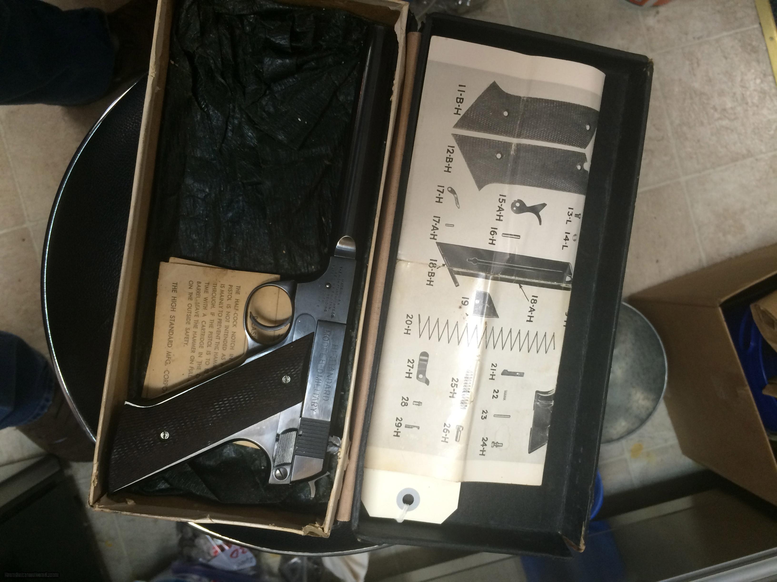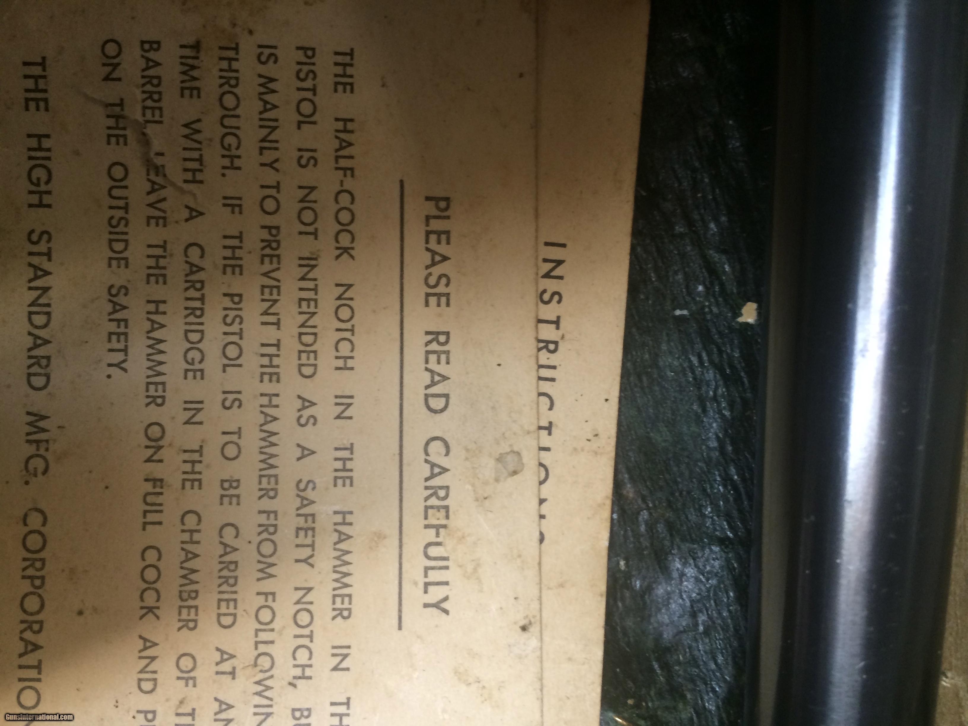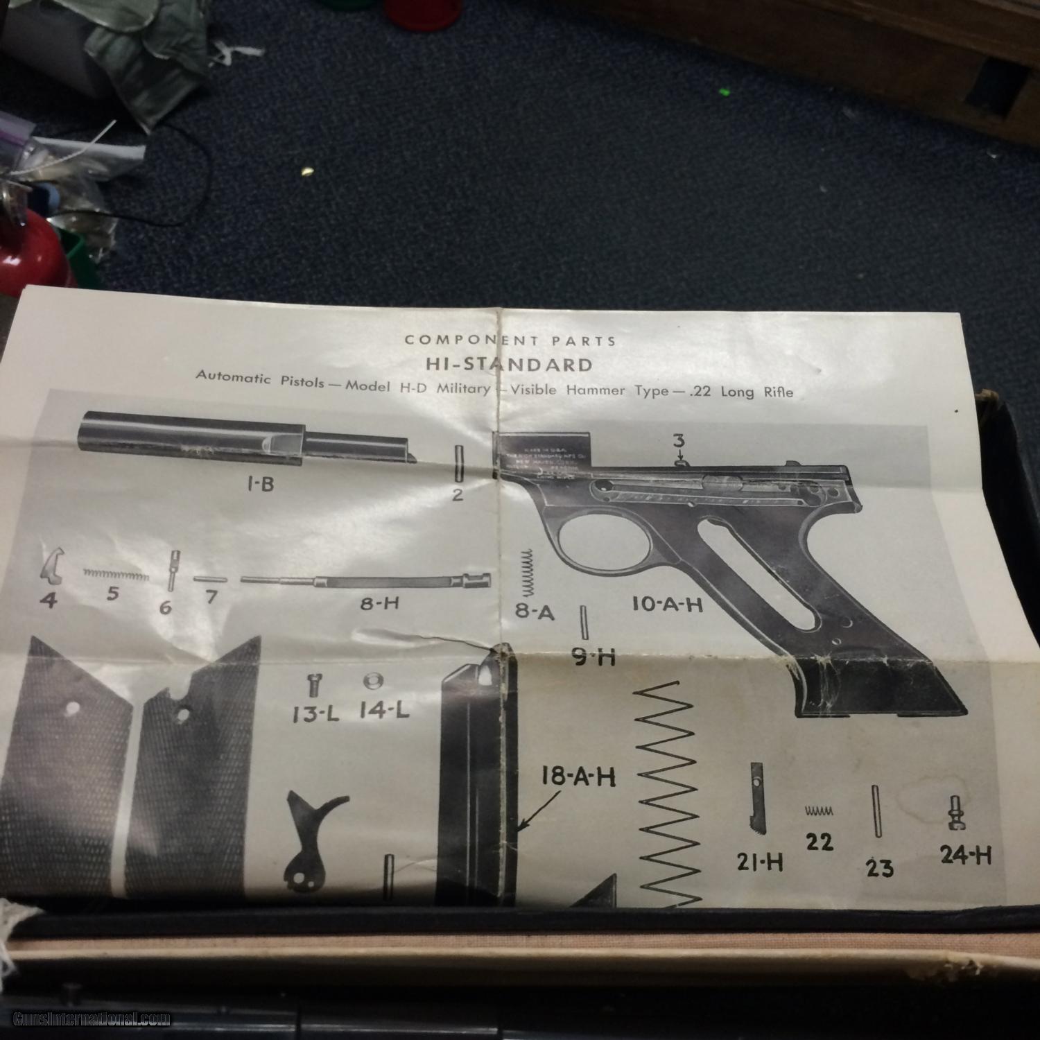Description: High Standar HD Military 6" 22 LR. in 100% original condition w/box, Box is a little tatered $ 875.00 + $35.00 sh to your FFL. I am not able to accept credit or debit cards at this time . postal money orders ship quick. SOLD Manufacturer: High Standard Model: HD Military Caliber Info: 22 LR. Bore: mint Condition: excellent Metal Condition: excellent Wood Condition: mint Bore Condition: mint Barrels: 6 Action: Semi- Auto Finish: Blue Sights: ADJ. |
