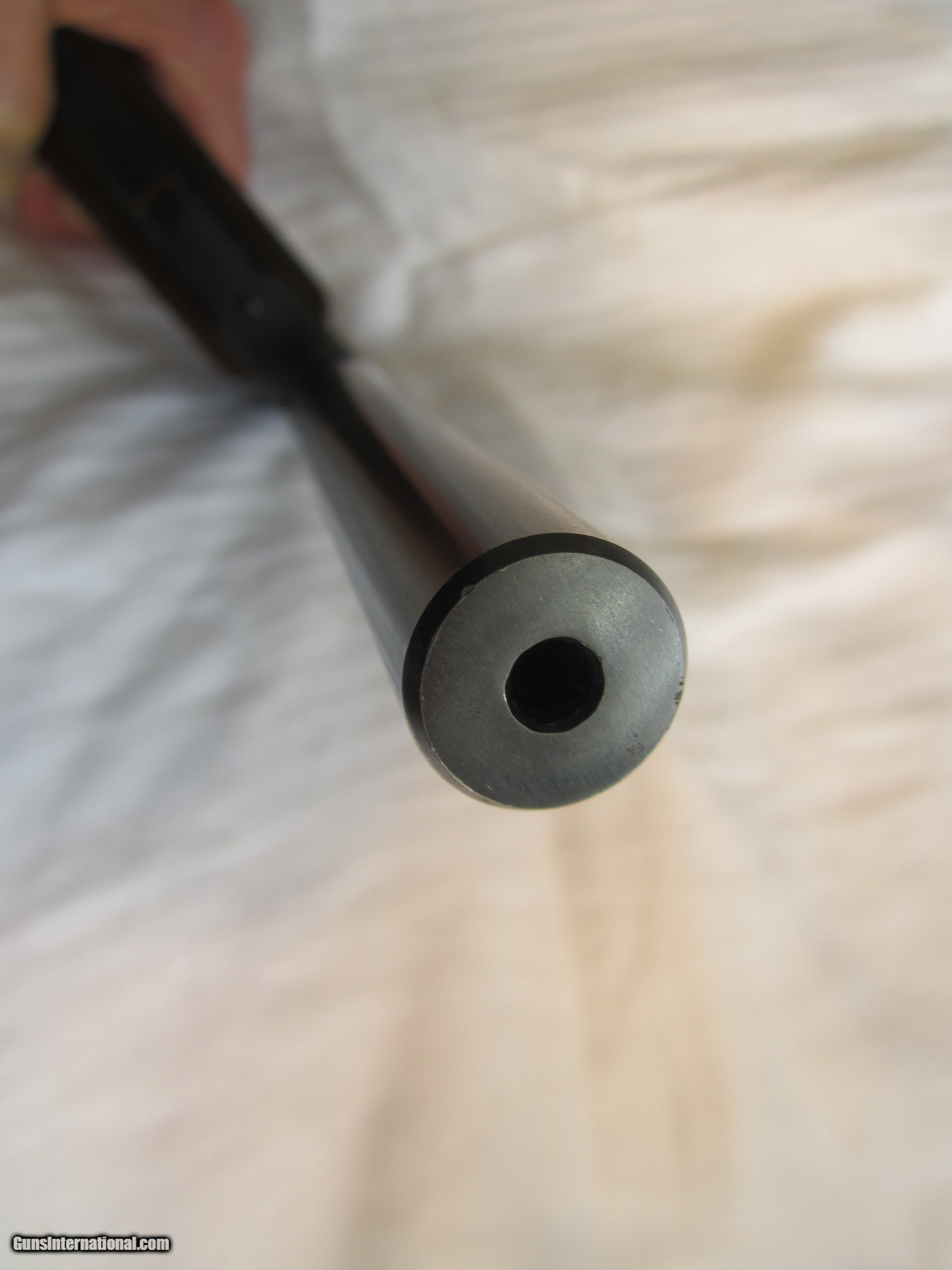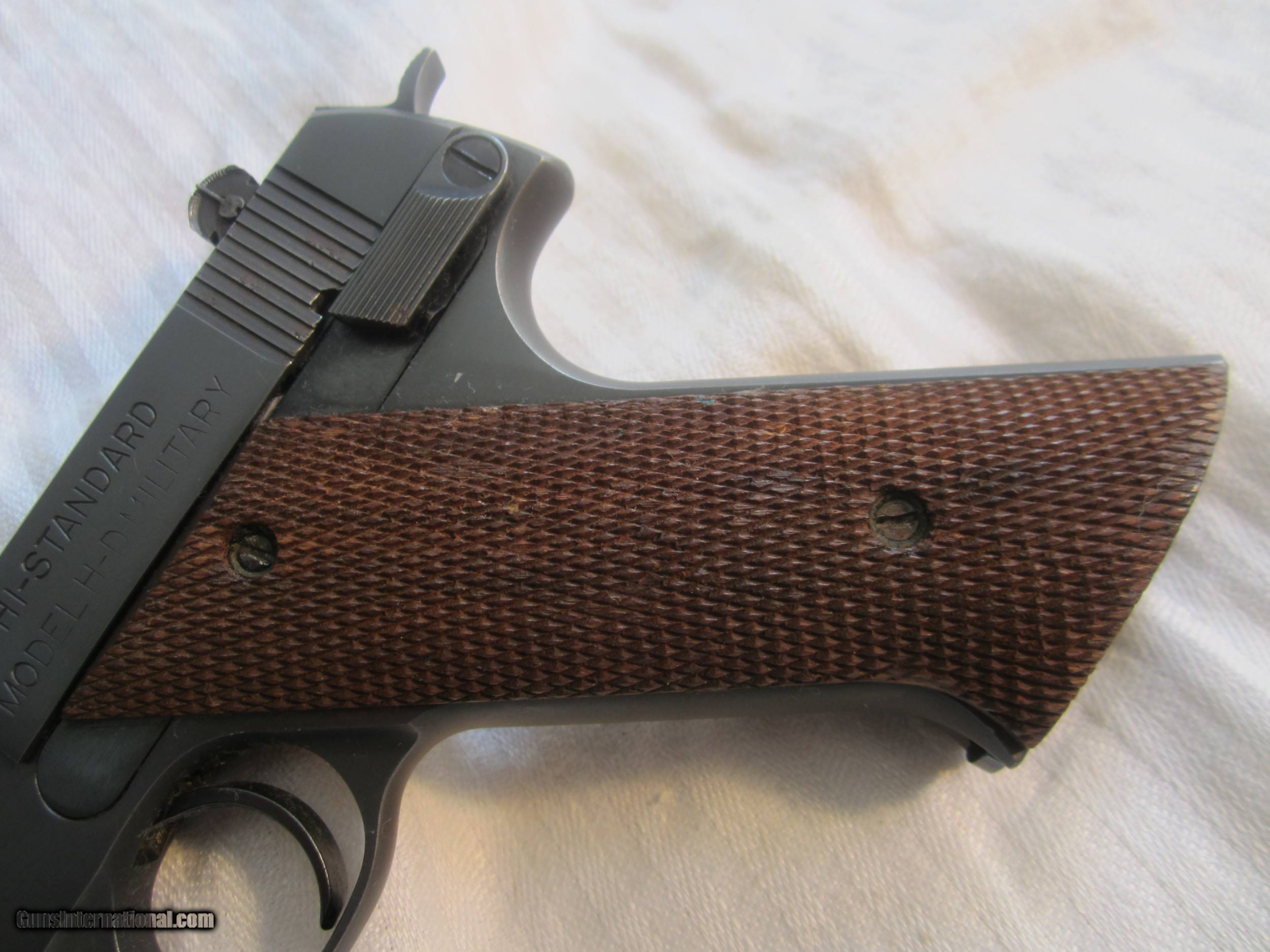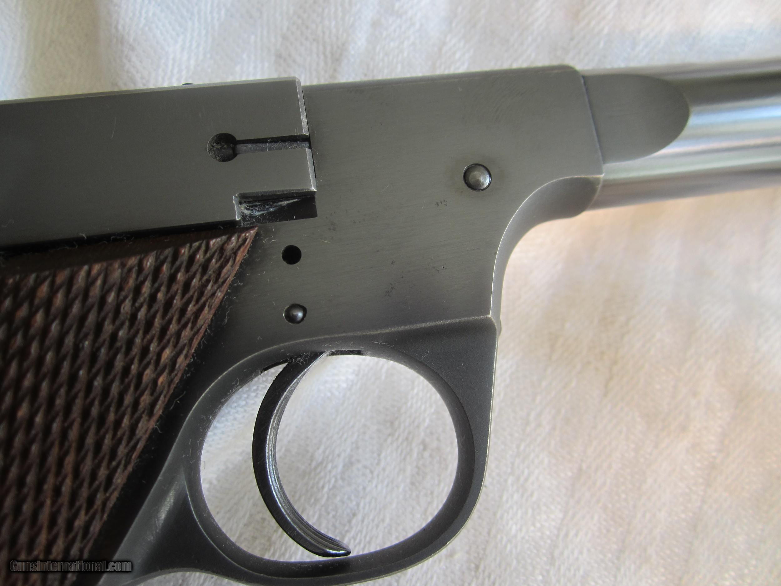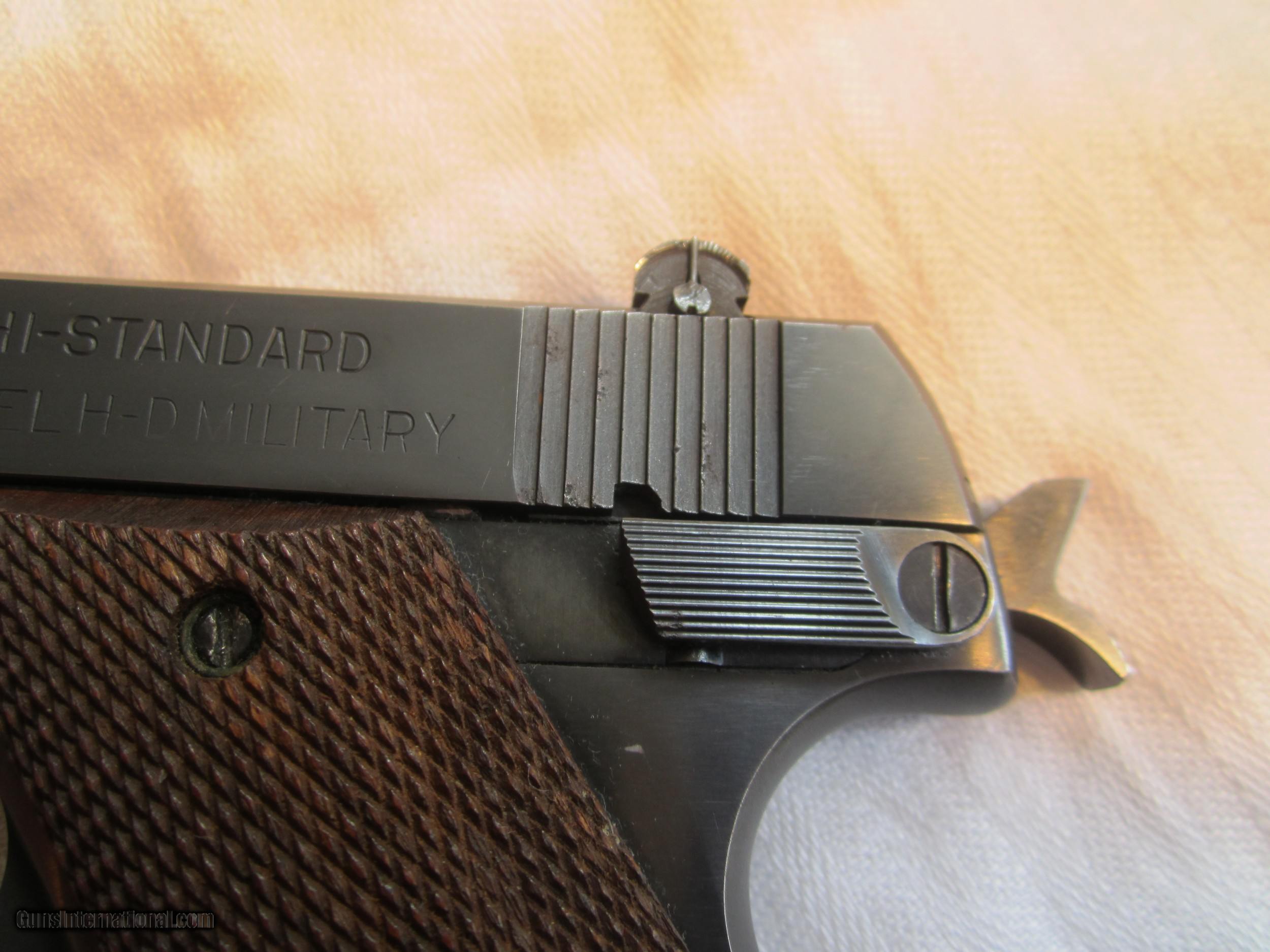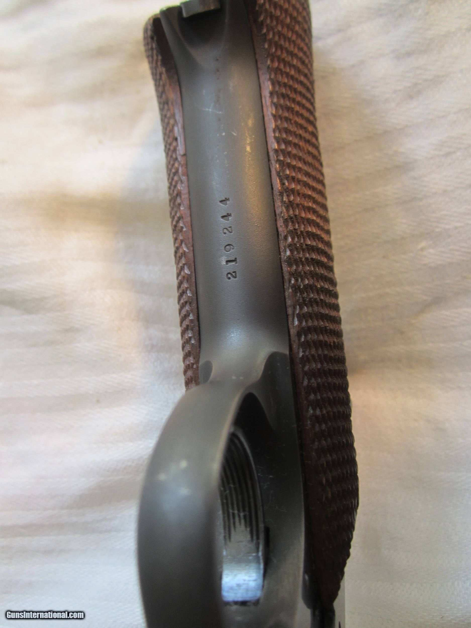 Description: Made in 1947 and in 98+% condition as to the all blue finish. The walnut checkered grips are in 99+% condition. The barrel is 6 & 5/8" long and the caliber is .22LR. The finish on the grip and trigger guard is a factory dull blue. The hammer is exposed and the rear sight is adjustable. The 10 shot magazine is also blued. This model waas introduced in 1946 and a total of approximately 150,000 were produced. A no interest payment plan is available. See more High Standards and others at "ROMSEY SOLD Manufacturer: The High Standard fg. Co., New Haven, Conn. Model: HD Military Serial Number: 219244 Barrel Length: 6 & 5/8 Caliber Info: .22LR Bore: rifled Condition: 95+% Metal Condition: 98+% Wood Condition: 99+% Bore Condition: bright/shiney Barrels: one Barrel Type: round Action: semi-automatic Triggers: one Stock: checkered walnut grips Finish: Blued Sights: front & rear Manufacture Date: 1947 Engraving: none Item Location: San Diego, California |