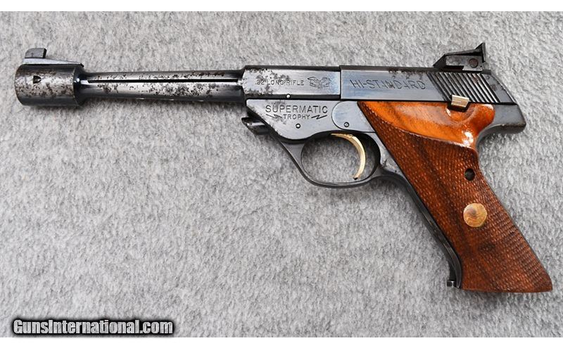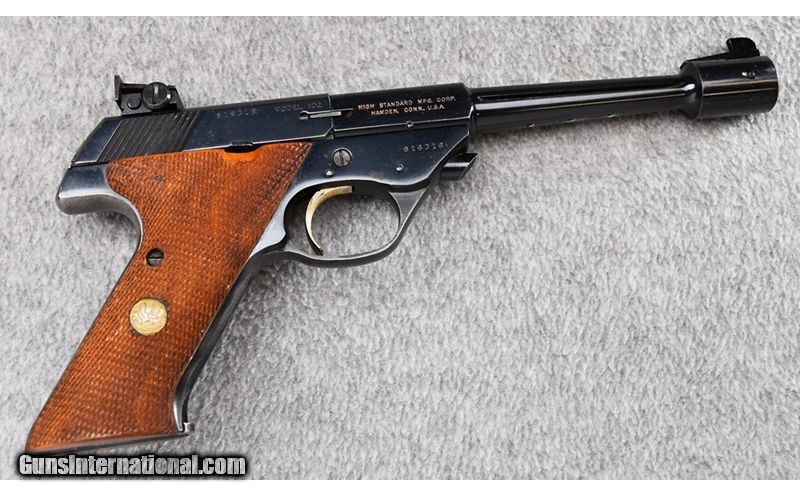 Description: This High Standard 102 Supermatic trophy is in overall fair condition. The gun has pitting and blue was scrubbed off with steel wool on the left side from what appears to be an attempt to remove corrosion. .22 Long Rifle SOLD Metal Condition: Very Good Right Side - Poor Left Side Wood Condition: Very Good Bore Condition: Very Good Barrels: 6.75 Triggers: Factory Fore End: Checkered Walnut Grips with Right Thumb Rest Weight: 48 oz. Sights: Adjustable front and Rear Sights Item Location: Wheeling |