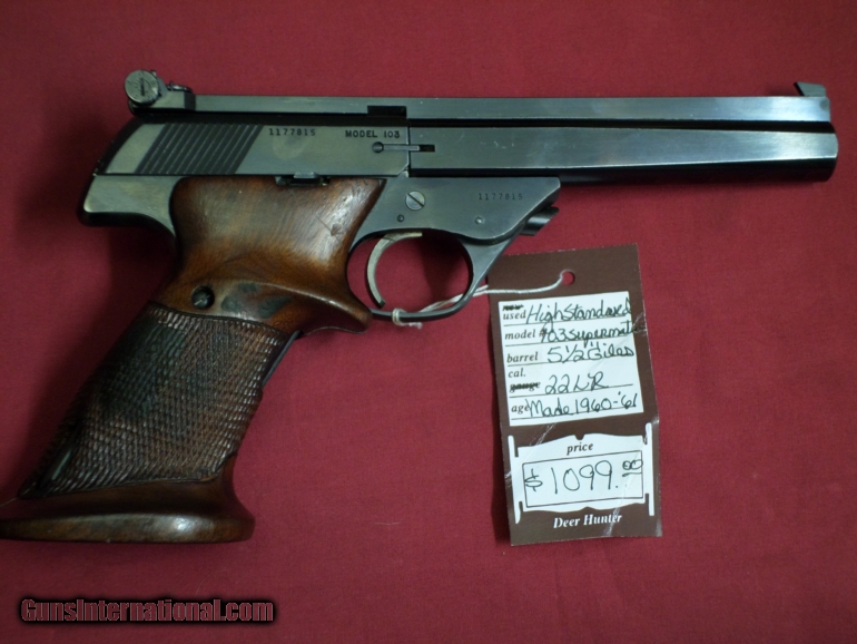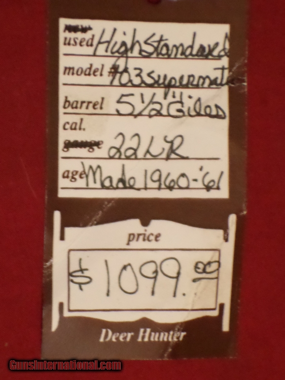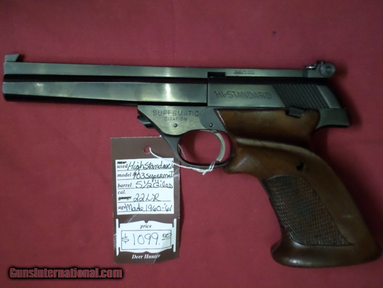 Description: SOLD For sale, Giles accurized High Standard 103 Supermatic Citation, .22 LR, 5 1/2" bbl, with Giles rib and extended front sight, Very good to excellent condition. SOLD To see more of our inventory, visit deerhunterguns,com We accept MC, Visa and Discover, no AmEx. No Sales to California. Like us on Facebook: Deer Hunter Guns SOLD |