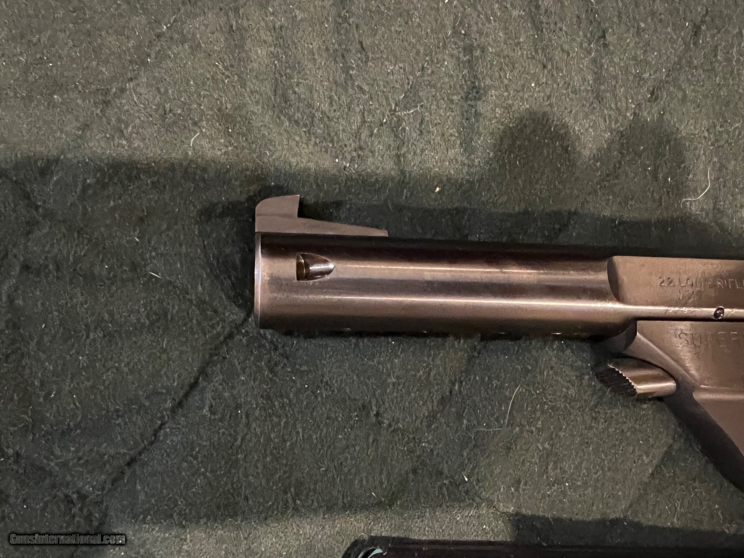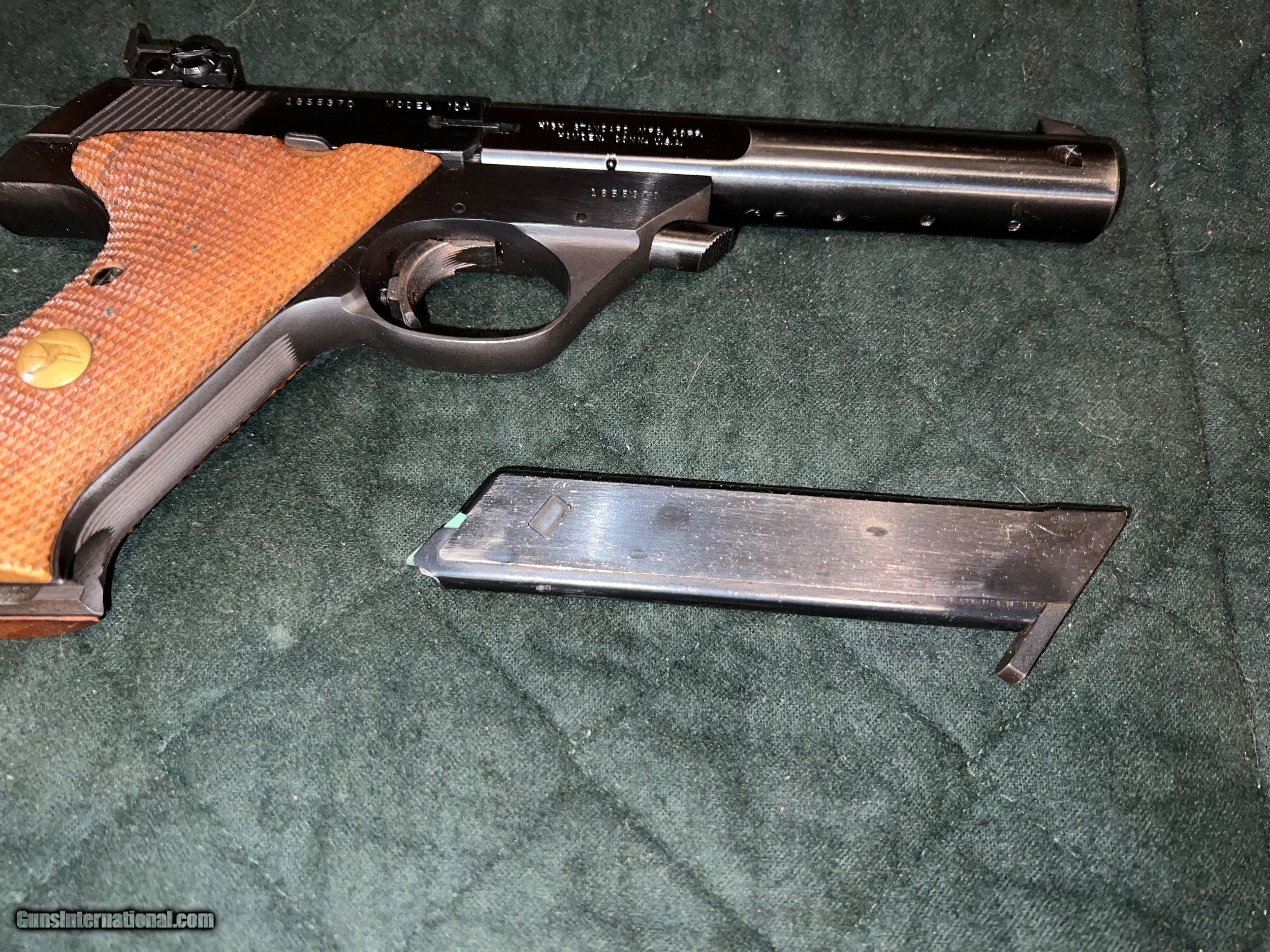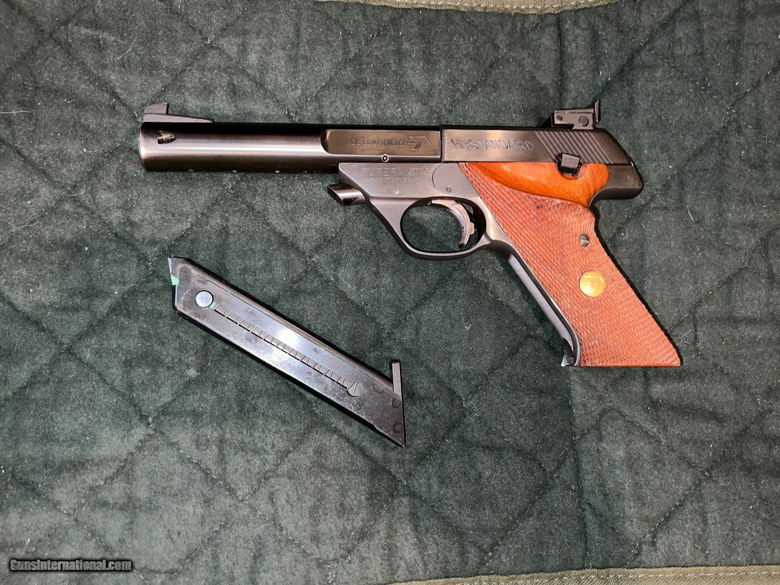 Description: Hi Standard 104 Series Supermatic CItation .22LR Pistol with 5 1/2" barrel, correct checkered wooden grips with thumb rest. Most of the blue wear is at muzzle, which is where I assumed a High Standard muzzle break had been installed (it is a simple clamp on mount-no gunsmithing required). Hamden CT made of course, as were all 104 series pistols. Peak (in my opinion) period of High Standard Quality. One correct Hi Standard marked magazine. Very nice example. Pictures tell the story, as they are at least pretty good, but please feel free to email me or call with any questions you might have. $40 shipping via a carefully packed parcel with FedEx to your FFL. NO sales tax or extra fees. Thanks for your interest and please see my other ads. SOLD Handgun Caliber: .22 Long Rifle Manufacturer: High Standard Model: Citation Condition: Excellent Metal Condition: Excellent Wood Condition: Excellent Bore Condition: perfect |