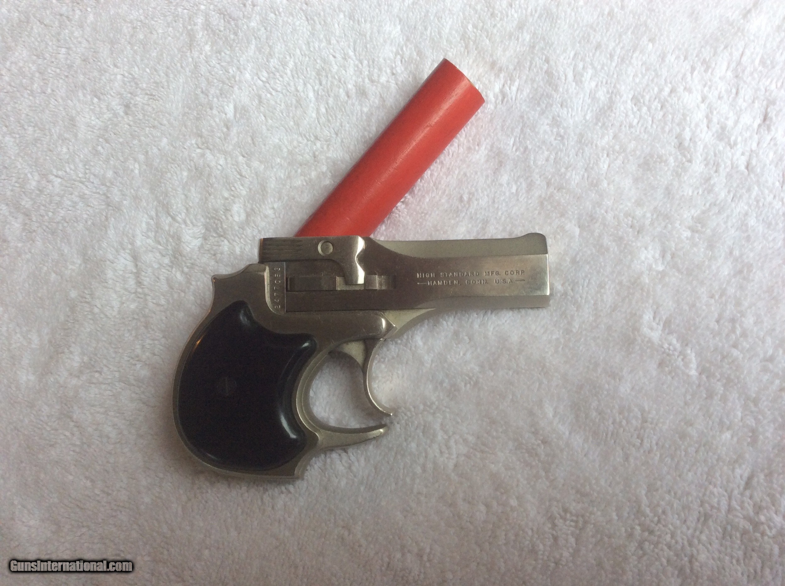Description: For your viewing is a like new in the box Hi Standard Derringer made in Hamden Conn. this piece is in excellent condition and may not even been fired. It has the original box and warranty papers. The box has some slight imperfections but retains 95% condition. If your a collector of High Standard, this derringer would fit right in your collection as it retains 98%+ condition. TheHigh Standard warranty card is also included and is under the warranty certificate in the cover. A true collector piece from days gone by. Cal or email for more info etc. Thanks for looking SOLD |