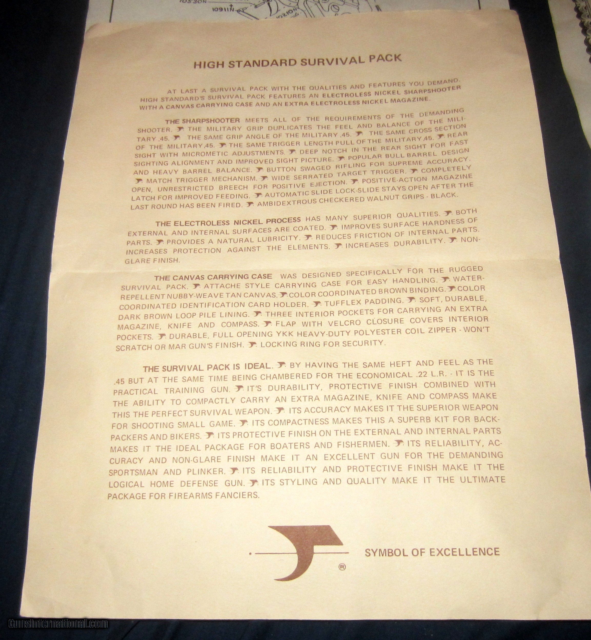 Description: WOW!!! ONLY MADE FOR TWO YEARS 1983/1984! RARE HIGH STANDARD .22LR SHARPSHOOTER SURVIVAL PACK! THESE ARE VERY RARE AND TO FIND ONE WITH ORIGINAL CANVAS CASE AND ALL PAPERWORK INCLUDED IS A HOLY GRAIL! GUN IS MADE WITH ELECTROLESS NICKEL FINISH AND COMES WITH THREE 10 ROUND ORIGINAL MAGAZINES~CASE IS ALSO LIKE NEW MINT CONDITION! COMES WITH ORIGINAL WARRANTY SHEET, MANUAL AND THE ORIGINAL MARKING BROCHURE! YOU JUST CAN'T FIND THESE AND WITH THE ORIGINAL PAPERWORK ALMOST NEVER~THE COLLECTORS DREAM GUN! IF YOUR A HIGH STANDARD COLLECTOR, THIS ONE IS NOT TO BE PASSED UP! THE SHARPSHOOTERS ALONE ARE SO RARE AND A SURVIVAL PACK ARE RARELY SEEN! LOOKS LIKE IT WAS SHOT VERY LITTLE IF AT ALL. PRIVATE SALE NO TAX~SHIPS TO YOUR FFL FOR $40 INSURED! PLEASE MAKE SURE YOUR FFL WILL ACCEPT A PRIVATE SHIPPED GUN WITH BILL OF SALE AND COPY OF DRIVERS LICENSE~IF NOT ADD $20 TO SHIPPING IF YOUR FFL NEEDS IT TO BE SHIPPED FROM MY FFL! PRICE IS FIRM FOR NOW! BETTER GRAB IT WILL NOT LAST LONG!!!!!! SOLD Handgun Caliber: .22 Long Rifle Manufacturer: High Standard Model: SHARPSHOOTER-M Barrel Length: 5 1/2 Bore: LIKE NEW Condition: Excellent Metal Condition: Excellent Bore Condition: Excellent Barrels: 1 Action: Semi Auto Finish: STAINLESS STEEL Sights: ADJUSTIBLE Manufacture Date: 1983/1984 |