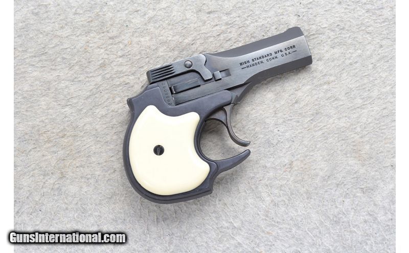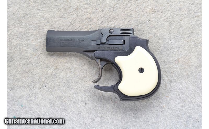 Description: This High Standard Model D-100 is an over and under derringer in .22 Long Rifle Cal. It has 3 1/2 inch barrels. A blade front sight and notch rear sight. The grip is a smooth cream colored hard plastic. .22 Long Rifle SOLD Chambers: Over/Under 2 shot. Metal Condition: Very good. Bore Condition: Very good. Barrels: 3.5 inch barrels. Triggers: Single. Weight: 12 oz. Sights: Blade front. Notch rear. Item Location: Richfield, WI |