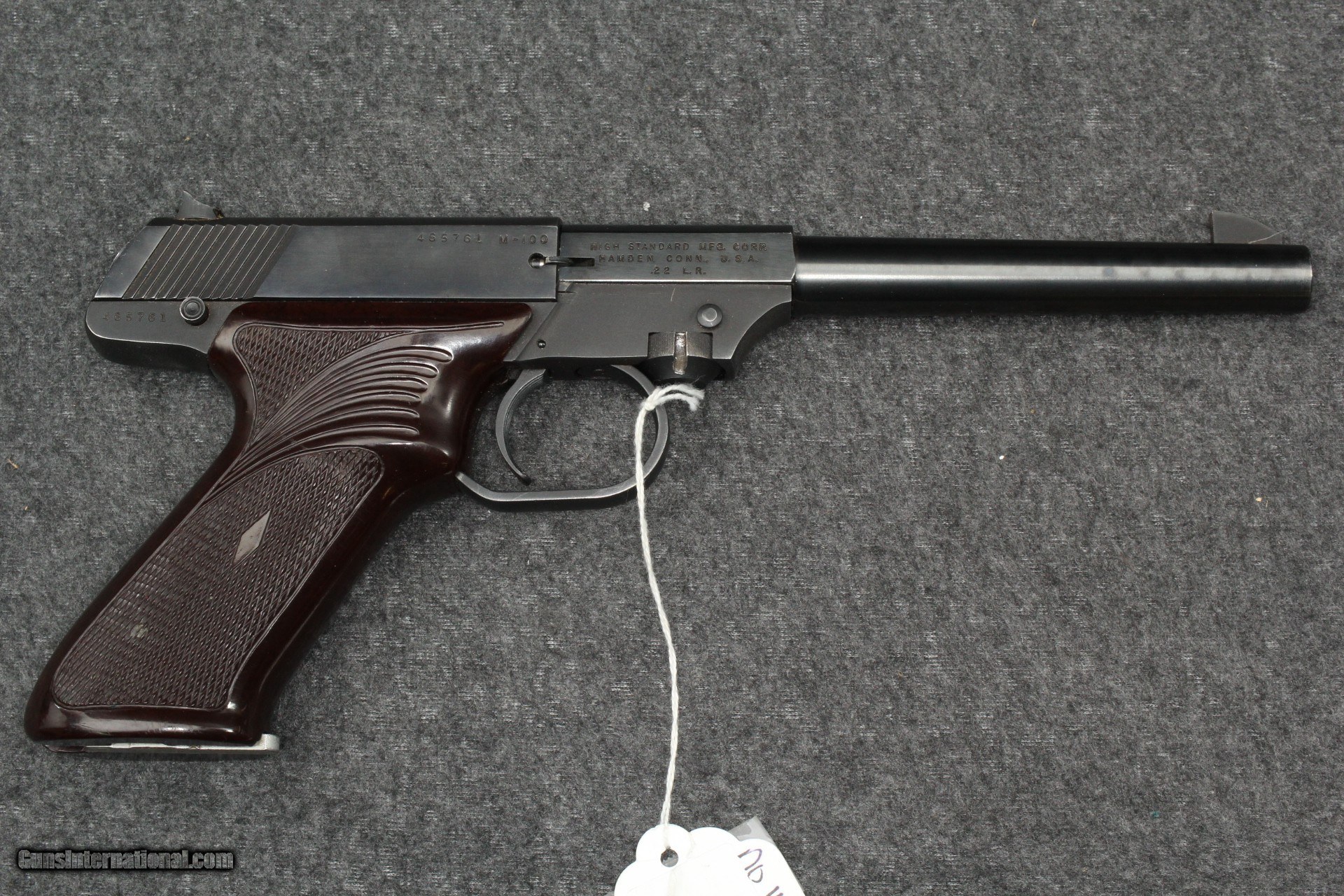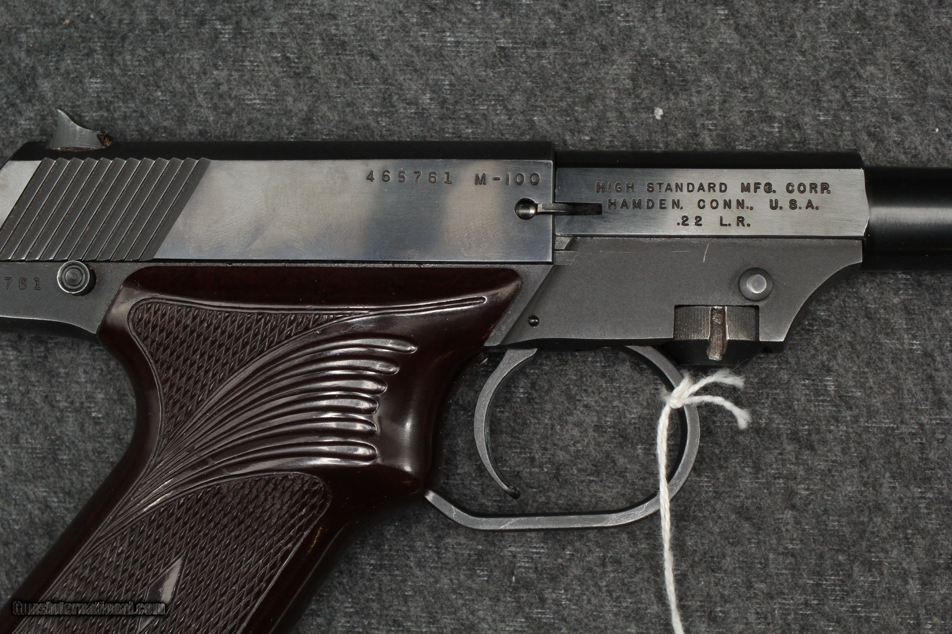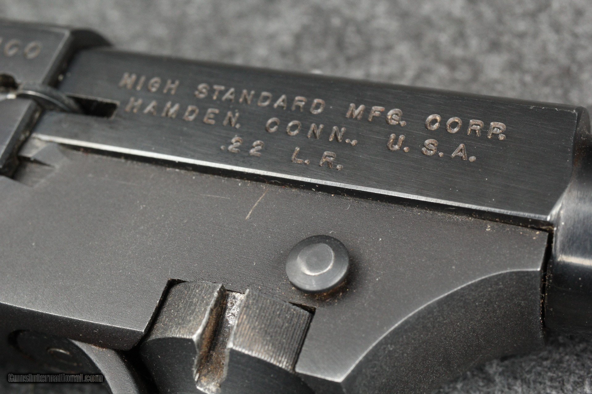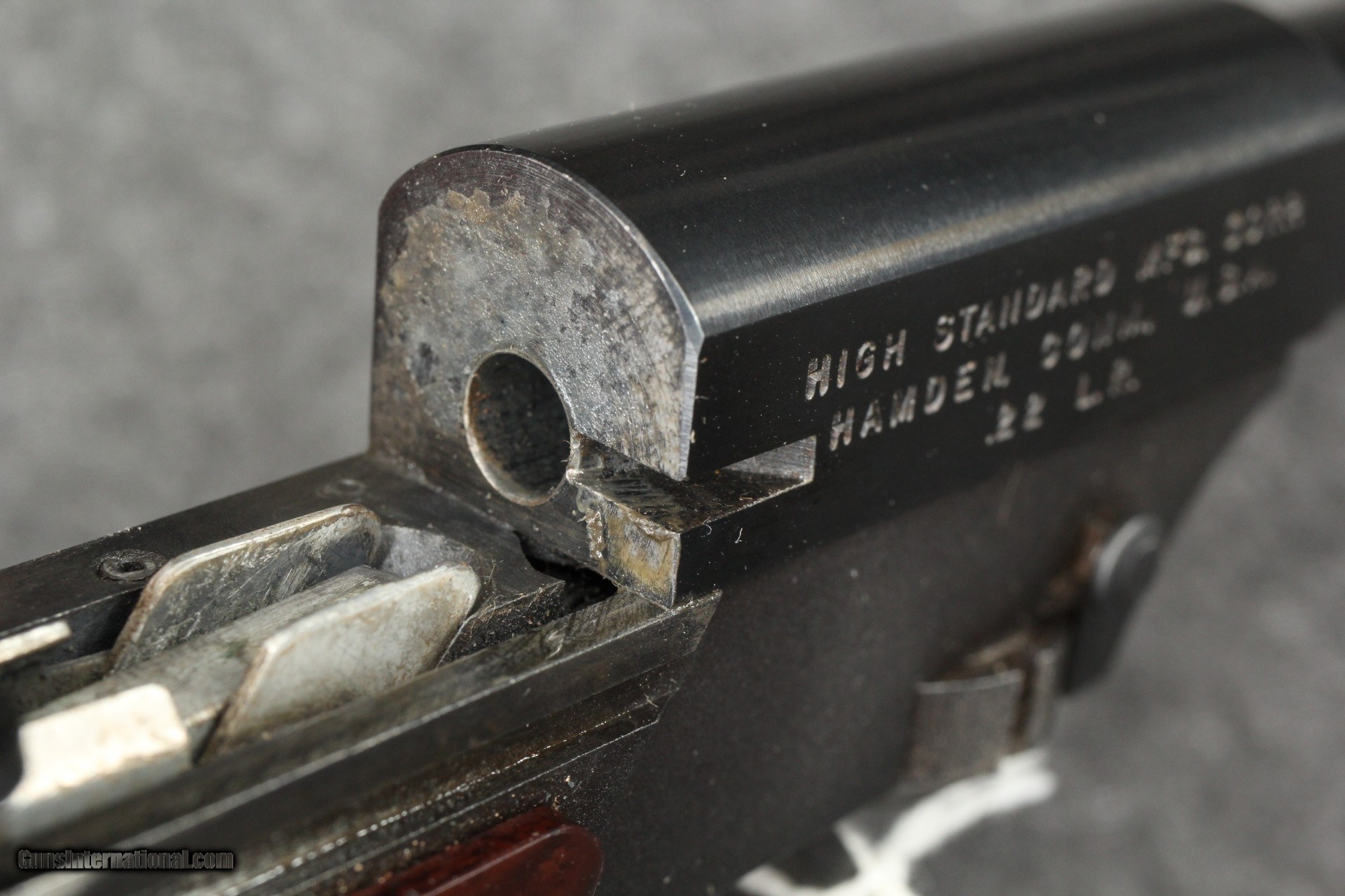 Description: 22lr, serial number 4657XX. Made in Hamden Ct. 6.5" barrel. Overal in good condition, shows normal wear/use. Metal is good, shows wear on sharp edges and at muzzle. Lights marring on top of slide. Bore is excellent. Brown, plastic grips are in good condition, show wear on checkering. No cracks or chips. Hi-Standard marked silver magazine. More photos on request. Please add $35.00 for shipping and insurance. SOLD Curio/Relic: Yes Handgun Caliber: .22 Long Rifle |
