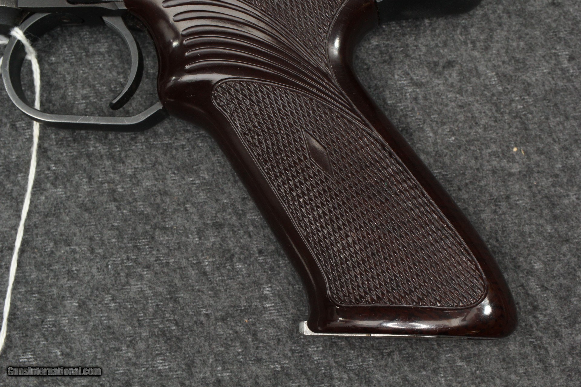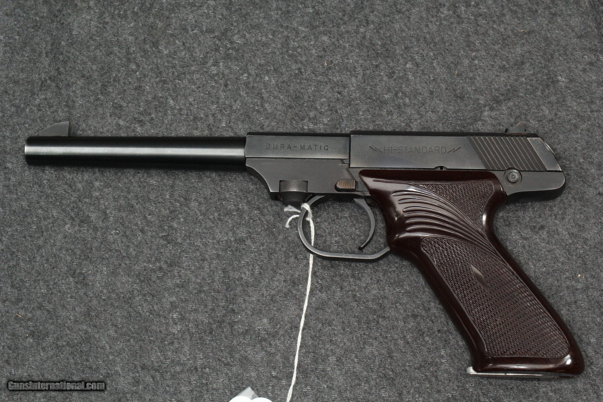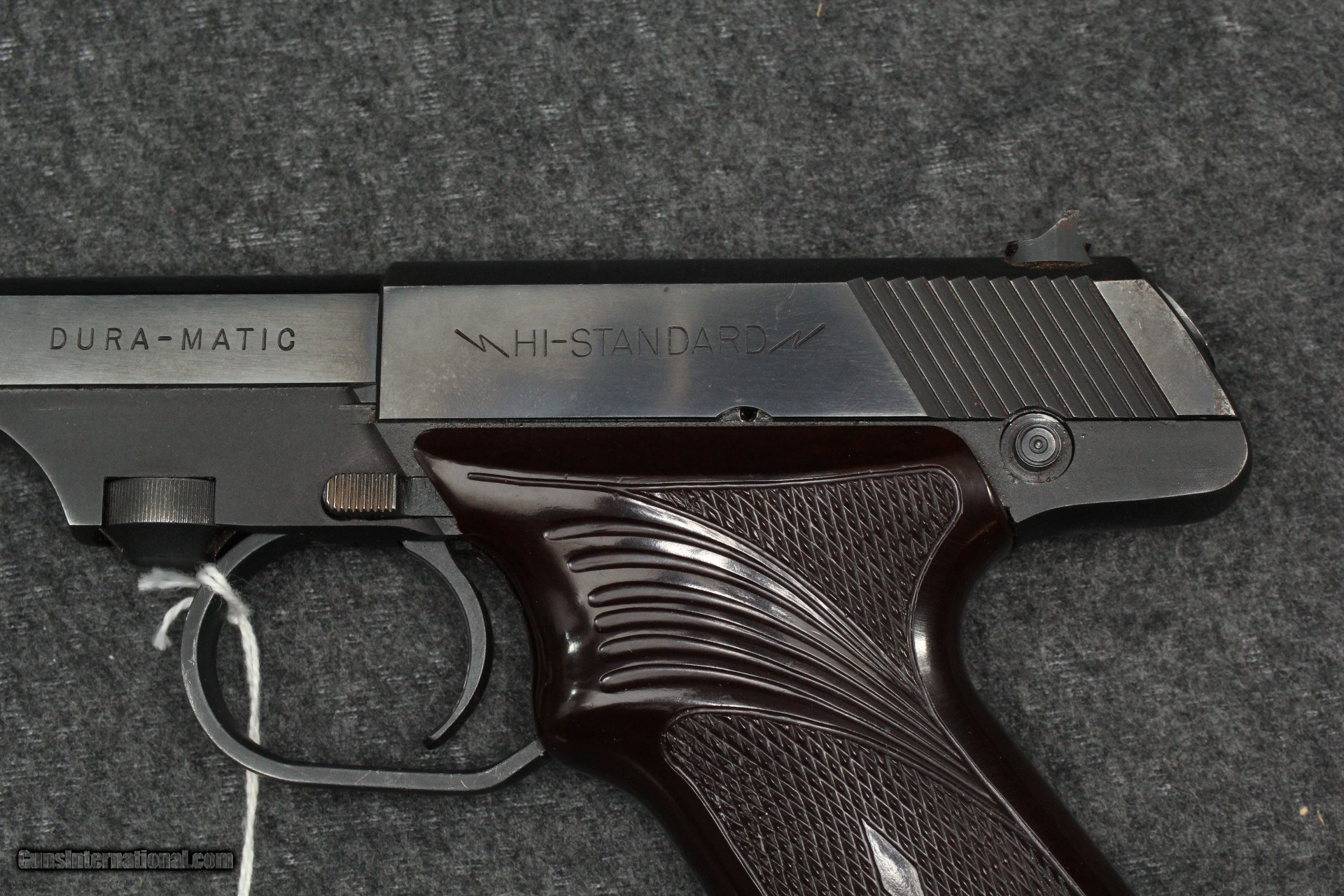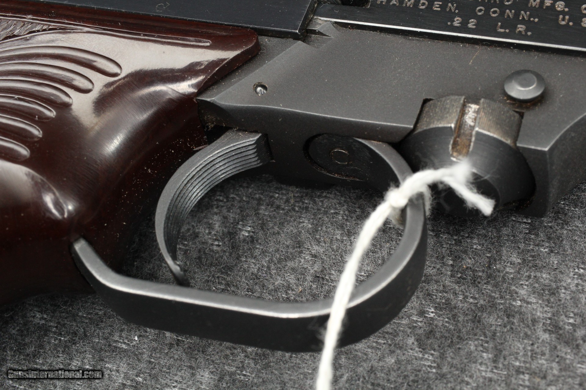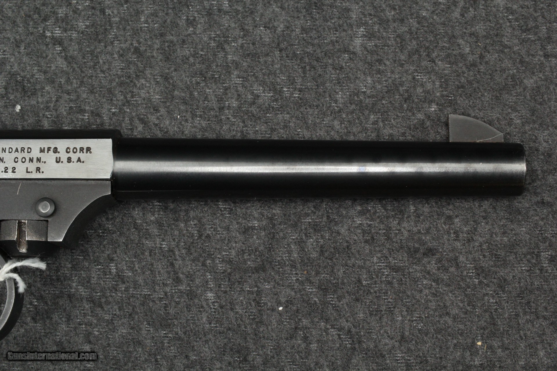 Description: 22lr, serial number 4657XX. Made in Hamden Ct. 6.5" barrel. Overal in good condition, shows normal wear/use. Metal is good, shows wear on sharp edges and at muzzle. Lights marring on top of slide. Bore is excellent. Brown, plastic grips are in good condition, show wear on checkering. No cracks or chips. Hi-Standard marked silver magazine. More photos on request. Please add $35.00 for shipping and insurance. SOLD Curio/Relic: Yes Handgun Caliber: .22 Long Rifle |