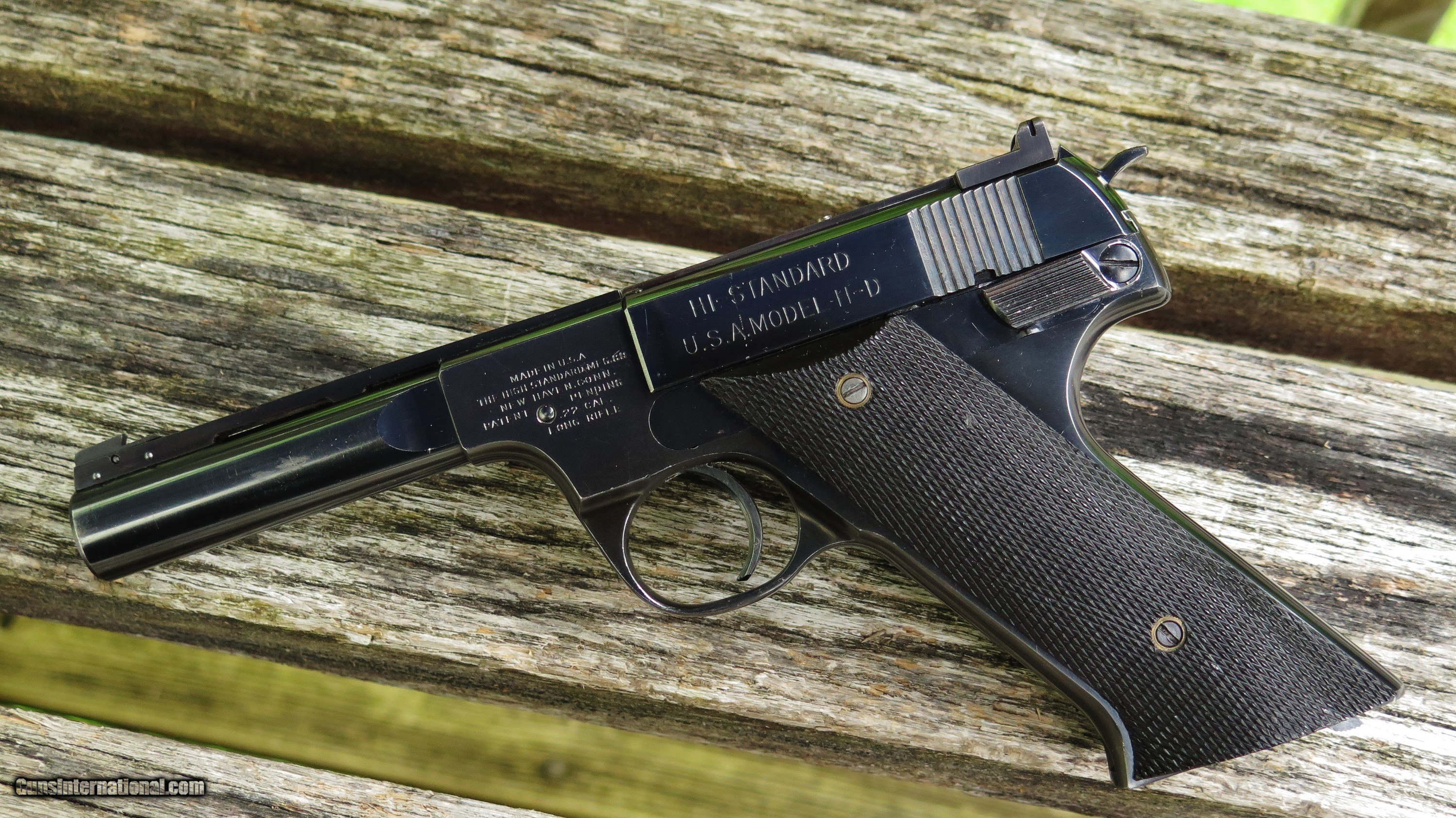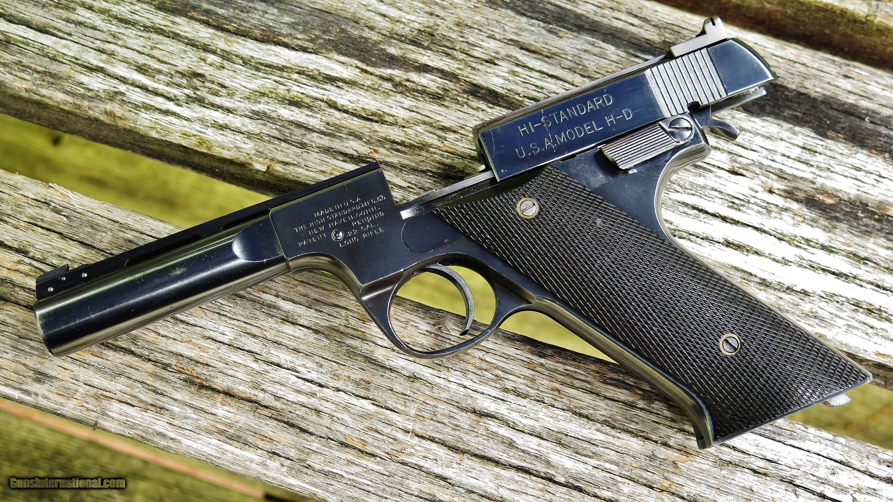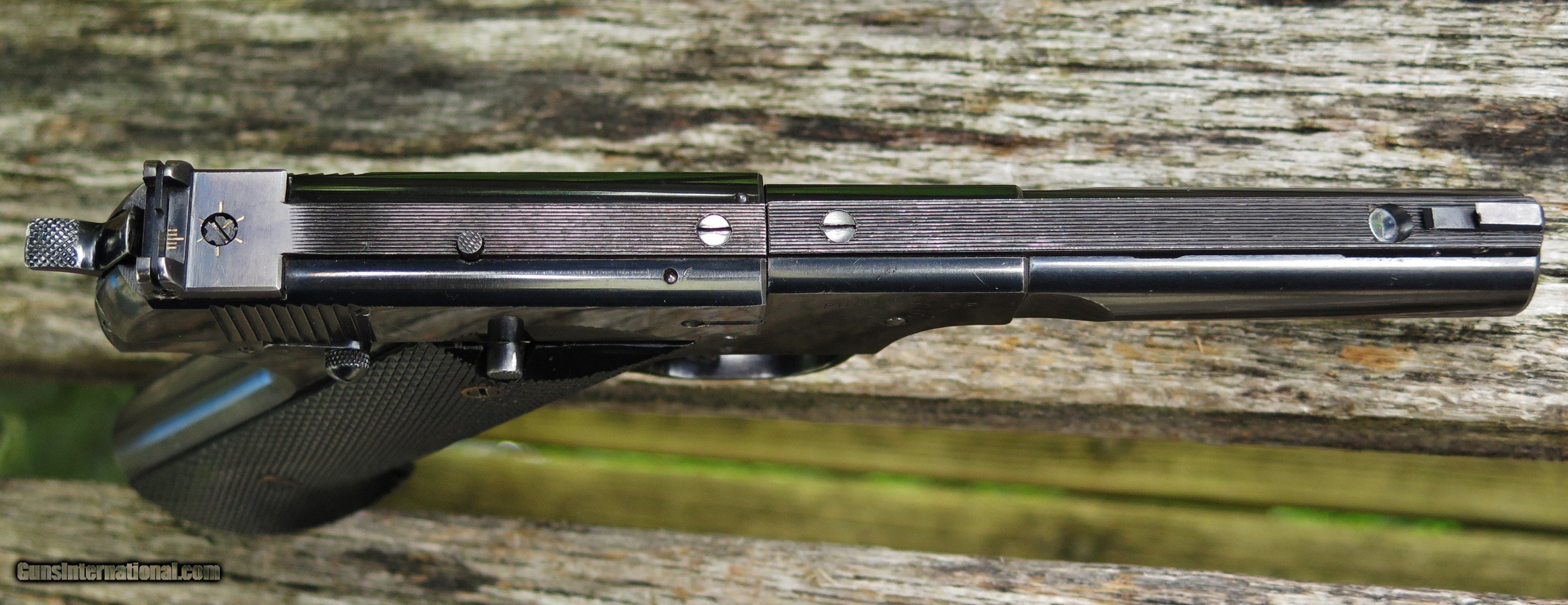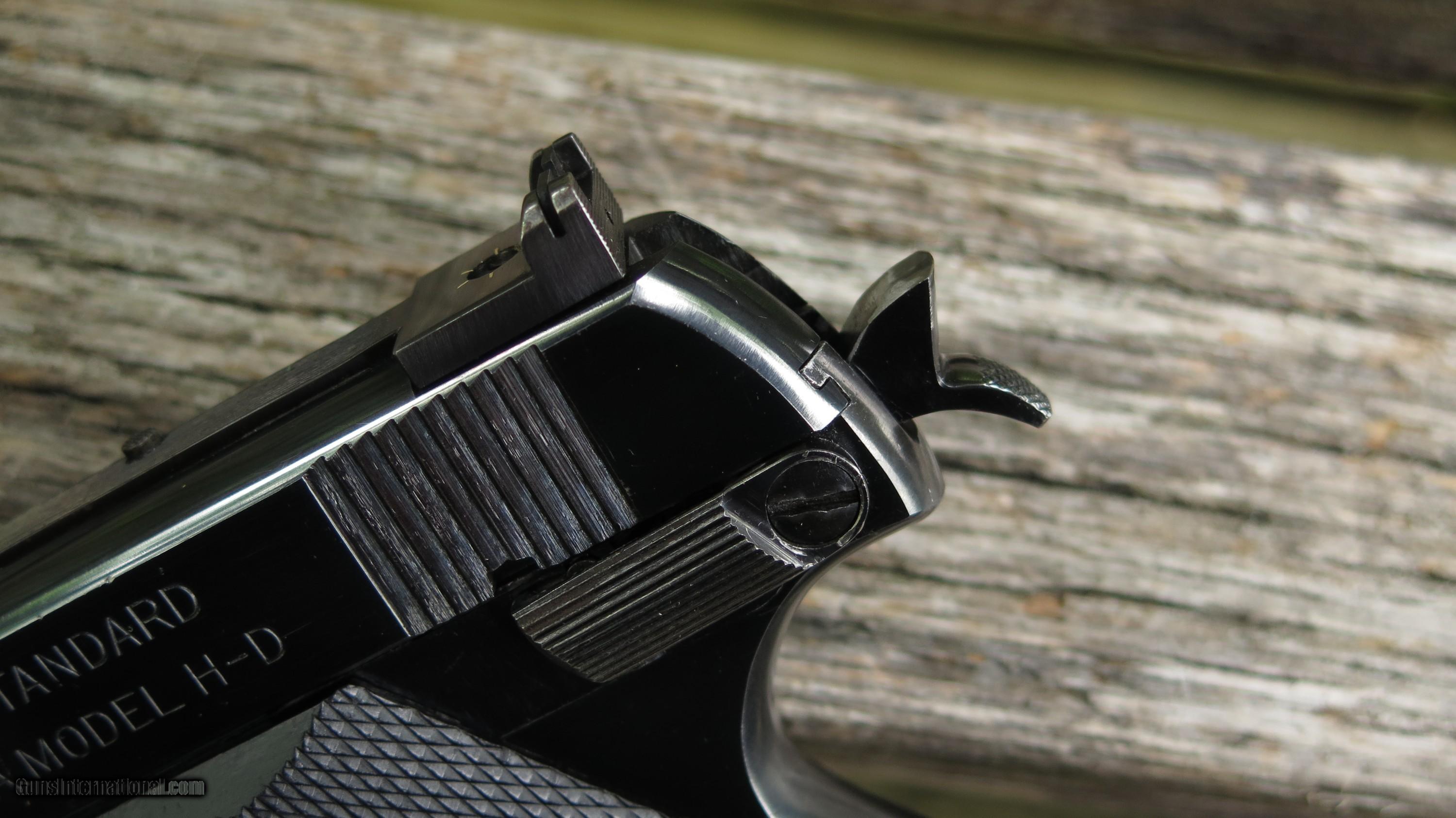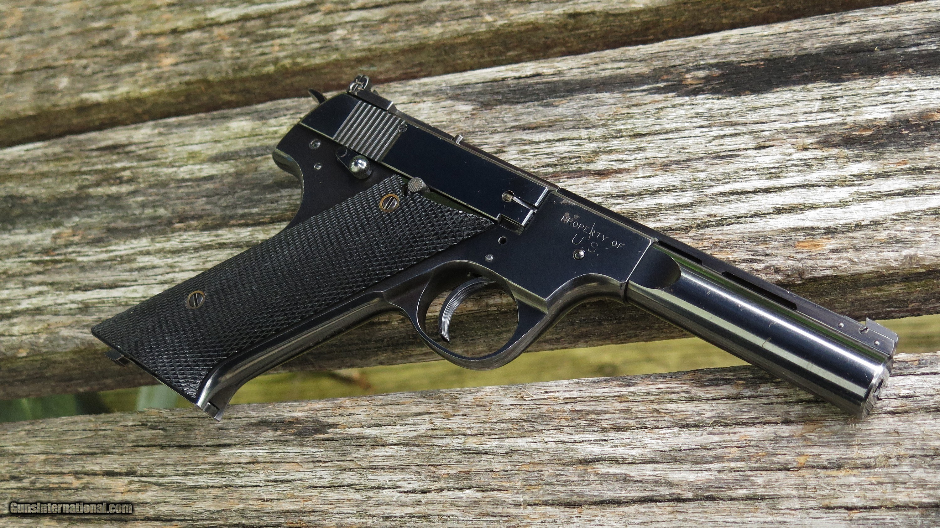 Description: This is a H-D USA .22 LR 4 1/2" Target and training Pistol that was made for the US Military back in 1944 In the USA in Connecticut. Marked "Property of US". It has the King Super Target Vent Rib with Mirrored Front sight. King Target guns are scarce. On a US Military gun even more so. This one is original blue and with correct original black checkered grips. The bore is mirror bright with deep rifling. The action is smooth and tight. Trigger pull is light and crisp. Slide is matching numbers. The magazine is the correct two-tone. Virtually no grip strap wear on the original blue so it is little fired but with some typical military handling marks. It is still a very nice looking semi-auto pistol with High Standard's commercial quality high luster blue. This blue only used on the earlier models. This King Super Target H-D USA is the probably the only one in existance. Scarce and desireable. I am Oregon Lumberjack on the other big site with 1000's of positive feedbacks. I am a FFL dealer. Shipping is $35 to your dealer. SOLD |