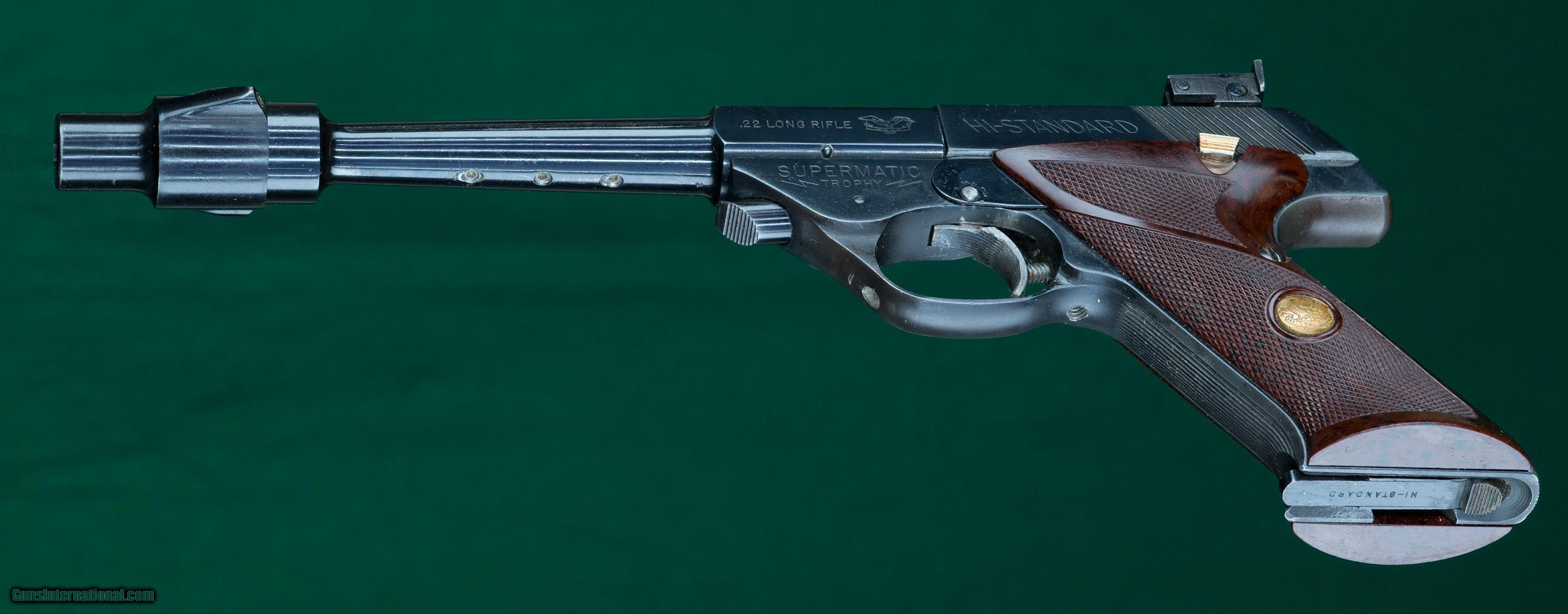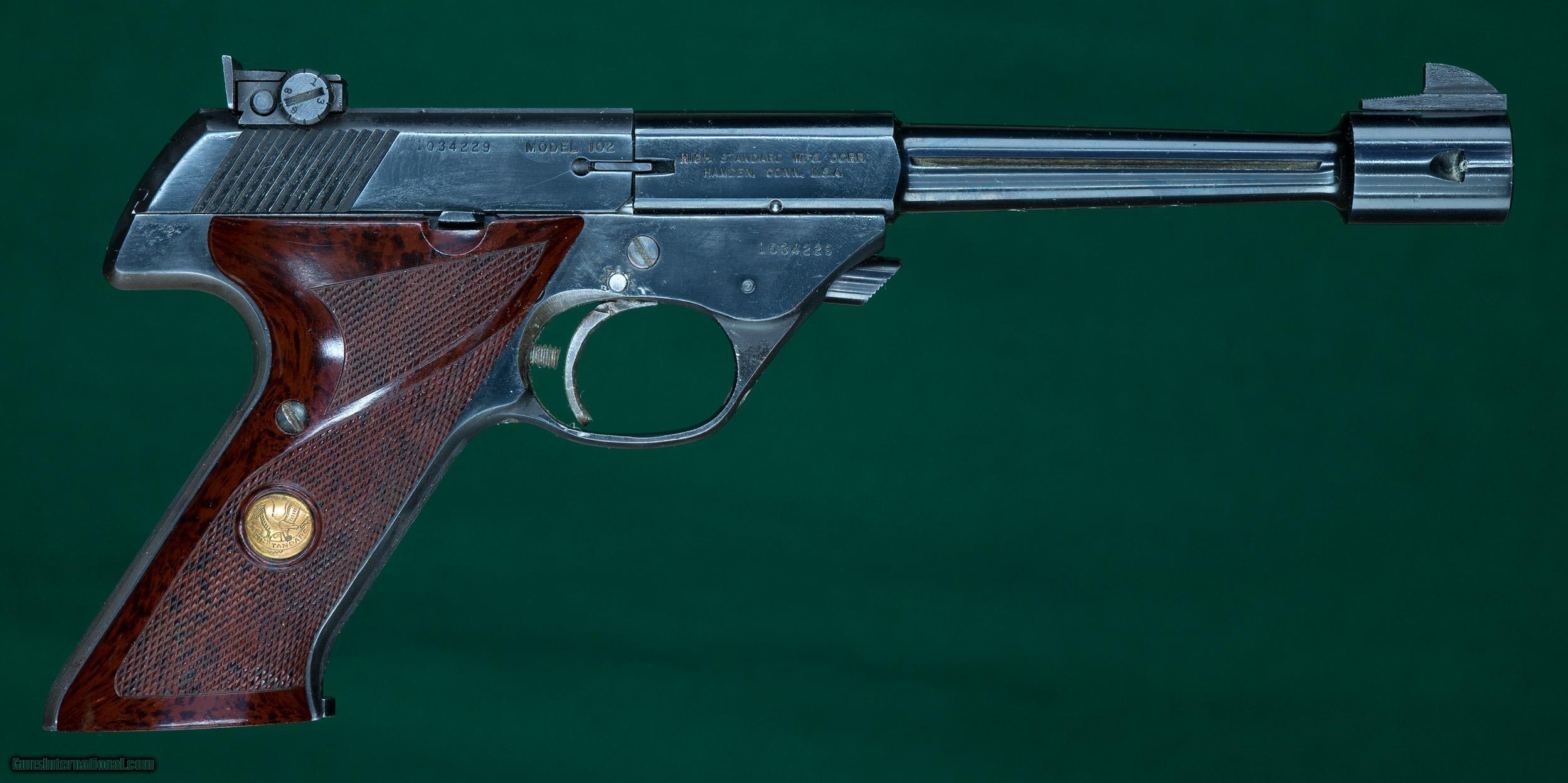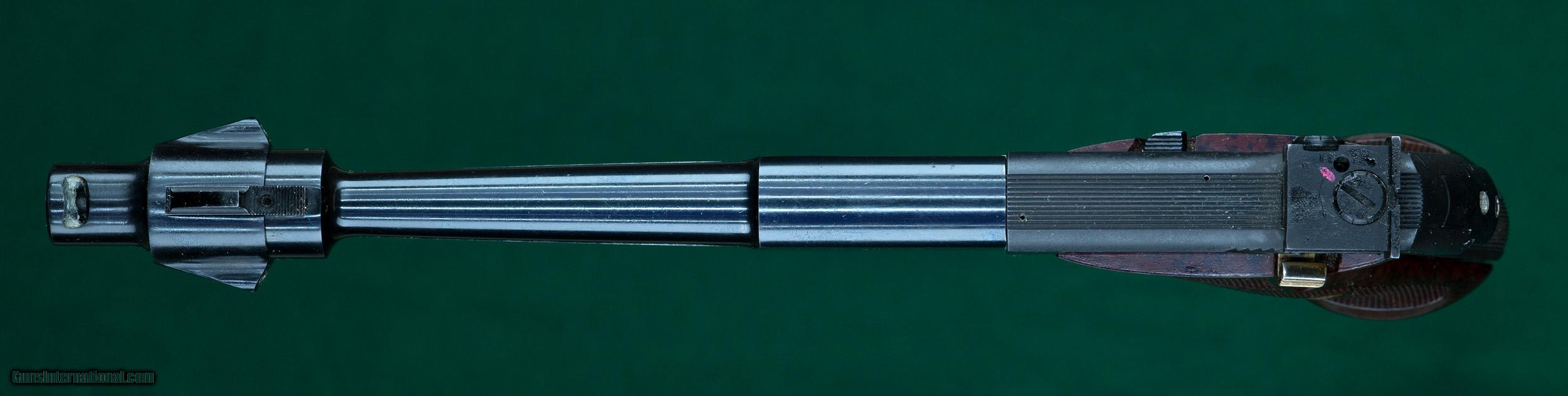 Description: 6 3/4" barrel with side-grooves for barrel weights and with detachable muzzlebrake stabilizer. Checkered brown plastic medallion grips. Grooved front and rear gripstraps. Trigger stop and trigger pull adjustment. Rear sight mounted to rear of slide and adjustable for windage and elevation. Mfd ca 1959. 98% high-gloss blue. SOLD Curio/Relic: Yes |