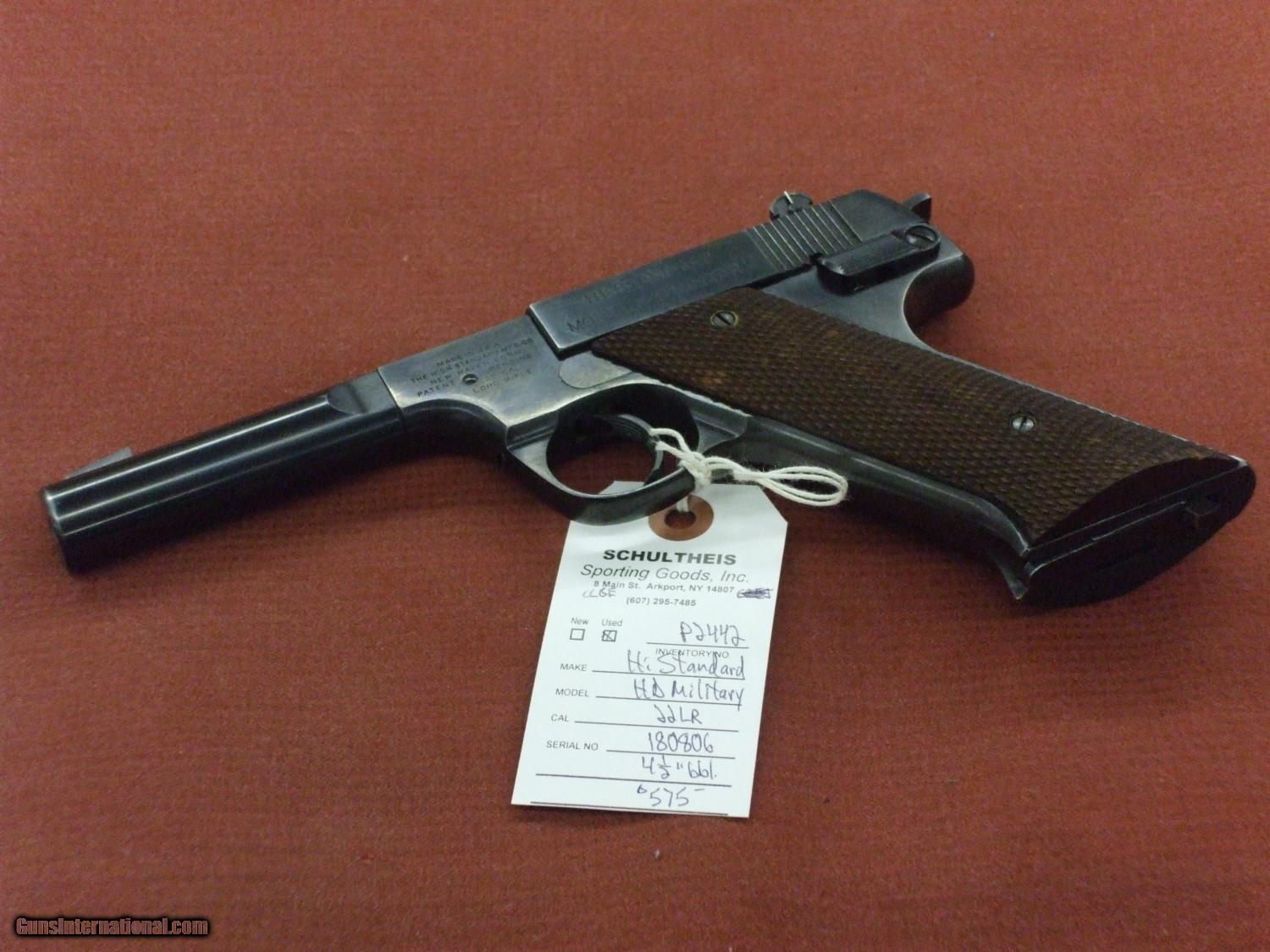 Description: High Standard HD Military 22LR, 4 1/2" bbl, 97% blue, all original. SOLD |