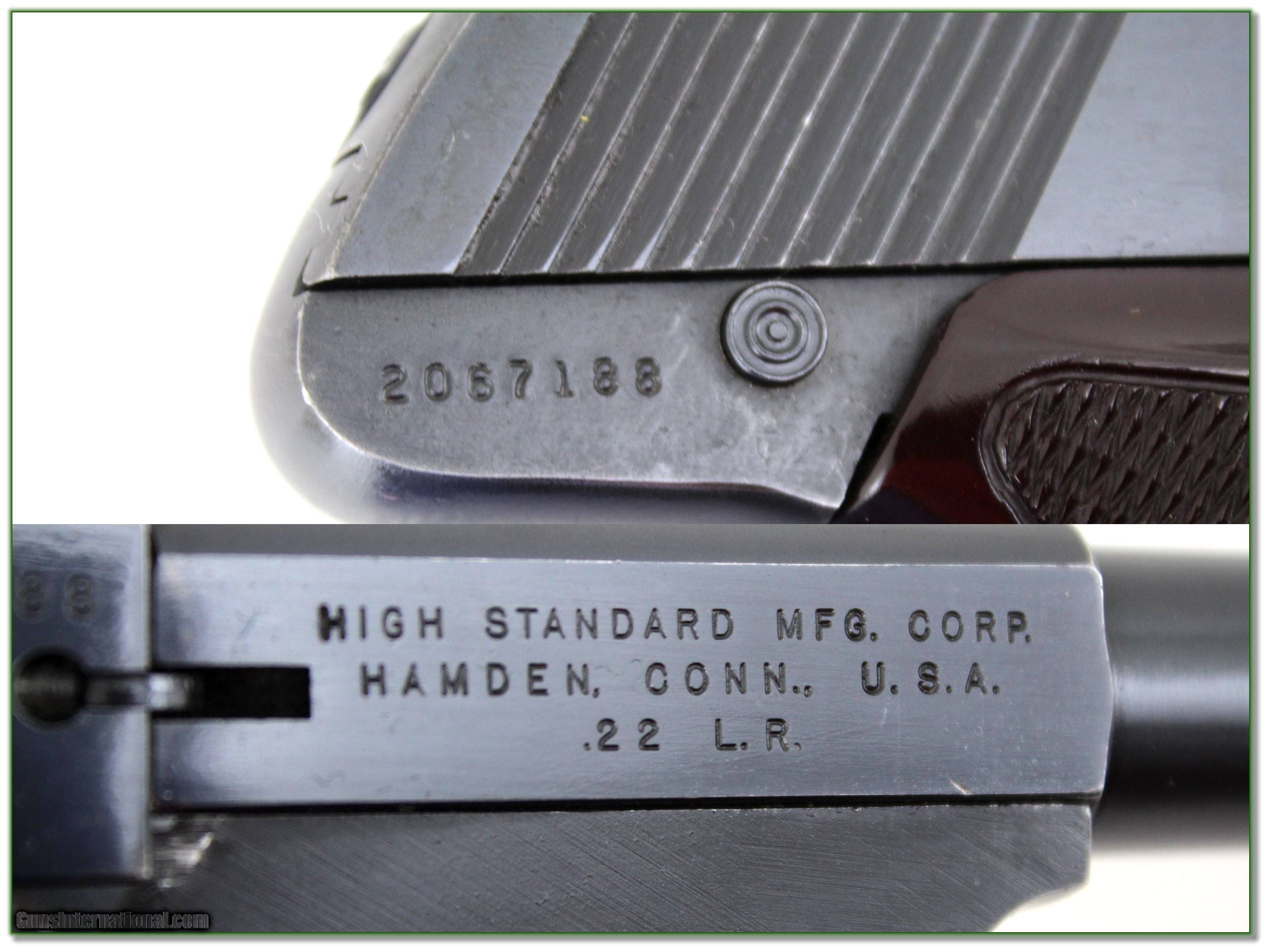 Description: Collectors, this is a very nice Hi-Standard Dura-Matic in 22 LR. It has a 6.5in. I only find a few marks near the muzzle of the barrel. The bore is bright and shiny. I am selling this one on consignment and as such lay-a-way can’t be used. It does of course have the standard 3-day inspection. Shipping and insurance is $39. Please email me with any questions or larger pictures. (Consign your quality firearms with Shooting Investments for only 12%! Let me know if you have any you would like to sell!) 22-1084 Payment: Payment is by Money Order, Cashier’s Check or Personal Check. I can now also accept Credit Cards (MasterCard, Visa, Discover & American Express) with a 3% convenience fee. Shipping: The shipping charge will be listed in each description. It is $49 for most firearms. Some heavy guns or those insured for over $2000 will be higher. Shipments to Alaska and Hawaii are higher because air shipment is required. Most firearms are shipped on Tuesday and Thursday and usually in 5 days of receipt of payment. We package all shipments carefully and insure them. Optics are shipped Priority Mail and most other non-firearm shipments are shipped First Class. Returns: Our return policy is simple. If for any reason you are not pleased with your purchase, you may return your item for a full refund of purchase price. Ammunition cannot be returned. It is important to us that you are happy. Guns cannot be fired or dissembled before returning them and they must be returned in the same condition as received. Notification of a return must occur within 3 days of receipt at your dealer. Shipping, convenience and dealer fees are not refundable and are the responsibility of the buyer. Lay-a-way: If needed, we offer a 60 day lay-a-way option on most firearms. It is 1/3 now, 1/3 in 30 days and 1/3 in 60 days. Lay-a-way firearm sales are final and cannot be returned. If a lay-a-way is not completed the first payment cannot be refunded. Consigning your firearms with Shooting Investments: We will help you get top dollar for your firearms. While most local guns shops charge 20% or more, our fee is only 12% with a minimum of $75. At your local gun shop it might take months to sell. Selling on-line provides instant access to thousands of interested buyers. You won’t find any other on-line dealer willing to sell your firearms for only 12% or listing every gun on 3 separate s. Selling through an House typically costs the seller 15% and the buyer an addition 15% (so 30%) and you have to wait several months to sell and longer to receive funds. If properly priced, we will sell your firearms within a few weeks. Send us an email or give us a call and we’ll explain how easy it is for you to get top dollar. Trading: Trading for us is really just buying your gun to re-sell. If you have a gun you want to trade, please email a picture and we will let you know what we can give for it. You will always get more if we sell it for you on consignment. SOLD |