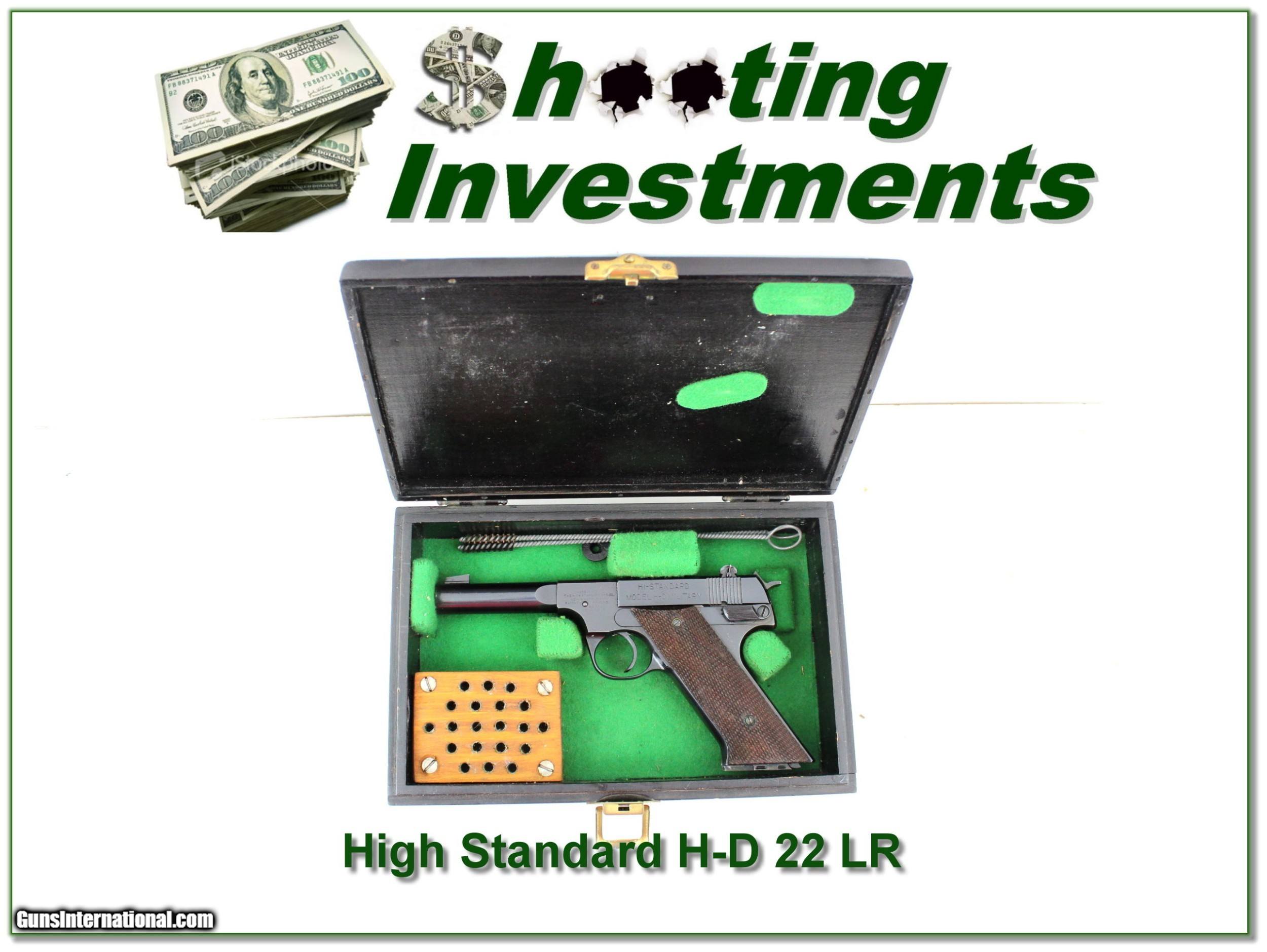 Description: Collectors, this is a top condition Hi-Standard Model HD Military 22LR. I am sure t most a few rounds fired. It has a 4.5in barrel and comes in custom fitted wooded case as pictured. I am selling this one on consignment and as such lay-a-way can’t be used. It does of course have the standard 3-day inspection. Shipping and insurance is $39. Please email me with any questions or larger pictures. (Consign your quality firearms with Shooting Investments for only 12%! Let me know if you have any you would like to sell!) 22-1085 Payment: Payment is by Money Order, Cashiers Check or Personal Check. I can now also accept Credit Cards (MasterCard, Visa, Discover & American Express) with a 3% convenience fee. Shipping: The shipping charge will be listed in each description. It is $49 for most long guns. Some heavy guns, over 48in boxes or those insured for over $2000 will be higher. Shipments to Alaska and Hawaii are higher because air shipment is required. Most firearms are shipped on Tuesday and Thursday and usually in 5 days of receipt of payment. We package all shipments carefully and insure them. Optics are shipped Priority Mail and most other non-firearm shipments are shipped First Class. Returns: Our return policy is simple. If for any reason you are not pleased with your purchase, you may return your item for a full refund of purchase price. Ammunition cannot be returned. It is important to us that you are happy. Guns cannot be fired or dissembled before returning them and they must be returned in the same condition as received. Notification of a return must occur with-in 3 days of receipt at your dealer. Shipping, convenience and dealer fees are not refundable and are the responsibility of the buyer. Lay-a-way: If needed, we offer a 60 day lay-a-way option on most firearms. It is 1/3 now, 1/3 in 30 days and 1/3 in 60 days. Lay-a-way firearm sales are final and if not completed the first payment cannot be returned. Consigning your firearms with Shooting Investments: We will help you get top dollar for your firearms. While most local guns shops charge 20% or more, our fee is only 12% with a minimum of $75. At your local gun shop it might take months to sell. Selling on-line provides instant access to thousands of interested buyers. You won’t find any other on-line dealer willing to sell your firearms for only 12% or listing every gun on 3 separate s. Selling through an House typically costs the seller 15% and the buyer an addition 15% (so 30%) and you have to wait several months to sell and longer to receive funds. If properly priced, we will sell your firearms in a few weeks. Send us an email or give us a call and we’ll explain how easy it is for you to get top dollar. Trading: Trading for use is really just buying your gun to re-sell. If you have a gun you want to trade, please email a picture and we will let you know what we can give or it. You will always get more if we sell it for you on consignment. Help for California Buyers: We are happy to ship to California. It is the buyer’s responsibility to make sure any item you buy is legal in your state. We are also happy to help with your purchase of a firearm from someone other than us. If you see a gun you would like to buy but the seller can’t or won’t ship to California they can ship to use and we’ll then ship it to your California dealer. The cost for this service is only $30 + shipping. Let us know if we can help! SOLD |