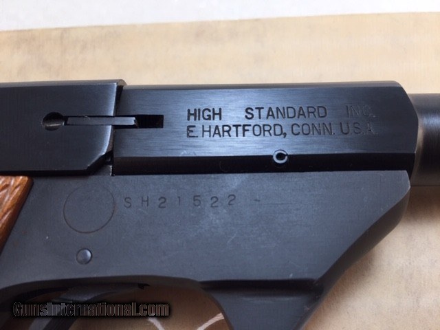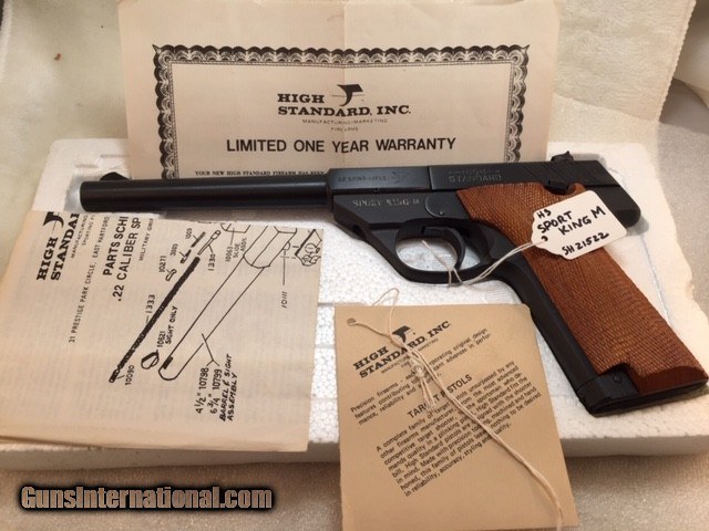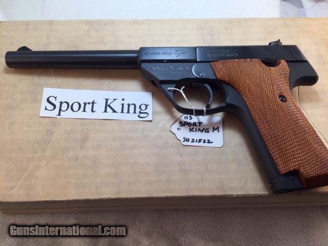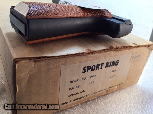 Description: As New In the Box High Standard Sport King M, 22 lr, Catalog number 9259, 6 3/4" long barrel, walnut grips, military slant grip, allen head screw takedown. This was the last of the HS series manufactured with serial number 10,000 - 35,000 with the SH pefix. Box with styroform inserts, parts list, warranty card and instructions included. Manufacured in 1982. 1 of 260,000 all Sport Kings. 1 of 23,000 all SH prefix. I've owned this since new and never shot it. Can't get much better than this one. You'll be happy! Must ship to FFL, shipping is $40 with a 3 day inspection. SOLD Manufacturer: High Standard Model: Sport King Serial Number: SH 21522 Caliber Info: 22 lr Condition: Excellent Metal Condition: excellent Wood Condition: excellent Bore Condition: excellent |