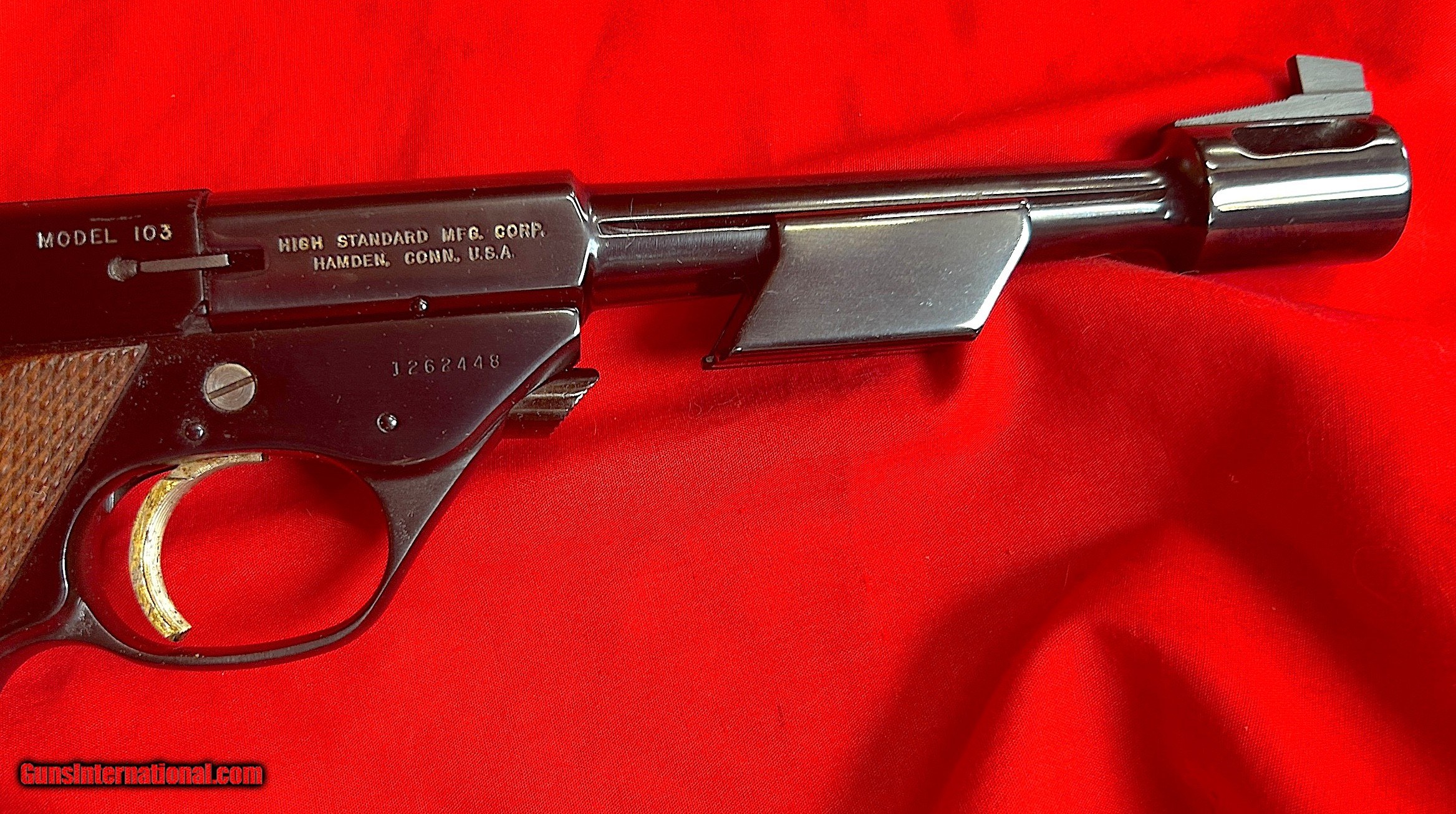 Description: If You're a Veteran, Active Duty Military, or Service Member's Family - Thank You! Offered for your consideration is an early and exceptional High Standard Olympic Trophy target pistol .22 Short with large barrel weight, serial #1262448. This early and desirable Model 103 Series pistol was produced in the Hamden, Connecticut facility. It has a 6 3/4” tapered barrel, integral muzzle brake and excellent bore with sharp lands and grooves. It has diamond checkered walnut thumbrest grips and inset High Standard gold medallions. The Olympic Model pistols feature a Patridge front sight, fully adjustable rear sight, and vertically serrated front and back grip straps. There is one 10-round factory magazine included. This would be hard one to upgrade - dont miss it! Any questions? Just ask! Reasonable offers are always considered! Please note that all of my items are subject to sale elsewhere, so if you are interested in this pistol you should buy it sooner than later before it gets sold and removed from Guns International. Shipping & Other Details: Flat fee of $25 for domestic shipping to the lower 48 States via economy ground services. Expedited shipping and insurance available at cost. Please ask any questions you may have before purchase and I would be glad to answer them. Gale River Traders has been selling onlne for more than 30 years with a stellar satisfaction rating, so buy with confidence! SOLD Curio/Relic: Yes Handgun Caliber: .22 Short Manufacturer: High Standard Model: 103 Serial Number: 1262488 Barrel Length: 6-3/4 |