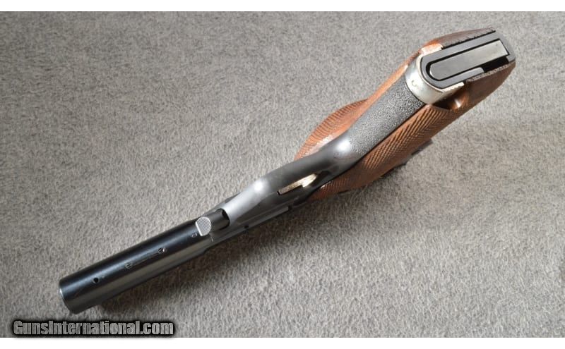 Description: Military Supermatic Citation pistol in .22 LR. This gun features a blued frame marked "Supermatic Citation Military", textured front and backstraps, checkered walnut grips with thumb rest, adjustable target sights, adjustable target trigger, blued slide with 5.5" bull barrel.The barrel is marked "Manufactured in Hamden, Conn, USA". Serial #2488706. .22 Long Rifle SOLD Chambers: Semi auto. Metal Condition: 97%. Wood Condition: 97%. Barrels: 5.5 bull barrel. Triggers: "Single, adjustable. Weight: 3 lbs Item Location: Owatonna, MN |