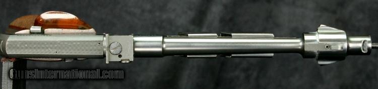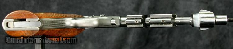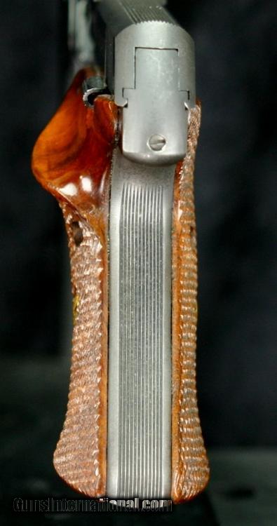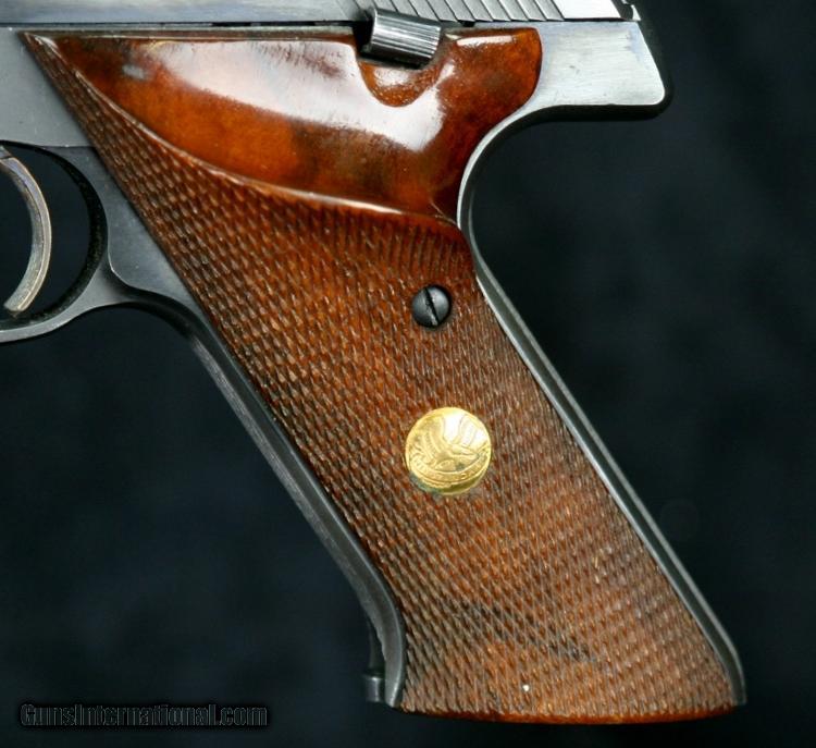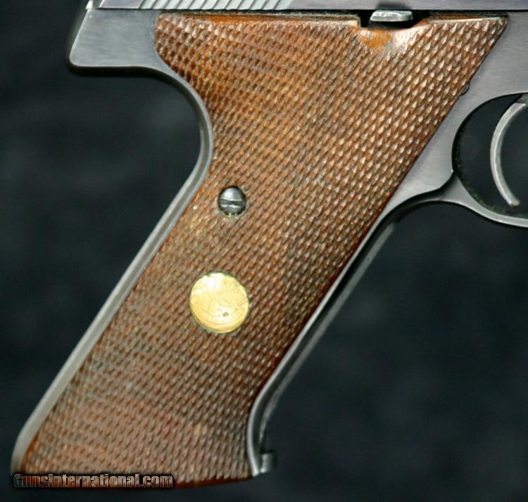 Description: #808174, .22lr, 9 inch barrel, blue finish, 2 piece wood grips, standard weights, original sights. ?Condition: mirror bore, 95% blue overall, some silver at bore and high spots, small silver spots on bottom of barrel from weight set screws, excellent grips, excellent marks, excellent mechanically. SOLD Curio/Relic: Yes |
