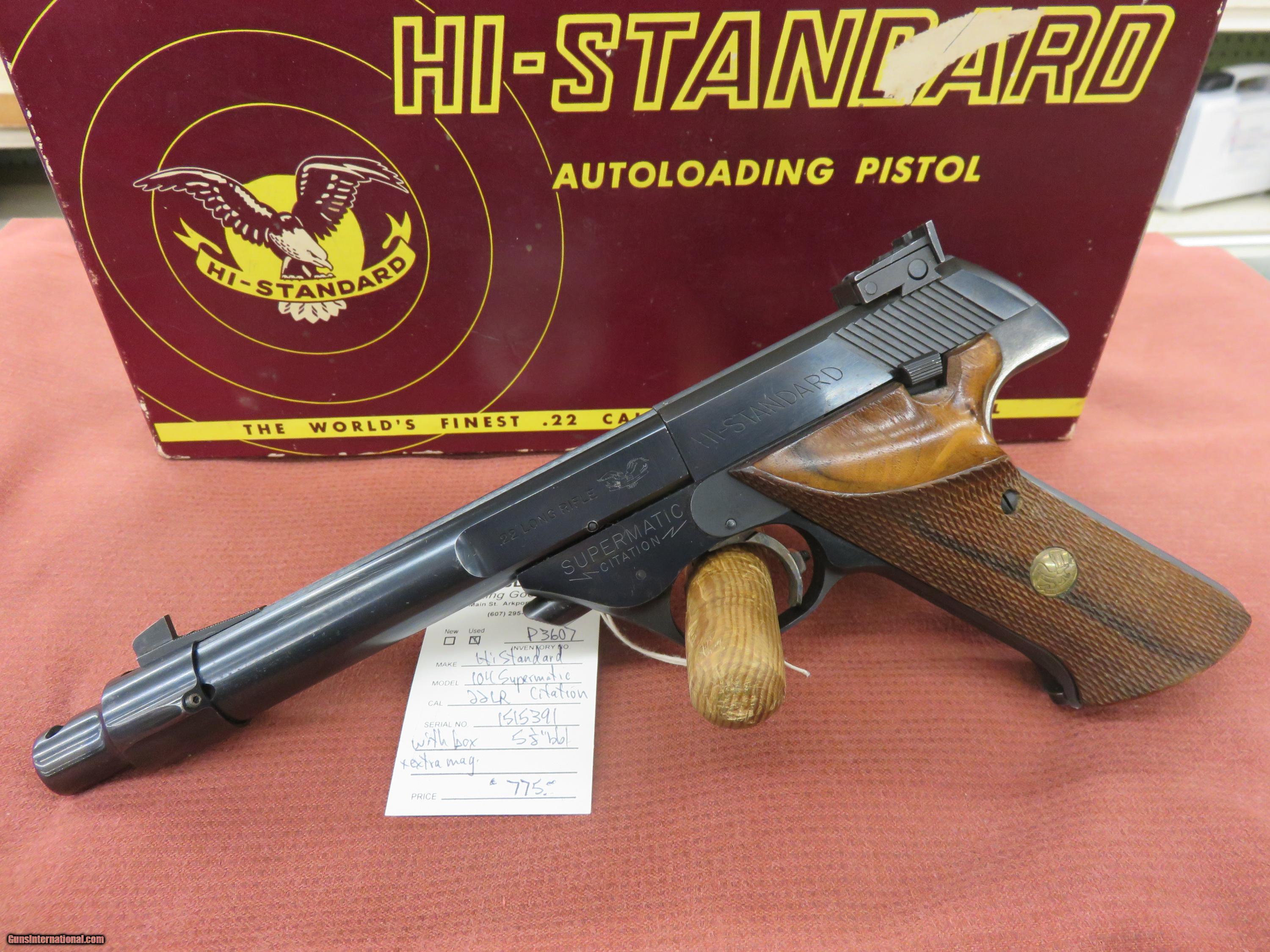 Description: High Standard Model 104 Supermatic Citation 22 LR, 5 1/2" barrel, with extra magazine, original box, & owners manual, serial #1515XXX, 98& overall. SOLD |