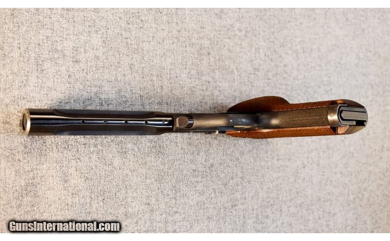 Description: This is a pre-owned High Standard model 106 Military Supermatic Trophy in .22 Long Rifle .22 Long Rifle SOLD Metal Condition: Very good overall with a small ding on the right side of the frame and a number of small scratches and rub marks Wood Condition: Very good with a few small scratches Bore Condition: Clean with good lands Barrels: 7.25 Butt Pad: Checkered walnut with thumb rest Sights: "Target front, adjustable rear Item Location: Glendale, AZ |