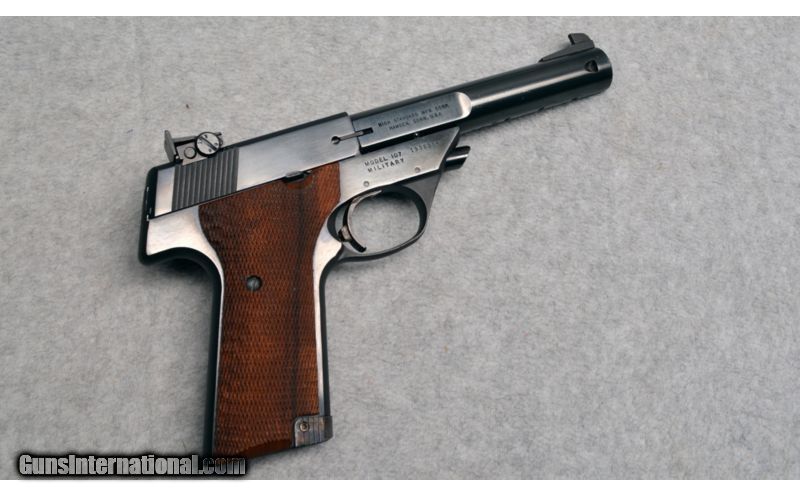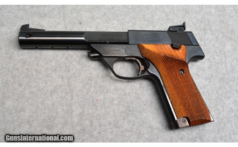 Description: This HIgh Standard rim fire pistol in in very good shape throughout. The blueing is in good condition. The checkering on the wood grips is still sharp. This pistol would make a great additon to a rim fire target collection. SOLD Manufacturer: These pistols were manufactured from 1968 - 1971. Caliber Info: .22 Long rifle. Chambers: Semi-Auto. Metal Condition: Very good with some very light surface use marks. Wood Condition: Excellent with very little signs of use. Bore Condition: Very good, bright and shiny. Barrels: 6 inch blued barrel with blade front sight. Triggers: Factory. Stock: Grips are in excellent condition. Weight: 34 oz. Sights: Front blade sight with adjustable rear target sight. Item Location: Hazelwood, MO |