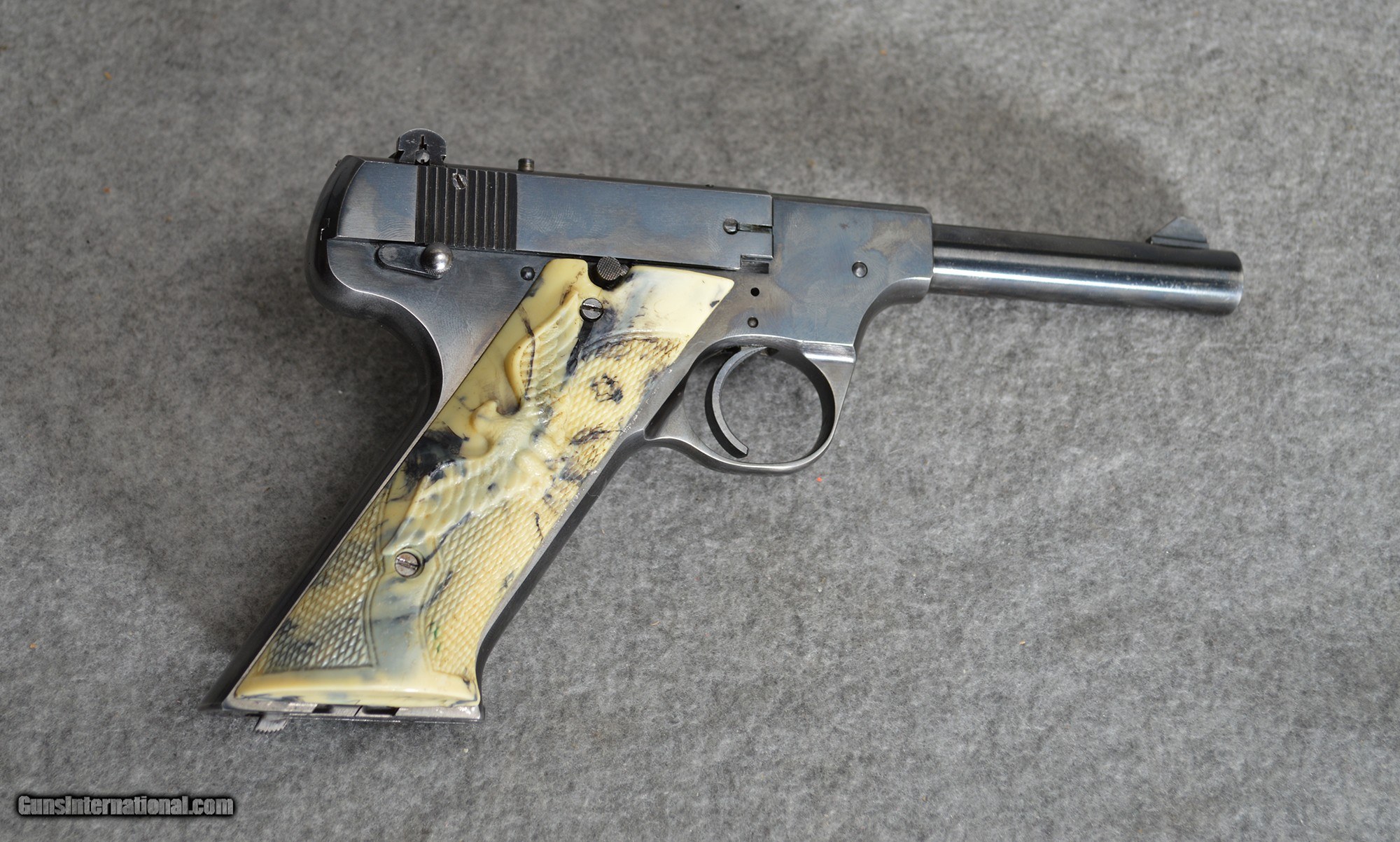 Description: Founded in the 1930s by Gus Swebilius, High Standard Manufacturing started making .22-caliber pistols at a lower price to compete with the famous Colt Woodsman pistol. The Model A was designed to be competitive in the sport of bullseye target shooting. It has adjustable sights, a long thin barrel, and rakish grips styled after the famous Luger pistol. This pistol is in excellent condition, and comes with a holster. This pistol is also equipped with after market grips. .22 Long Rifle Chambers: 22 Long Rifle Metal Condition: Excellent Bore Condition: Bright and shiny Barrels: 4.5" barrel Triggers: Crisp Weight: lbs. Sights: Iron sights Item Location: Huntsville, AL Price: $649.99 Contact Seller |
