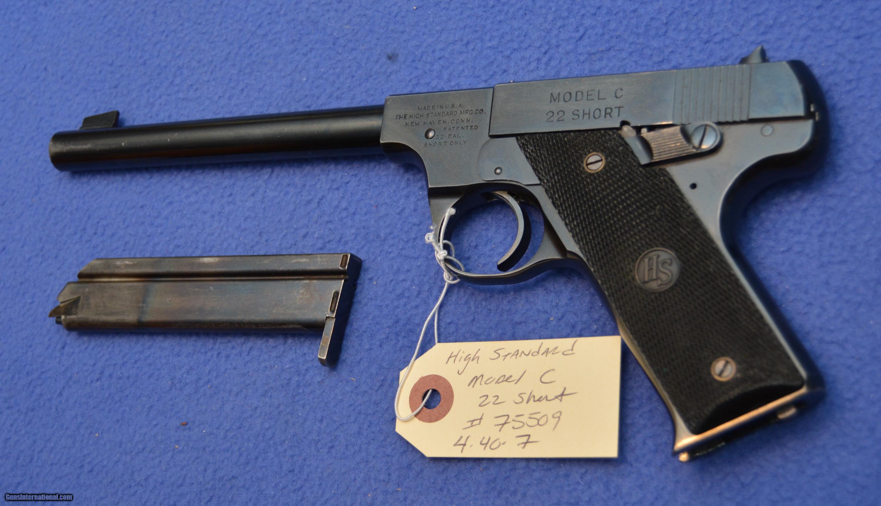 Description: High Standard Model C 22 Short One we just don’t see very often and especially in this great condition. Please find this High Standard Model C, serial # 75509, and is chambered in .22 Short. This is a New Haven Conn manufactured example. Sights are fixed and the barrel is 6 ¾-inches long. This specimen is wearing the original with the brass bolstered old style hard rubber grips with the HS logo. Pistol ships with one correct two tone magazine, please see photos. The muzzle has a perfect crown and virtually no bluing loss. There is some thinning of bluing on the barrel near the muzzle on both right and left with the left exhibiting slightly more. Please note the bluing is incredibly strong on the front and rear straps of the grip. All lettering is sharp and clear. I call this pistol 95-96% bases on the Blue Book. Yes, we can and do ship into California. Shipping will be $21.00 USPS Priority Mail. If illegal to own in your area don’t bid. Payment with US Funds from US Banks ONLY!!! We accept Cash, Checks, Money Order and US Postal Money Orders. We also accept Visa, MasterCard, AMEX and Discover at 2.8% service fee. We do have a law away plan for all our items. All items ship when final payment clears, no exceptions. Sorry we cannot accept PayPal for firearms or ammunition, their policy not ours. We cannot accept PayPal for firearms or ammunition, their rules not ours. Call 865-805-1187 for details or questions. Out of state buyers no sales tax yet. Local buyers must pay 9.50% TN sales tax and $10.00 TBI state back ground check fee. Please encourage your congressman and senator to vote against an internet sales tax and instead encourage local shops to hire persons to post on the web. I’ve done both! SOLD Curio/Relic: Yes Manufacturer: High Standard Model: Model C Serial Number: 75509 Caliber Info: 22 Short Bore: Excellent Chambers: Excellent Condition: 95-96 Metal Condition: 95 Stock: Hard Rubber Excellent |