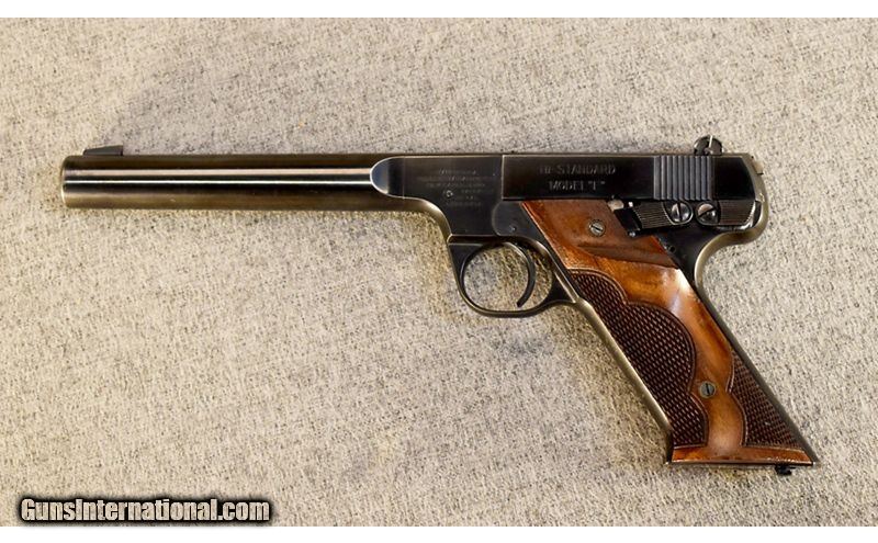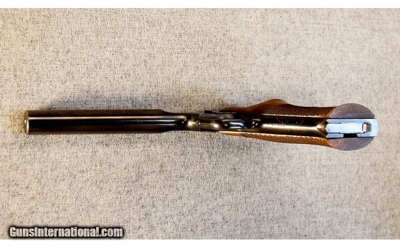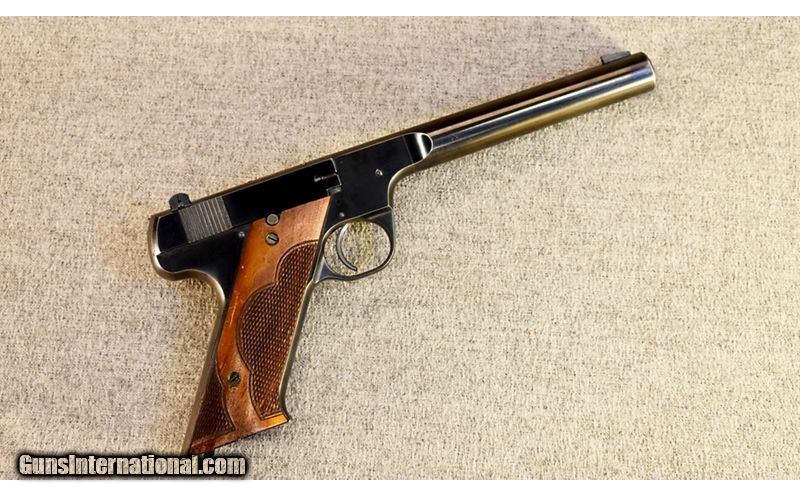 Description: This is a pre-owned High Standard model E in .22 Long Rifle with Roper grips manufactured in 1939, one of 2600 made from 1938 to 1942 .22 Long Rifle SOLD Metal Condition: "Quite good overall with a number of small scratches, light wear in the bluing at the muzzle and light freckling on the grip frame Wood Condition: Quite good with some handling wear Bore Condition: Clean with bright lands Barrels: 6 3/4 Butt Pad: Roper target grips Weight: 2 Lbs. 12 Oz. Sights: "Blade front, adjustable rear Item Location: Glendale, AZ |
