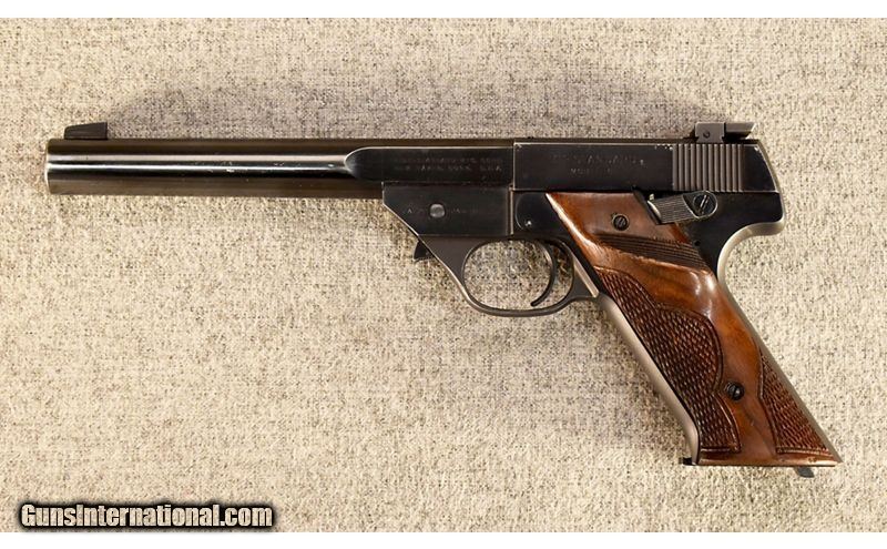 Description: This is a pre-owned High Standard model GE with Roper grips and 6 3/4 inch barrel in .22 Long Rifle .22 Long Rifle SOLD Metal Condition: 90% of the bluing remains with light wear on the grip frame and the edges of the slide and barrel plus a number of small scratches Wood Condition: Quite good condition showing some handling wear and a few scratches and small dents Bore Condition: Clean with good lands Barrels: 6 3/4 Butt Pad: Hand checkered Roper grips Weight: 2 Lbs. 12 Oz. Sights: "Blade front, adjustable rear Item Location: Glendale, AZ |