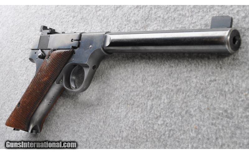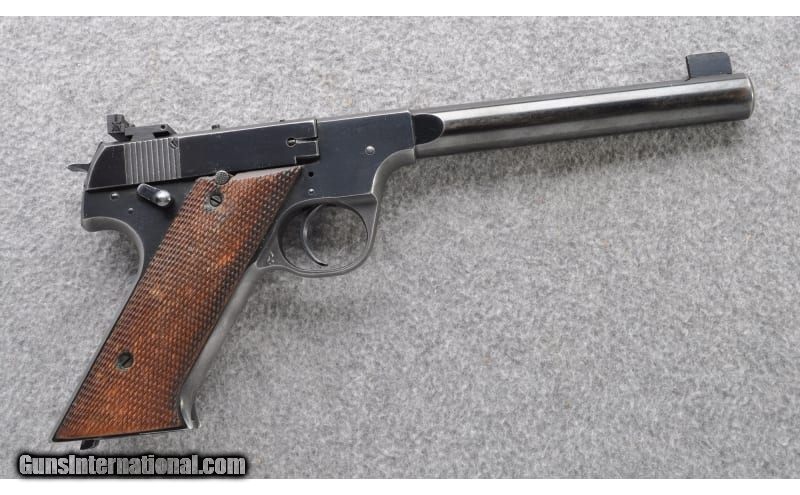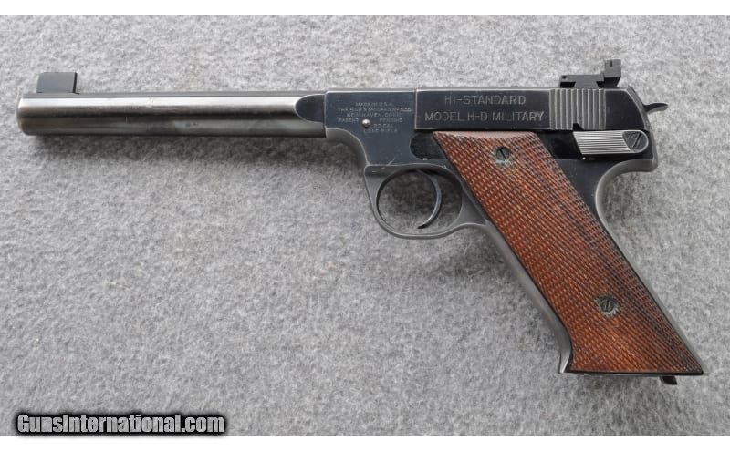 Description: This High Standard HD-Military model was most likely shipped in 1948 and appears in good condition with a new recoil spring. .22 Long Rifle SOLD Curio/Relic: Yes Chambers: .22 Long Rifle in a ten round detachable magazine semiautomatic rimfire pistol Metal Condition: "Good, with some blue wear at the carry points, muzzle and trigger guard Wood Condition: Grips show moderate wear with a few flat spots in the checkered fields Bore Condition: Bright Barrels: 6 3/4 Triggers: Single action Weight: 40 Oz. Sights: "Patridge style front blade, adjustable leaf rear Item Location: Grand Junction, CO |
