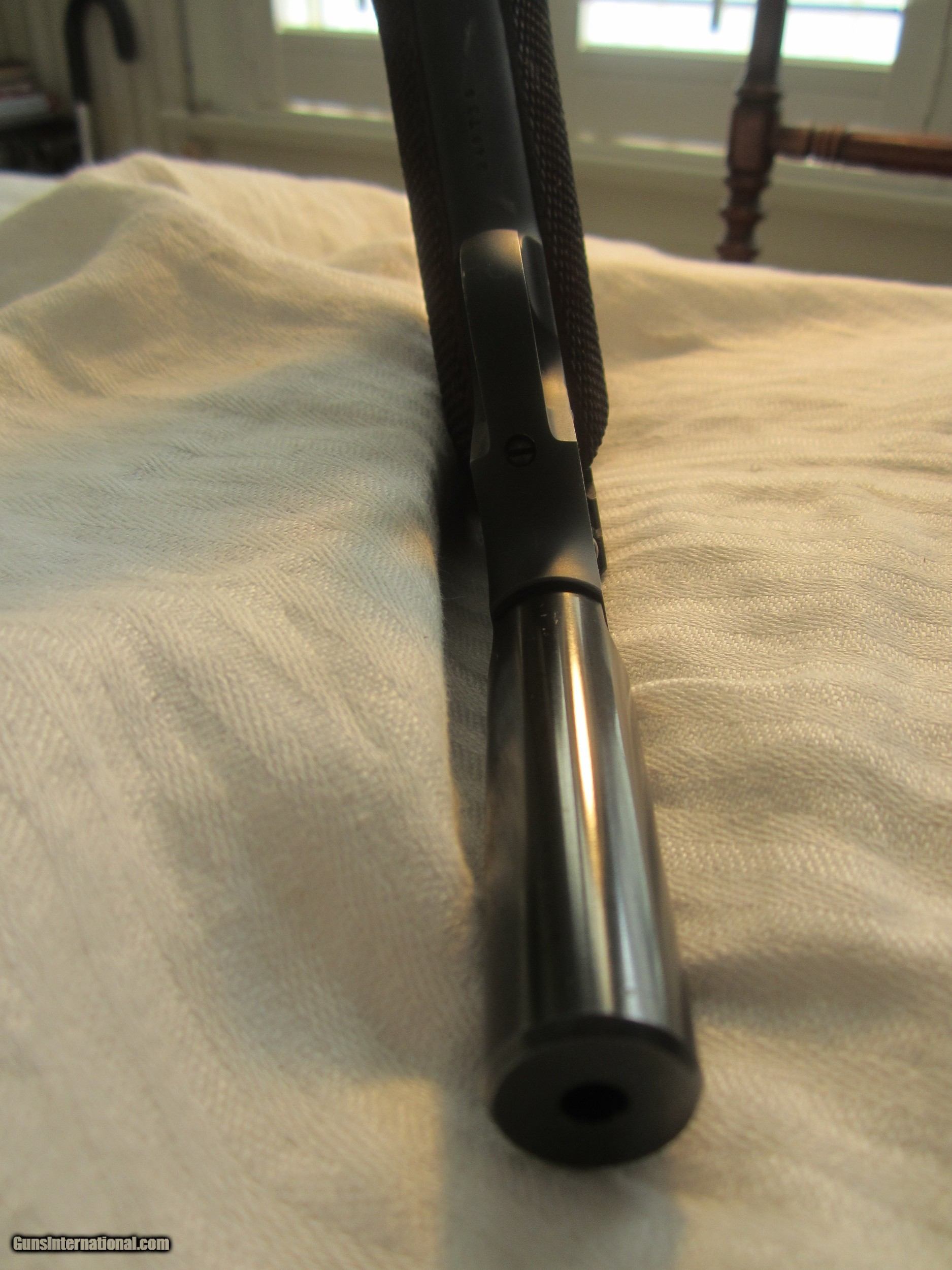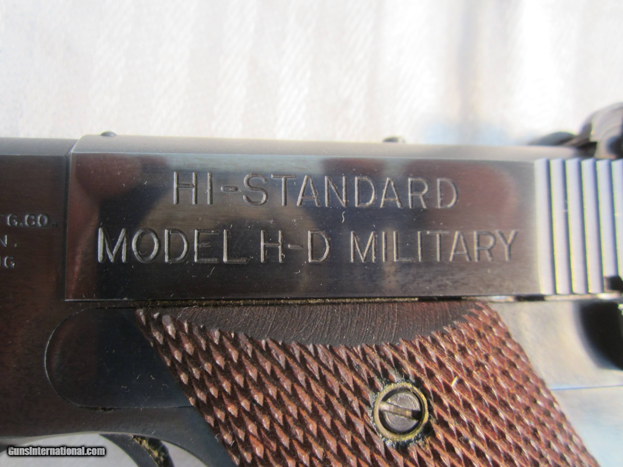 Description: A nice High Standard made in 1948 and in 98-99% condition as to metal and wood. The caliber is .22LR, the magazine holds 10 rounds, the barrel is 4 & 1/2" long. The metal is blued with a dull blue finish on the top of the barrel,trigger guard and the front and back of the grips. The grips are checkered walnut. The hammer is exposed, a 2nd magazine is included, the rear sight is adjustable, and a factory instruction sheet plus 2 instruction cards are all included. This model was made from 1946 to 1955.The original factory box is also included but it is in poor condition-taped all around. A no interest payment plan is available. See more High Standard and other listings under "ROMSEY". SOLD Manufacturer: The High Standard fg. Co., New Haven, Conn. Model: Model H-D Military Serial Number: 240736 Barrel Length: 4 & 1/2 Caliber Info: .22LR Bore: rifled Condition: 98+% Metal Condition: 98-99% Wood Condition: 98-99% Bore Condition: bright/shiney Barrels: one Barrel Type: round Action: semi-automatic Triggers: one Stock: checkered walnut grips Finish: Blued Sights: front & rear Manufacture Date: 1948 Engraving: none Extras: 22nd mag.,box,.,inst. sheet Item Location: San Diego, California |