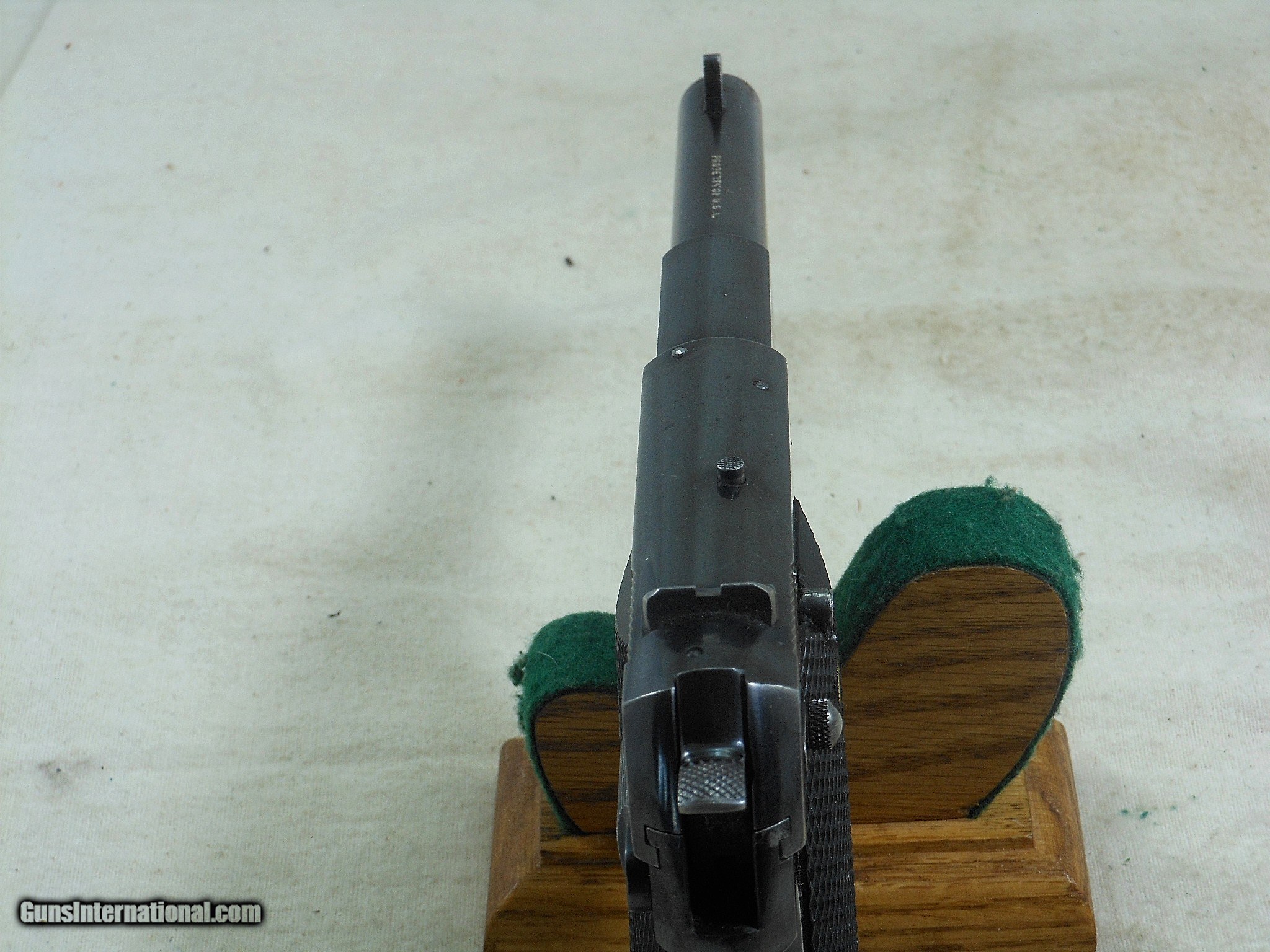 Description: SOLD This High Standard was purchased by the military during World War 2 This pistol's serial number is 113860. It has the 4 1/2 inch barrel. The bore is bright and clean. The action is smooth and operates correctly. The original wood grips are in fine condition. The original bluing would rate a 96% overall. The top of the barrel is stamped - Property of U.S.A. The right side of this pistol above the barrel retaining pin is stamped- Property of U.S. and below that the ordnance wheel. The magazine is a correct High Standard magazine This is a highly collectable historical High Standard that saw war time service as a training pistol. The original box is in good condition showing wear and some loss around the edges, The labels are intact clear and bright. There is some tape supporting the top box corners. This is a great condition High Standard Military model That served our troops in World War2 This pistol will certainly appeal to the military collector as well as the High Standard collector! Curio&Relic J.M.C. Consn. (10) F. No. 568 -21 SOLD Curio/Relic: Yes Handgun Caliber: .22 Long Rifle Manufacturer: High Standard Model: H-D Military Serial Number: 113860 Barrel Length: 4 1/2 Inch Chambers: Very Fine Condition: 96% Overall Metal Condition: Very Fine Wood Condition: Very Fine Bore Condition: Very Fine Barrels: Pistol Barrel Type: Military Action: Self Loading Finish: Blued Sights: Target Manufacture Date: W.W.2 Extras: Original Box |