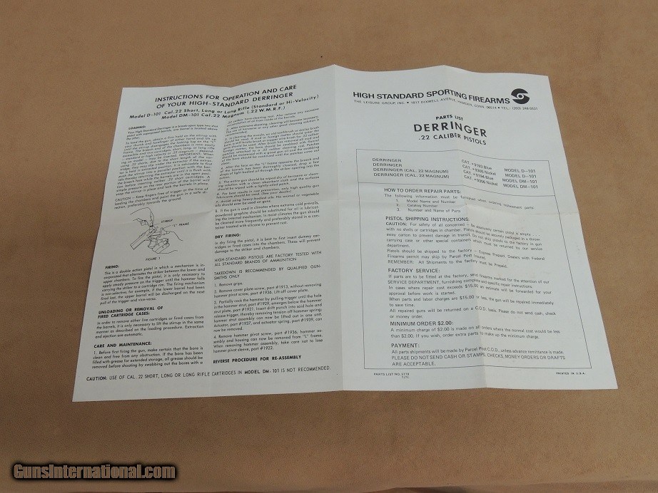 Description: *Free Layaway 150 days/ 5 months, No Interest, Pay any way, any time you like over the term, Deposit required* High Standard Nickel .22 Magnum Derringer in Box, Model DM-101 Hamden , CT production, Jewelry style case with instructions, 99% condition Curio & Relic eligible $500 *Helpful Information* *Please make sure to include our inventory number and or Item description in text messages * *If this item has the Box, Papers or various extra items they will be pictured and described* *This item listing is in stock and available for purchase unless the Sale Pending Tag is present.* *Sorry no sales to California* *Payment Options* *Visa, Master Card, Postal Money Order, Cashiers Checks, Personal Checks (Item held until Check Cleared),* *The listed price reflects a waived convenience fee* *GA residents 8% sales Tax Applies* *Best Phone Number for Calls or Text 229-424-8450* *Shipping & Insurance $50.00* *Our 27th year full time in the Quality Arms business* *We started listing with GunsInternational since the beginning 03/20/2007* Curio/Relic: Yes Price: $500.00 Shipping: $50.00 Contact Seller |