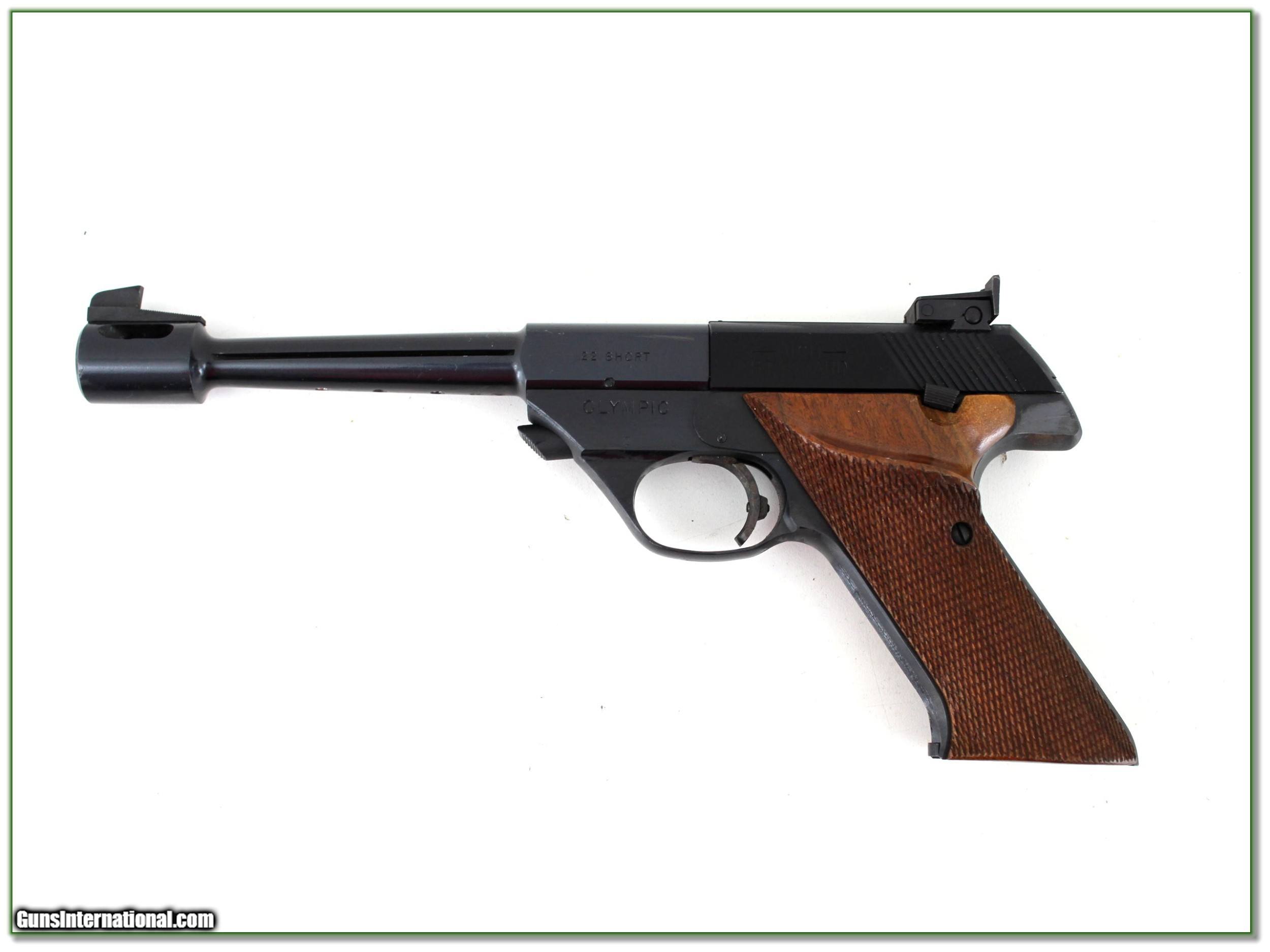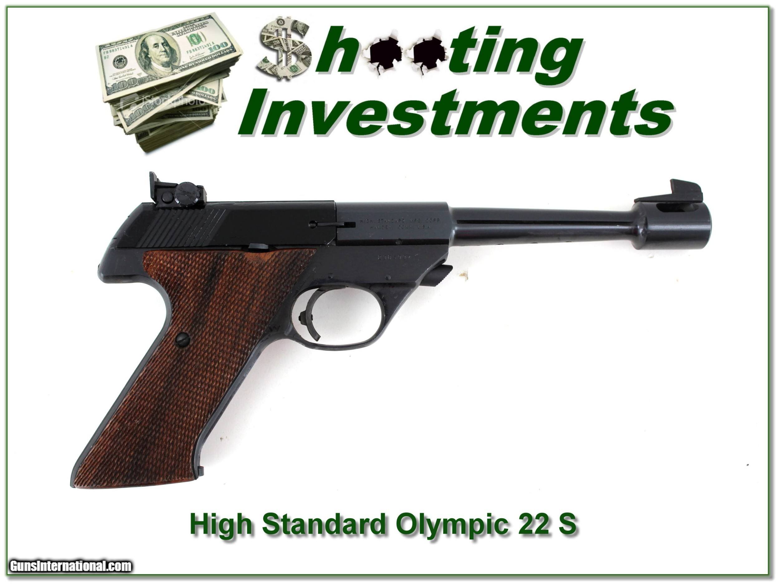 Description: Collectors, this is a top collector condition High Standard Olympic in 22 Short. It has a 6.75in ported and weighted barrel with no marks I find on metal or grips. I am selling this one on consignment and as such lay-a-way can’t be used. It does of course have the standard 3-day inspection. Shipping and insurance is $39. Please email me with any questions or larger pictures. (Consign your quality firearms with Shooting Investments for only 12%! Let me know if you have any you would like to sell!) 22-1078 Payment: Payment is by Money Order, Cashiers Check or Personal Check. I can now also accept Credit Cards (MasterCard, Visa, Discover & American Express) with a 3% convenience fee. Shipping: The shipping charge will be listed in each description. It is $49 for most long guns. Some heavy guns, over 48in boxes or those insured for over $2000 will be higher. Shipments to Alaska and Hawaii are higher because air shipment is required. Most firearms are shipped on Tuesday and Thursday and usually in 5 days of receipt of payment. We package all shipments carefully and insure them. Optics are shipped Priority Mail and most other non-firearm shipments are shipped First Class. Returns: Our return policy is simple. If for any reason you are not pleased with your purchase, you may return your item for a full refund of purchase price. Ammunition cannot be returned. It is important to us that you are happy. Guns cannot be fired or dissembled before returning them and they must be returned in the same condition as received. Notification of a return must occur with-in 3 days of receipt at your dealer. Shipping, convenience and dealer fees are not refundable and are the responsibility of the buyer. Lay-a-way: If needed, we offer a 60 day lay-a-way option on most firearms. It is 1/3 now, 1/3 in 30 days and 1/3 in 60 days. Lay-a-way firearm sales are final and if not completed the first payment cannot be returned. Consigning your firearms with Shooting Investments: We will help you get top dollar for your firearms. While most local guns shops charge 20% or more, our fee is only 12% with a minimum of $75. At your local gun shop it might take months to sell. Selling on-line provides instant access to thousands of interested buyers. You won’t find any other on-line dealer willing to sell your firearms for only 12% or listing every gun on 3 separate s. Selling through an House typically costs the seller 15% and the buyer an addition 15% (so 30%) and you have to wait several months to sell and longer to receive funds. If properly priced, we will sell your firearms in a few weeks. Send us an email or give us a call and we’ll explain how easy it is for you to get top dollar. Trading: Trading for use is really just buying your gun to re-sell. If you have a gun you want to trade, please email a picture and we will let you know what we can give or it. You will always get more if we sell it for you on consignment. Help for California Buyers: We are happy to ship to California. It is the buyer’s responsibility to make sure any item you buy is legal in your state. We are also happy to help with your purchase of a firearm from someone other than us. If you see a gun you would like to buy but the seller can’t or won’t ship to California they can ship to use and we’ll then ship it to your California dealer. The cost for this service is only $30 + shipping. Let us know if we can help! SOLD |