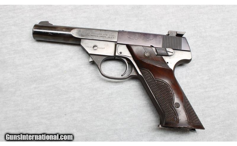 Description: Standard Mfg. model Olympic semi auto pistol chambered in .22 Short. This pistol, made in New Haven, features a 4-1/2" heavy barrel with ramp front and adjustable u-notch rear sight, high polish blued frame and slide and fancy checkered walnut target grip panels. Included is one unmarked magazine. The overall condition is very good. It retains most of its original blued finish with slight pitting. The grip panels show many handling marks but are also very good. The bore is bright with sharp rifling and the action functions as expected. The pistol was made between 1951 and 1953. .22 Short SOLD Curio/Relic: Yes Metal Condition: Very good with slight pitting Wood Condition: Very good with many handling marks Bore Condition: Bright Barrels: 4 1/2 Inches Triggers: Factory Sights: Adjustable rear notch sight Item Location: La Vista, NE |