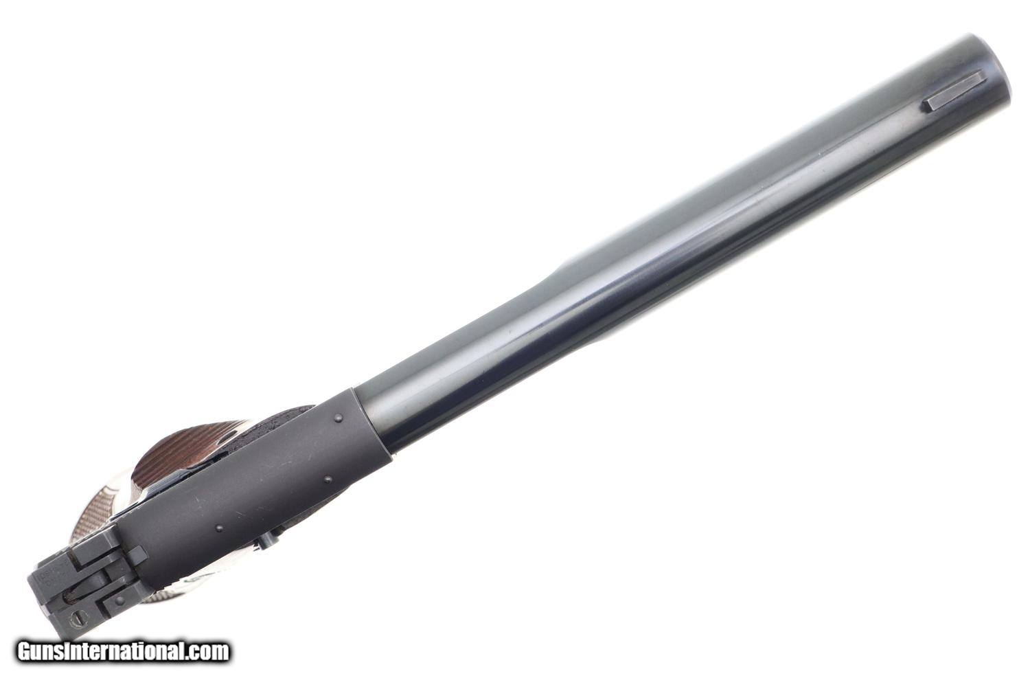 EXC with minimal sharp edge wear at muzzle and a few other minor handling marks. Negligible thinning of straps. Comparable condition grips and magazine. Mirror bore. Perfect manual mechanics. An exceptionally nice example of one of the scarcer, top quality, High Standard Target Pistols.