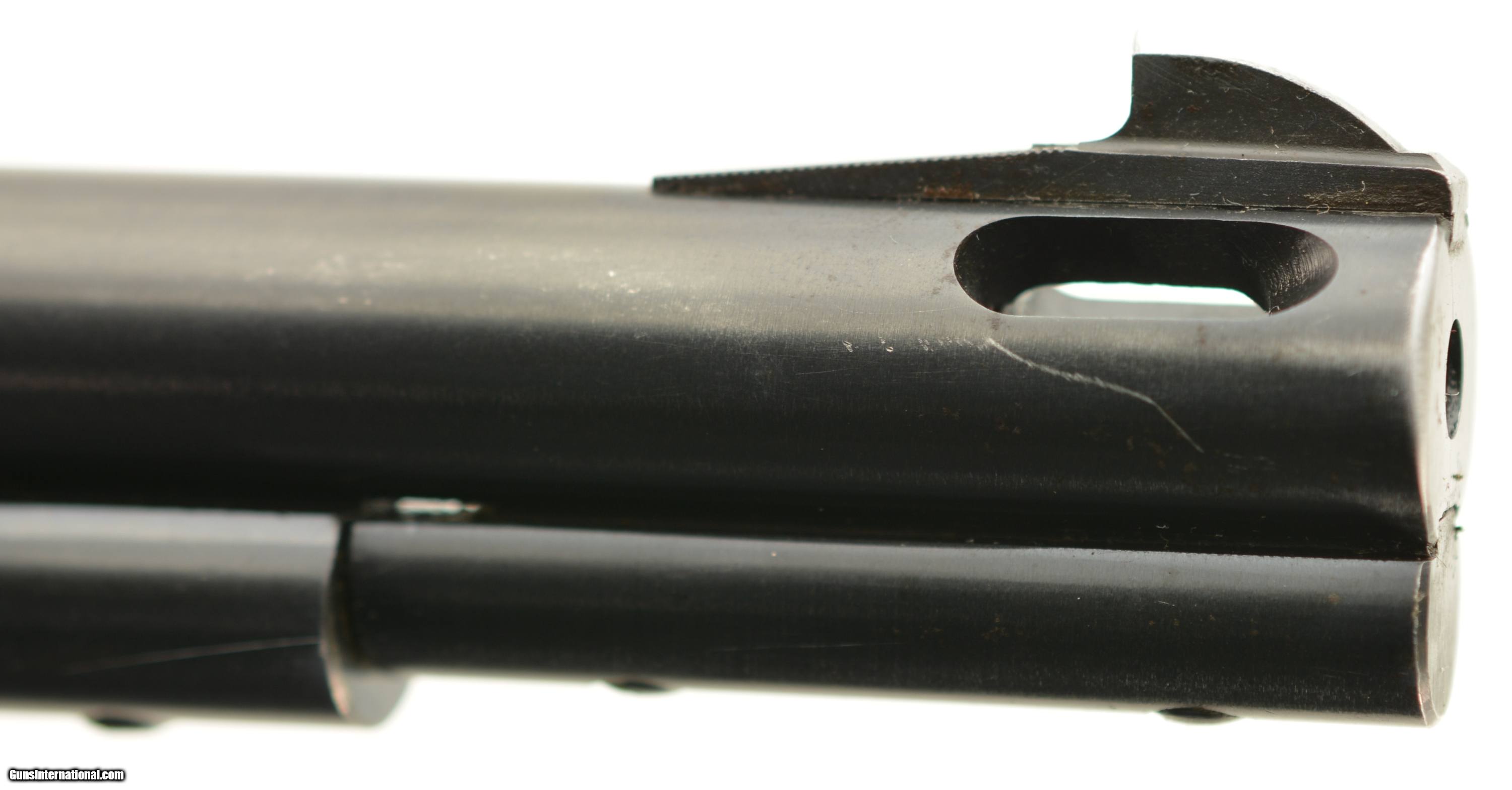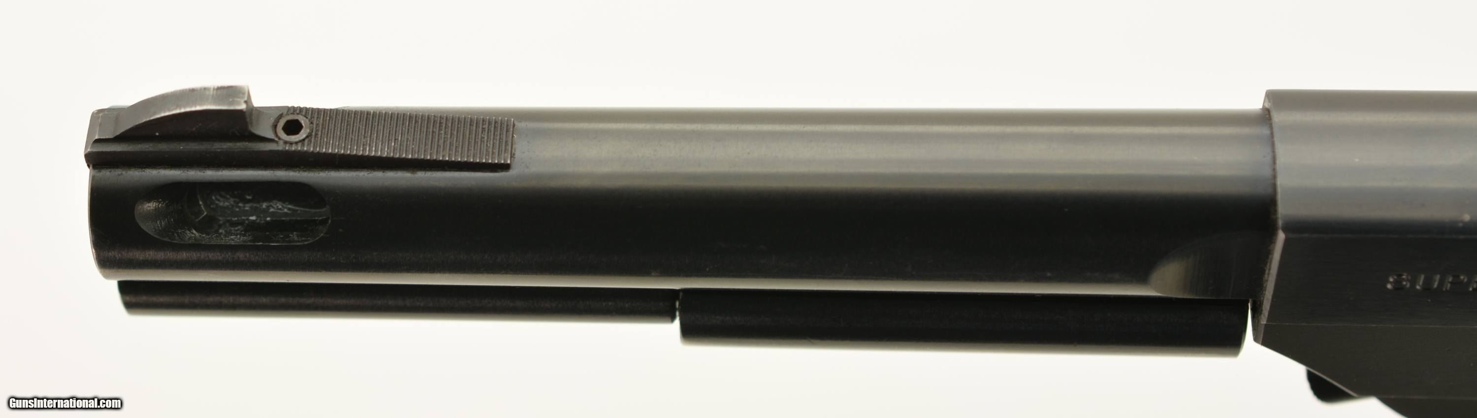 Description: Serial #717201, .22 LR, 6 3/4" barrel with a bright, excellent bore. This is a 101 Series (Third Model) High Standard Supermatic pistol produced between 1954 and 1957. The gun features two removable barrel weights (one 3 ounce and one 2 ounce), push button takedown, integral muzzle brake, slide lock, trigger stop, adjustable rear sight and one ten round magazine. The barrel, slide and weights retain between 90 – 95% of the original blue finish that has thinned with holster wear on the sides with several light scratches. The matte frame has light use marks with two piece, thumb rest walnut grips that have repaired cracks, one on each panel that run with the grain and appear stable. A very nice third model Supermatic that is ready for the range. FFL or C&R SOLD Curio/Relic: Yes Manufacturer: High Standard Model: S-101 Caliber Info: .22 Gauge Info: .22 |