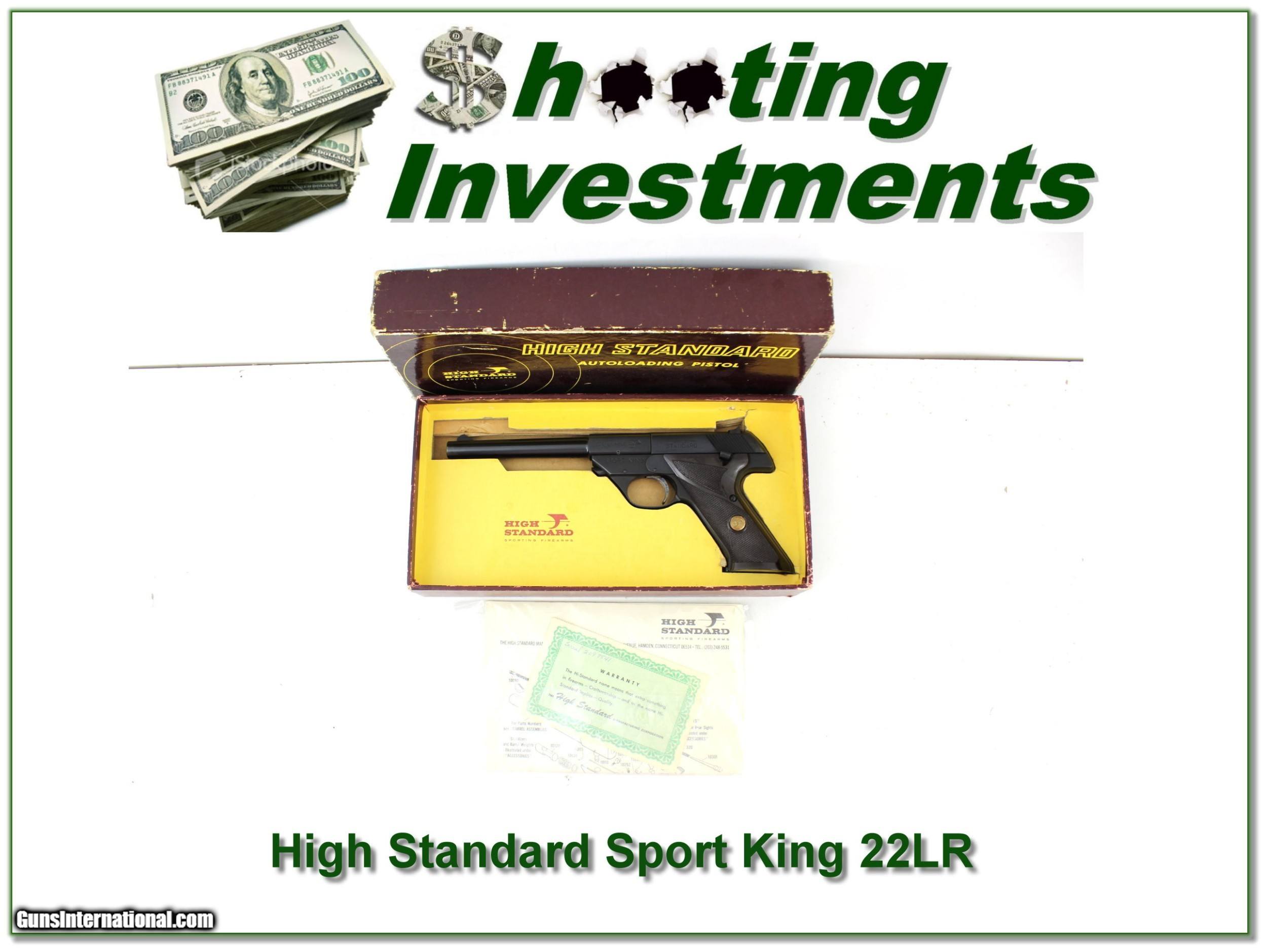 Description: Shooters and collectors, this is a new condition and I believe unfired High Standard Sport King 22 semi-auto. It has a 6.75in barrel and comes as seen in original box with papers. I don’t think you can find a nicer one! I am selling this one on consignment and as such lay-a-way can’t be used. It does of course have the standard 3-day inspection. Shipping and insurance is $39. Please email me with any questions or larger pictures. (Consign your quality firearms with Shooting Investments for only 12%! Let me know if you have any you would like to sell!) 21-1252 Payment: Payment is by Money Order, Cashiers Check or Personal Check. I can now also accept Credit Cards (MasterCard, Visa, Discover & American Express) with a 3% convenience fee. Shipping: The shipping charge will be listed in each description. It is $39 for most firearms. Some heavy guns or those insured for over $2000 will be higher. Shipments to Alaska and Hawaii are higher because air shipment is required. Most firearms are shipped on Tuesday and Thursday and usually in 5 days of receipt of payment. We package all shipments carefully and insure them. Optics are shipped Priority Mail and most other non-firearm shipments are shipped First Class. Returns: Our return policy is simple. If for any reason you are not pleased with your purchase, you may return your item for a full refund of purchase price. Ammunition cannot be returned. It is important to us that you are happy. Guns cannot be fired or dissembled before returning them and they must be returned in the same condition as received. Notification of a return must occur with-in 3 days of receipt at your dealer. Shipping, convenience and dealer fees are not refundable and are the responsibility of the buyer. Lay-a-way: If needed, we offer a 60 day lay-a-way option on most firearms. It is 1/3 now, 1/3 in 30 days and 1/3 in 60 days. Lay-a-way firearm sales are final and if not completed the first payment cannot be returned. Consigning your firearms with Shooting Investments: We will help you get top dollar for your firearms. While most local guns shops charge 20% or more, our fee is only 12% with a minimum of $75. At your local gun shop it might take months to sell. Selling on-line provides instant access to thousands of interested buyers. You won’t find any other on-line dealer willing to sell your firearms for only 12% or listing every gun on 3 separate s. Selling through an House typically costs the seller 15% and the buyer an addition 15% (so 30%) and you have to wait several months to sell and longer to receive funds. If properly priced, we will sell your firearms in a few weeks. Send us an email or give us a call and we’ll explain how easy it is for you to get top dollar. Trading: Trading for use is really just buying your gun to re-sell. If you have a gun you want to trade, please email a picture and we will let you know what we can give or it. You will always get more if we sell it for you on consignment. Help for California Buyers: We are happy to ship to California. It is the buyer’s responsibility to make sure any item you buy is legal in your state. We are also happy to help with your purchase of a firearm from someone other than us. If you see a gun you would like to buy but the seller can’t or won’t ship to California they can ship to use and we’ll then ship it to your California dealer. The cost for this service is only $30 + shipping. Let us know if we can help! SOLD |