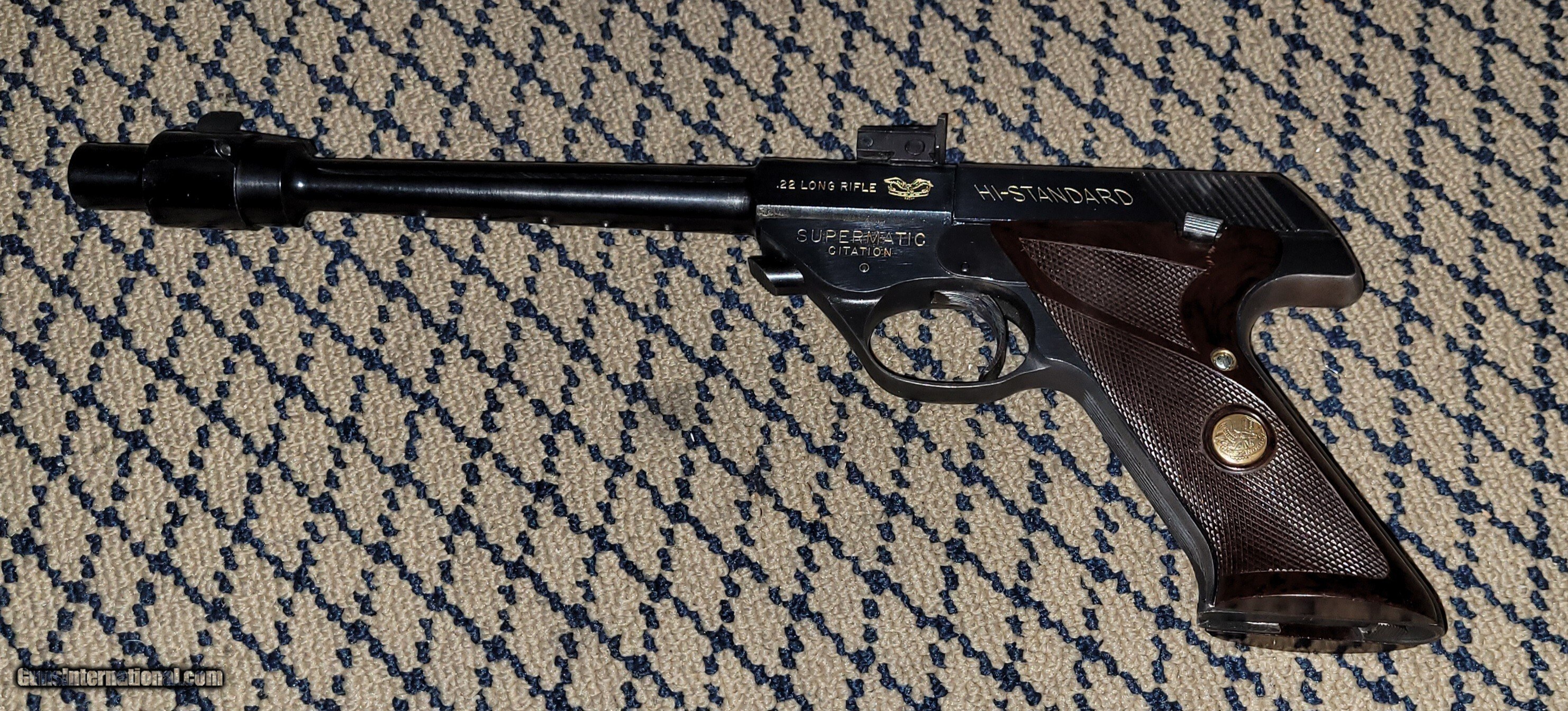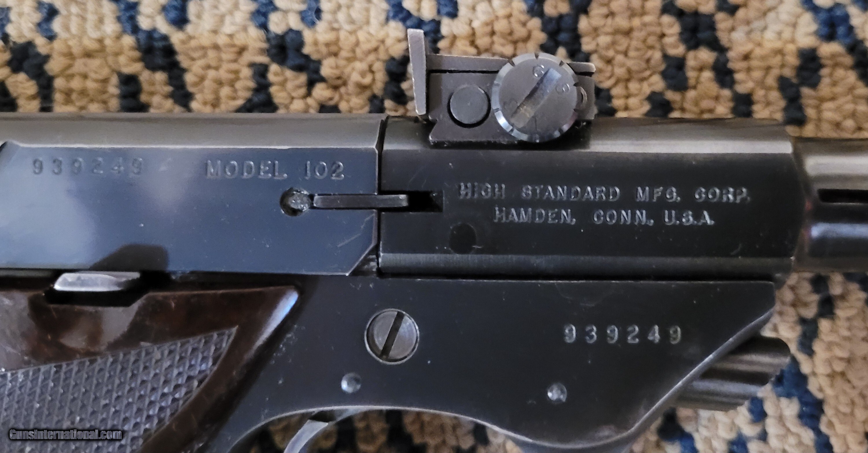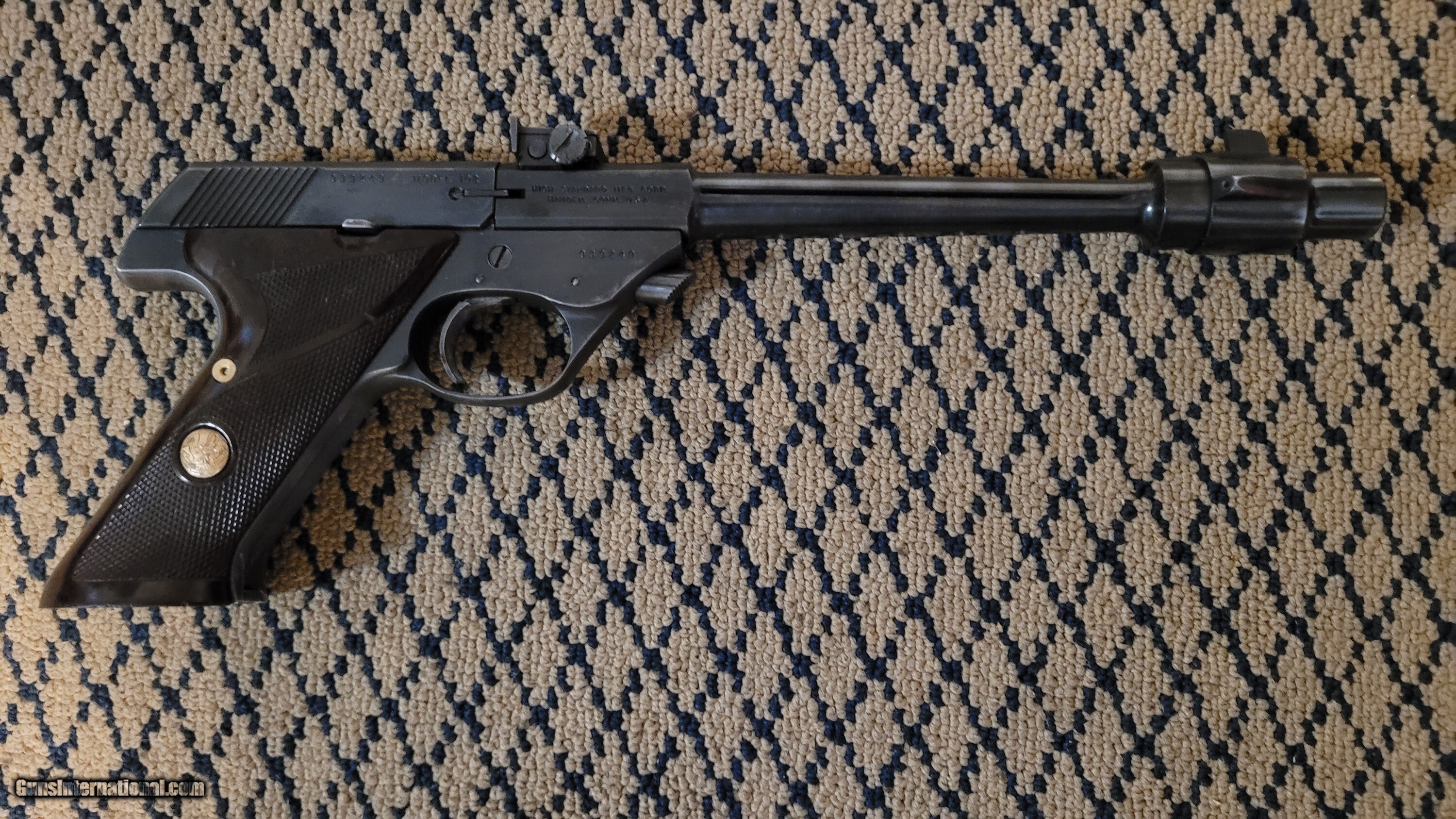 Description: A classic target competition pistol designed for accurate rapid fire shooting. This High Standard model 102 Citation in .22LR sports an unique 9 inch barrel with a muzzle flip counter weight and a vertically vented muzzle brake that improve rapid fire target reacquisition. The adjustable sights allow for very minor tweaks to achieve perfection. The secure cross-cut grips have an alternate angled thumb rest for a comfortable grip. Its unusual appearance earned it the nickname "Space gun". This firearm would make a fine addition to any collection of specialized pistols. Shipping and Insurance is a flat $45 to an FFL Dealer near you. If you do not have a preferred FFL, then I can help you find one near you that will accept the delivery and handle the transfer of ownership. If you have any questions about this firearm, call, text, or email me. I always enjoy talking with fellow shooting and hunting enthusiasts. Handgun Caliber: .22 Long Rifle Manufacturer: High Standard Model: 102 / Citation Serial Number: 939249 Barrel Length: 9 inch Condition: Excellent Metal Condition: Excellent Wood Condition: Excellent Bore Condition: Excellent Action: Semiautomatic Sights: Iron, adjustable Grips: Synthetic Price: $1,195.00 Contact Seller |