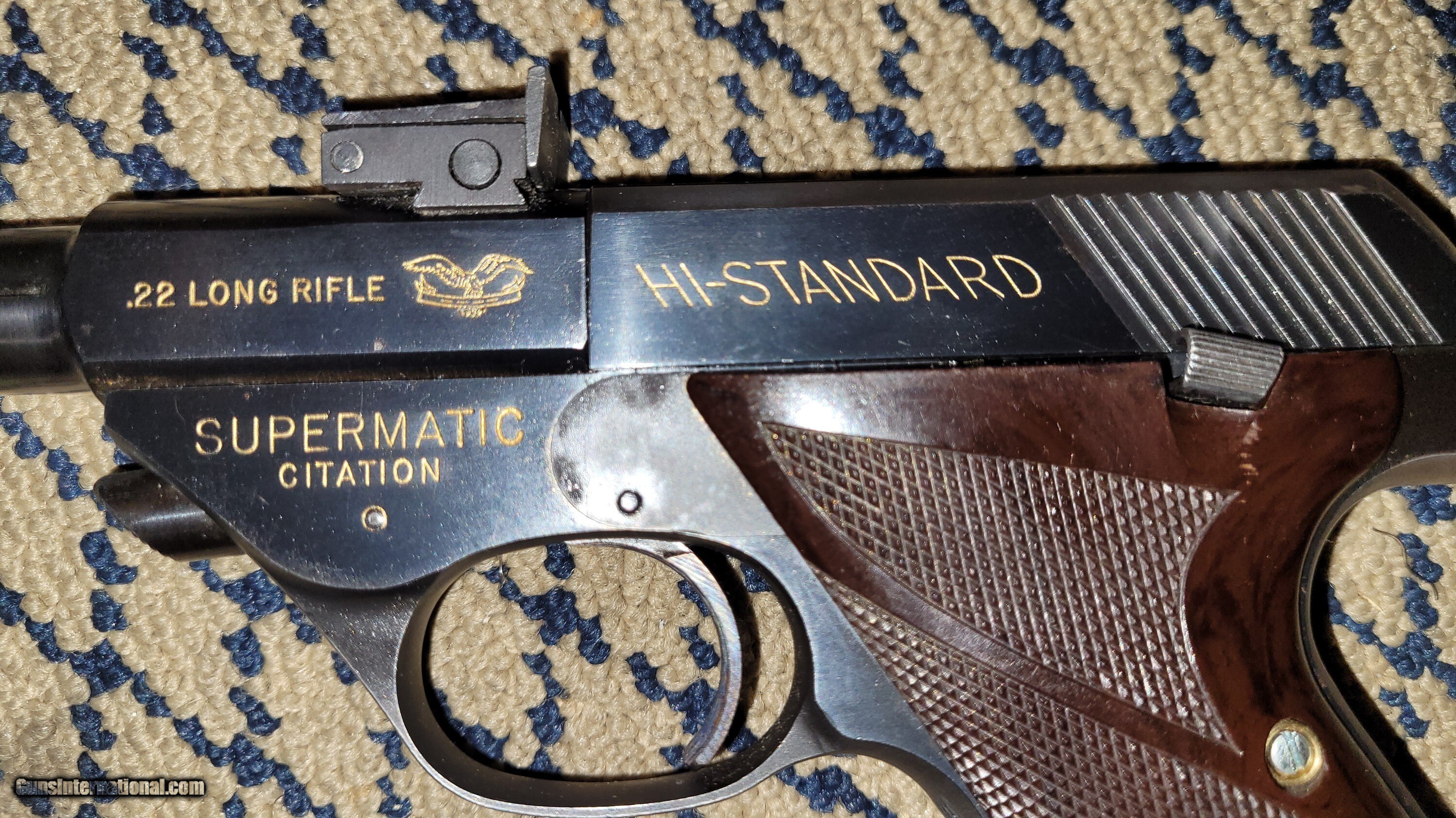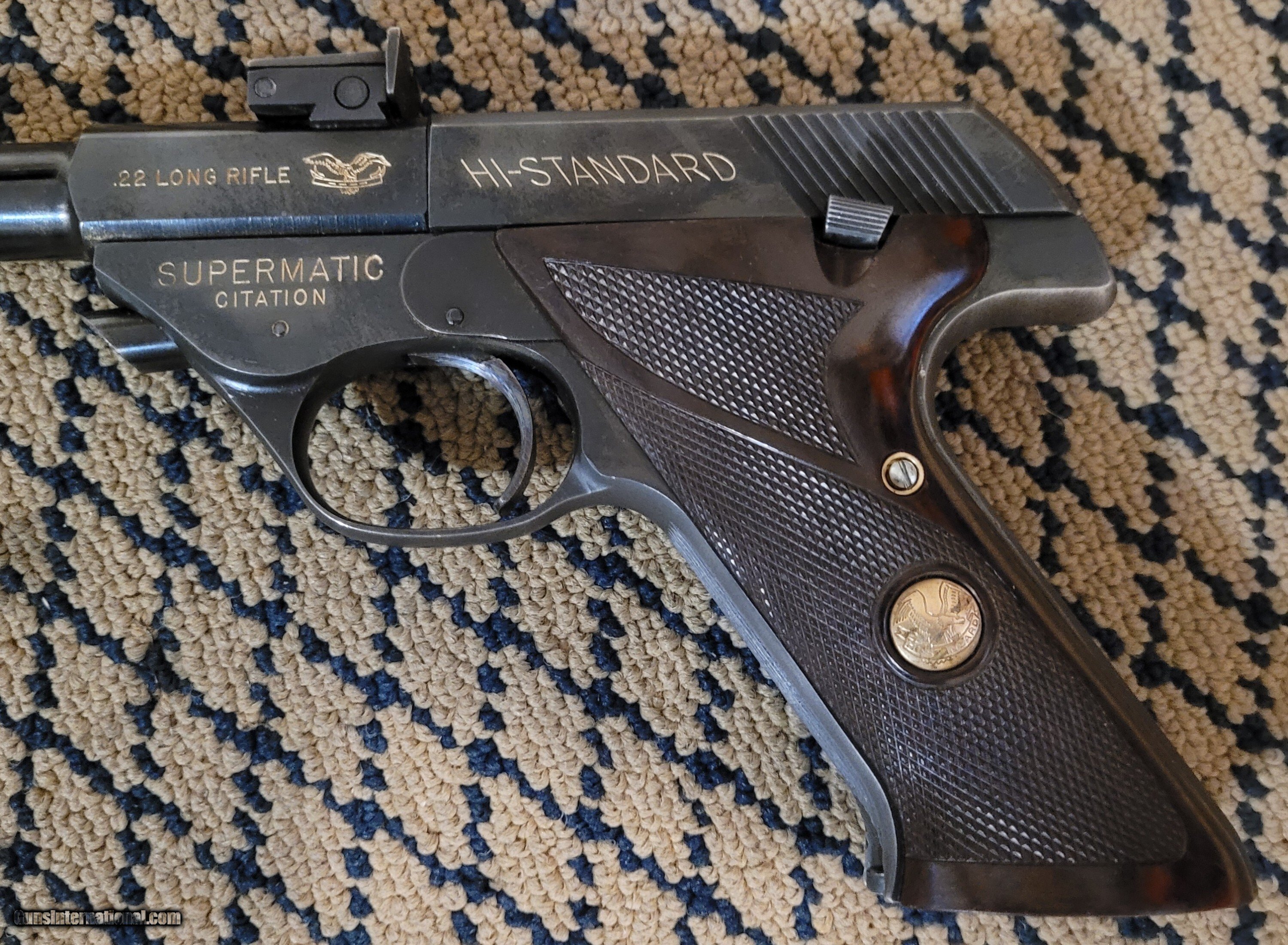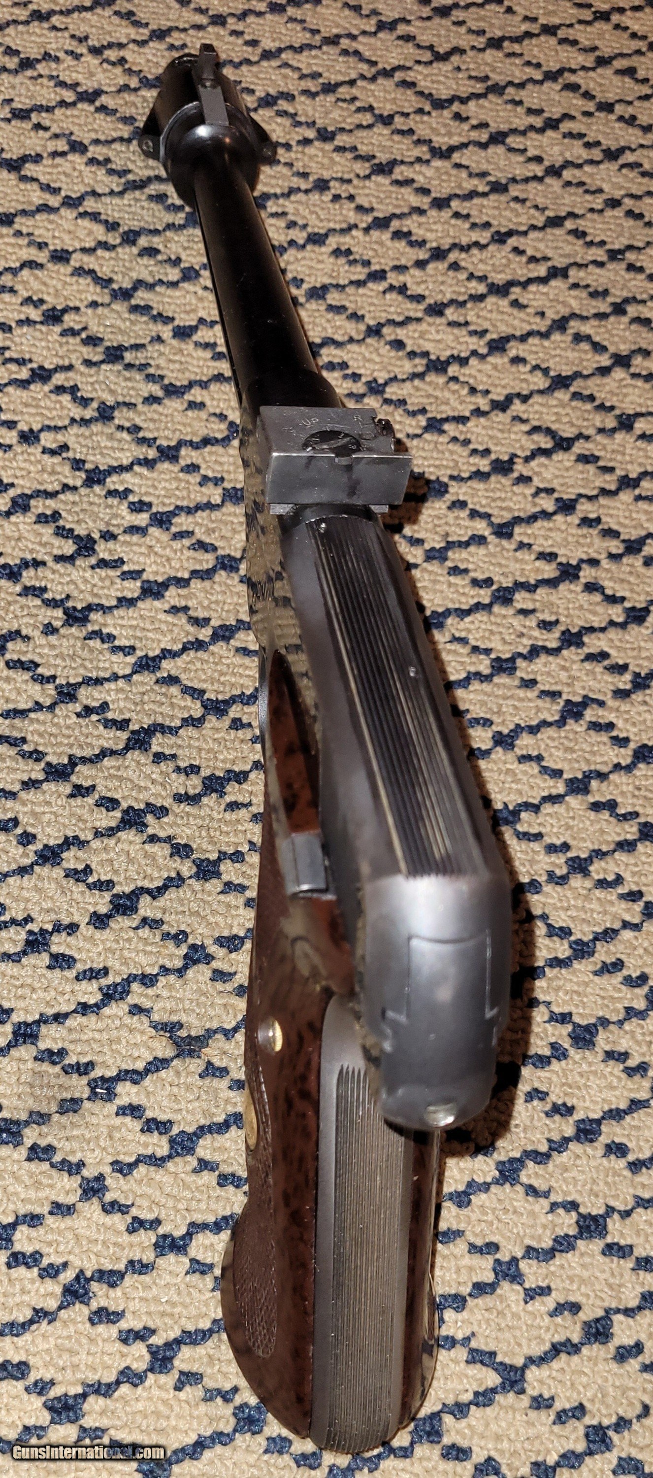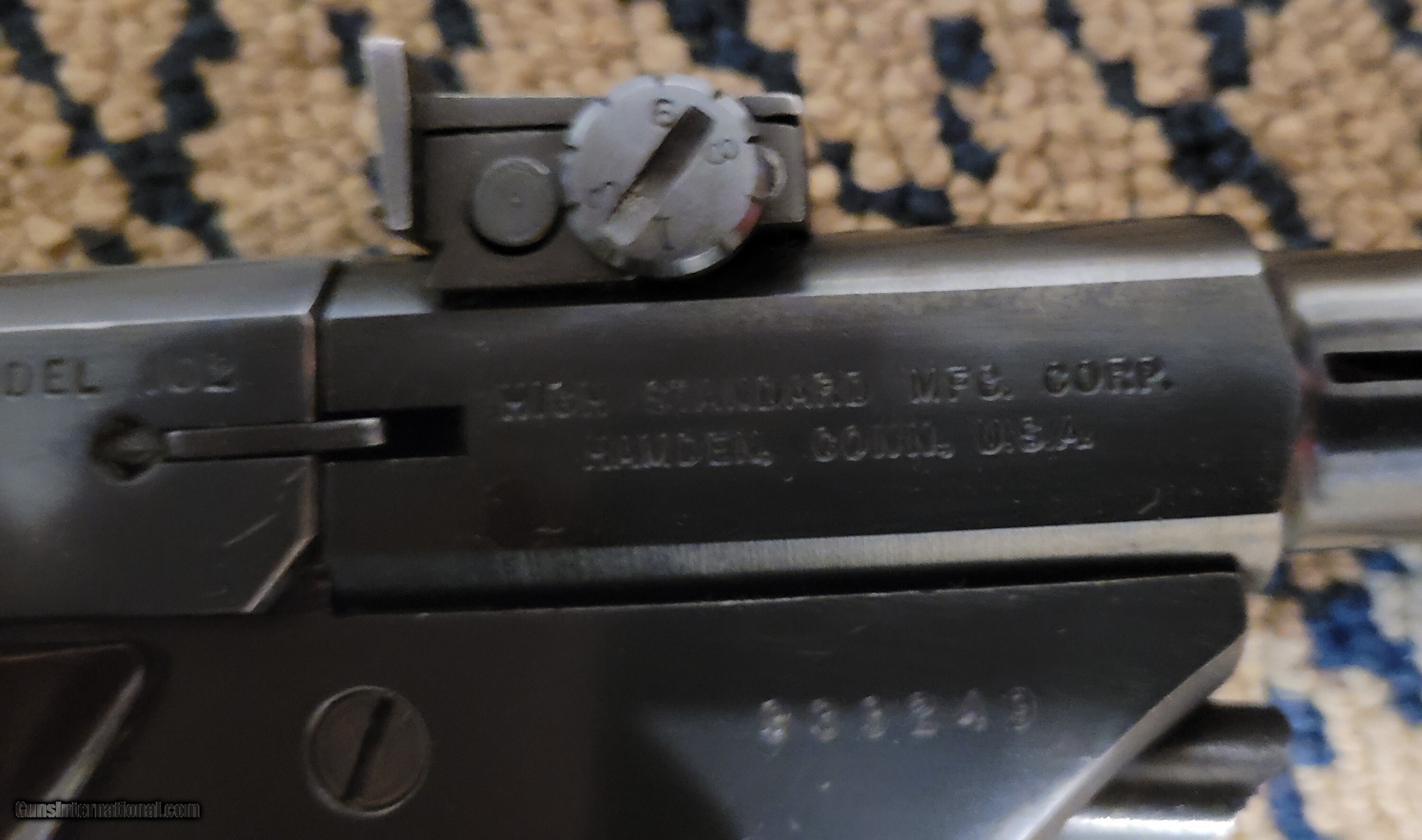 Description: A classic target competition pistol designed for accurate rapid fire shooting. This High Standard model 102 Citation in .22LR sports an unique 9 inch barrel with a muzzle flip counter weight and a vertically vented muzzle brake that improve rapid fire target reacquisition. The adjustable sights allow for very minor tweaks to achieve perfection. The secure cross-cut grips have an alternate angled thumb rest for a comfortable grip. Its unusual appearance earned it the nickname "Space gun". This firearm would make a fine addition to any collection of specialized pistols. Shipping and Insurance is a flat $45 to an FFL Dealer near you. If you do not have a preferred FFL, then I can help you find one near you that will accept the delivery and handle the transfer of ownership. If you have any questions about this firearm, call, text, or email me. I always enjoy talking with fellow shooting and hunting enthusiasts. Handgun Caliber: .22 Long Rifle Manufacturer: High Standard Model: 102 / Citation Serial Number: 939249 Barrel Length: 9 inch Condition: Excellent Metal Condition: Excellent Wood Condition: Excellent Bore Condition: Excellent Action: Semiautomatic Sights: Iron, adjustable Grips: Synthetic Price: $1,195.00 Contact Seller |